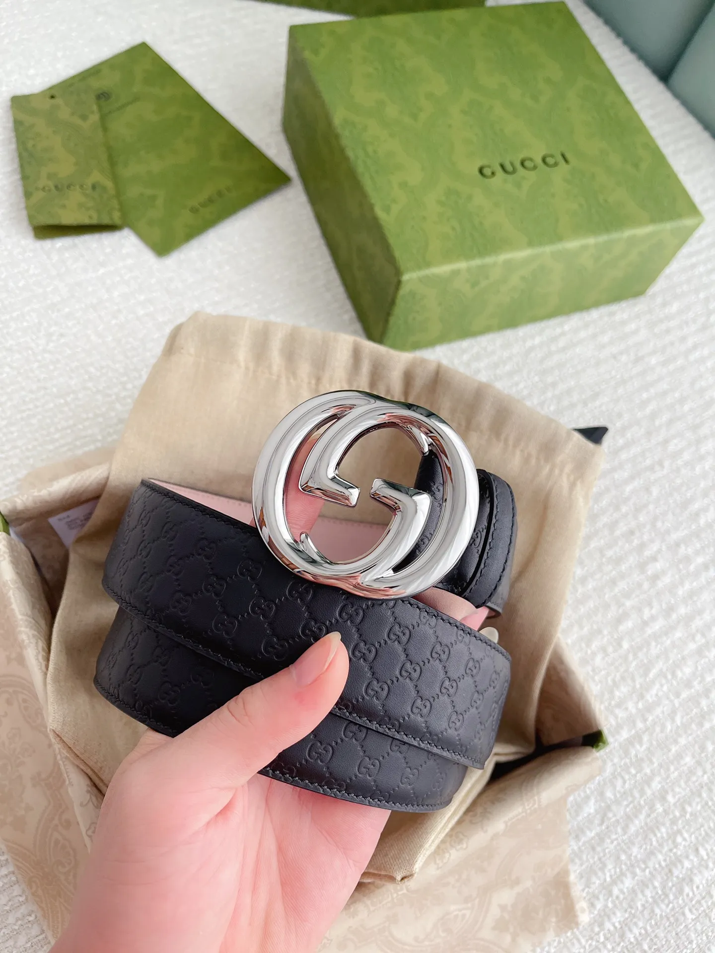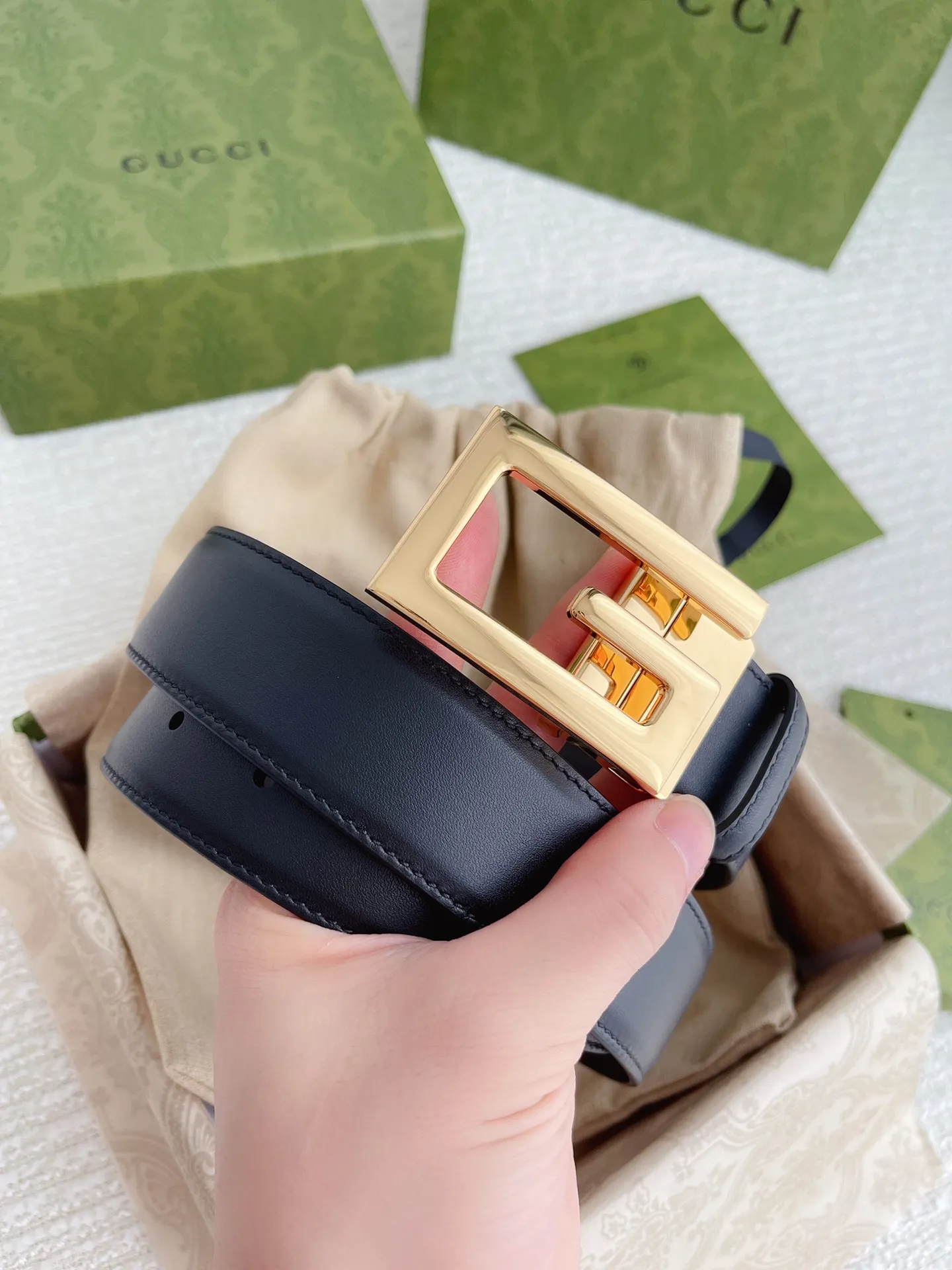 グッチ新作Gバックル黒レザーベルト3.5cm