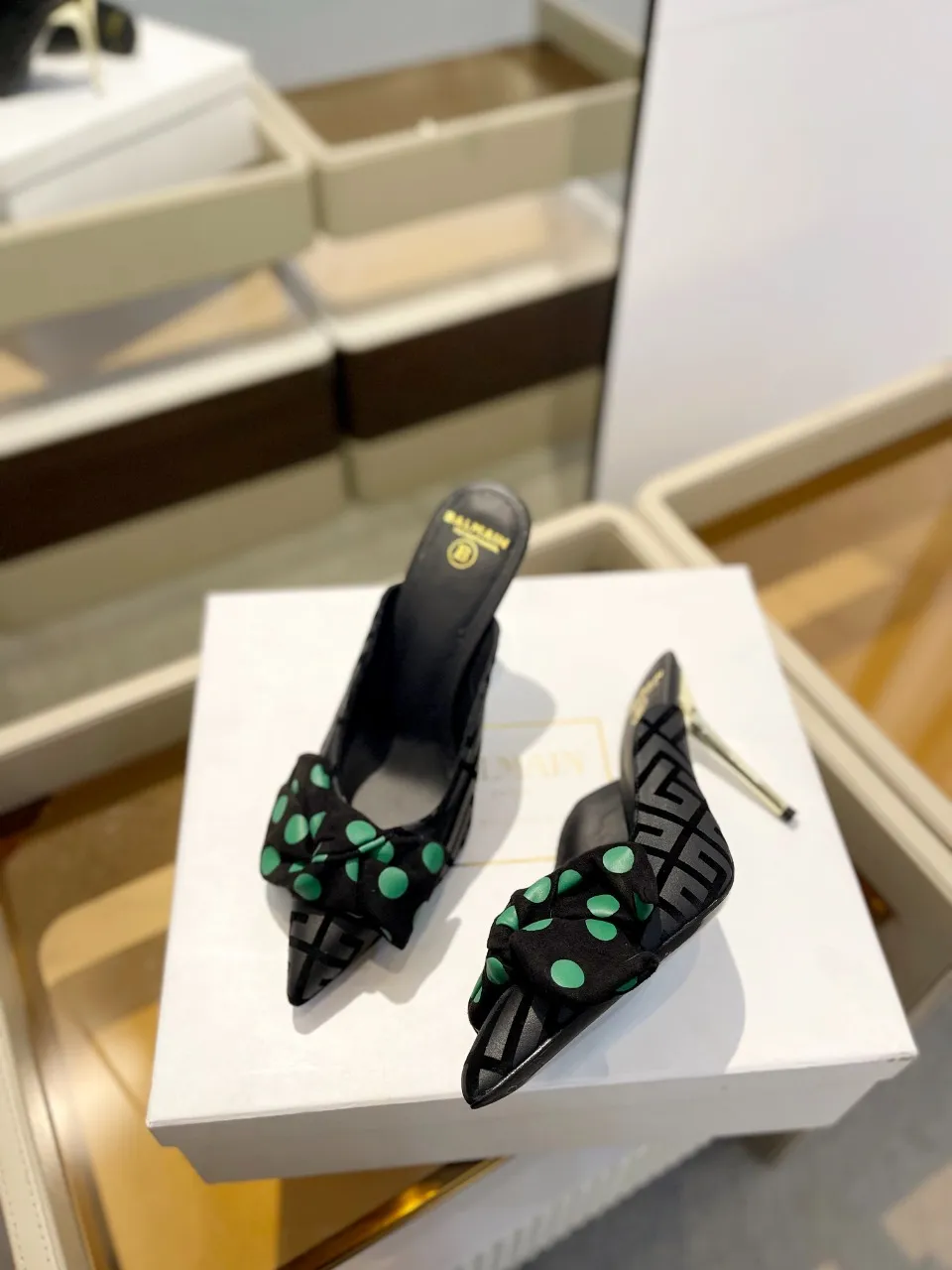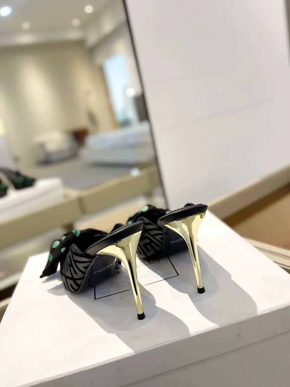 Balmain 2024春夏リボンハイヒールのスリッパ黒緑