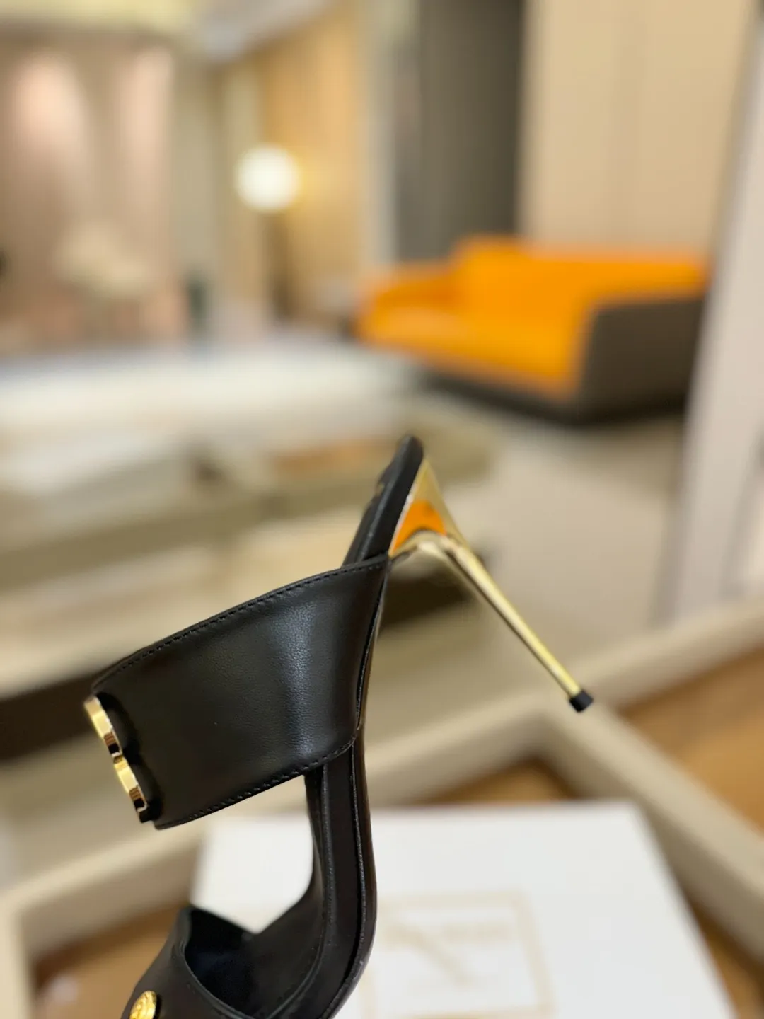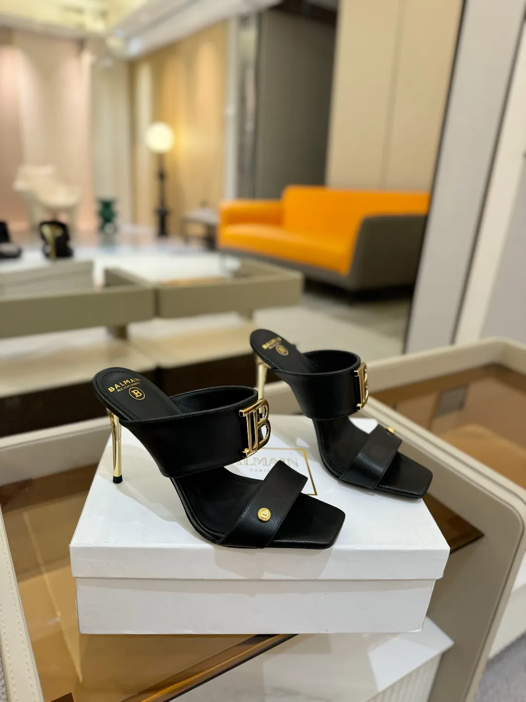 Balmain 2025春夏金属バックル黒ハイヒールのスリッパ