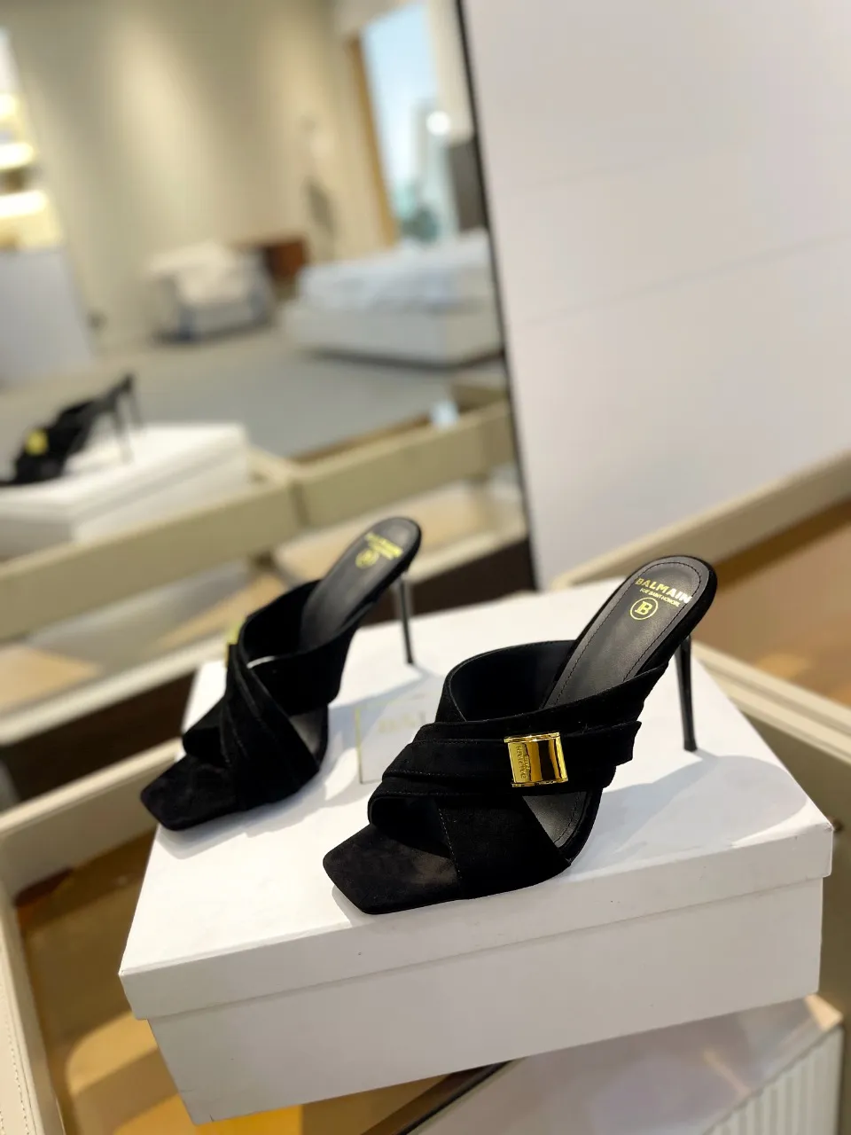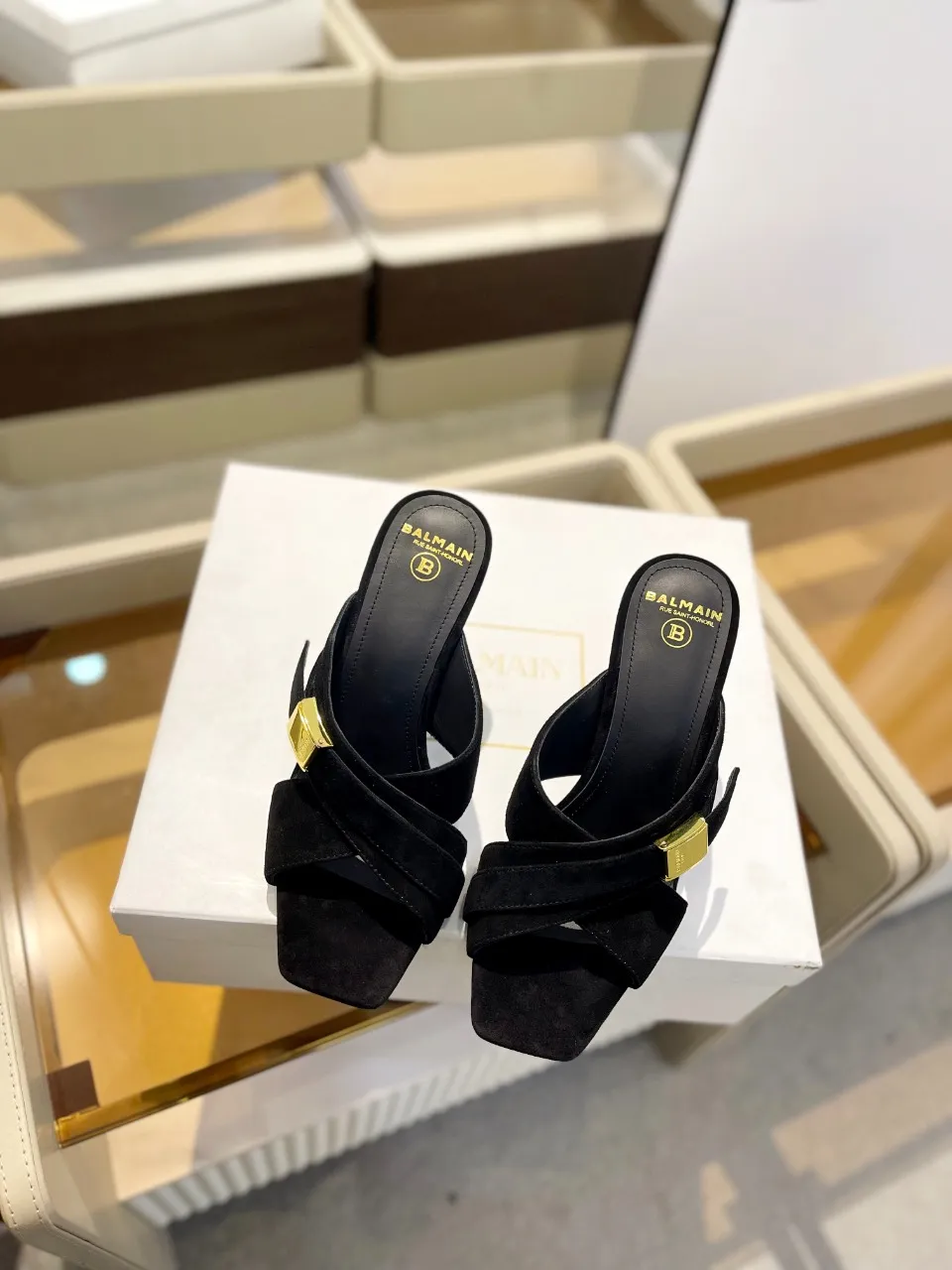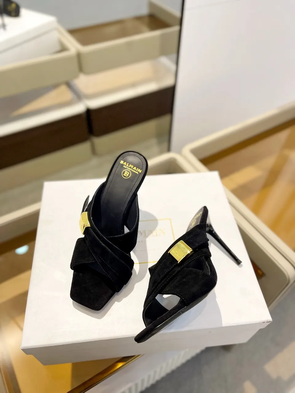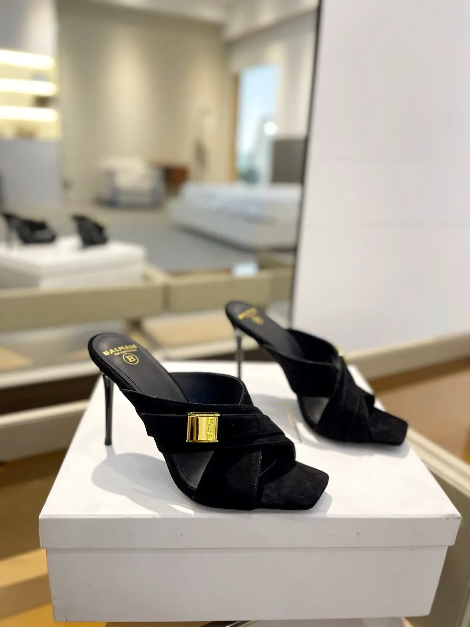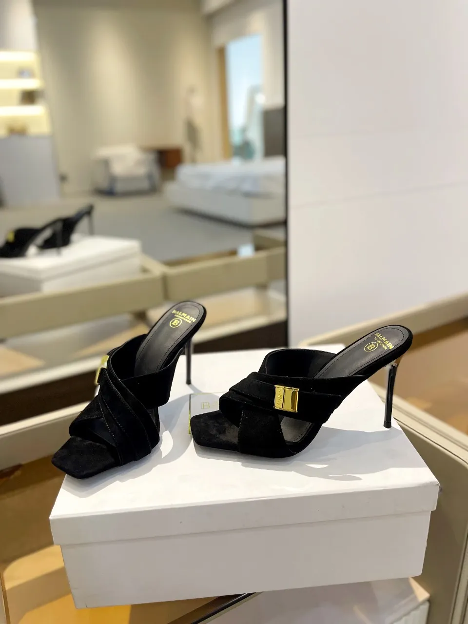 Balmainバレン2025春夏ニューアイテムベージュハイヒールのスクエアトゥサンダル