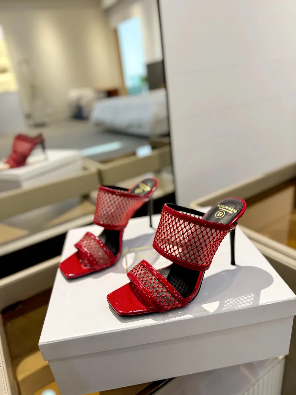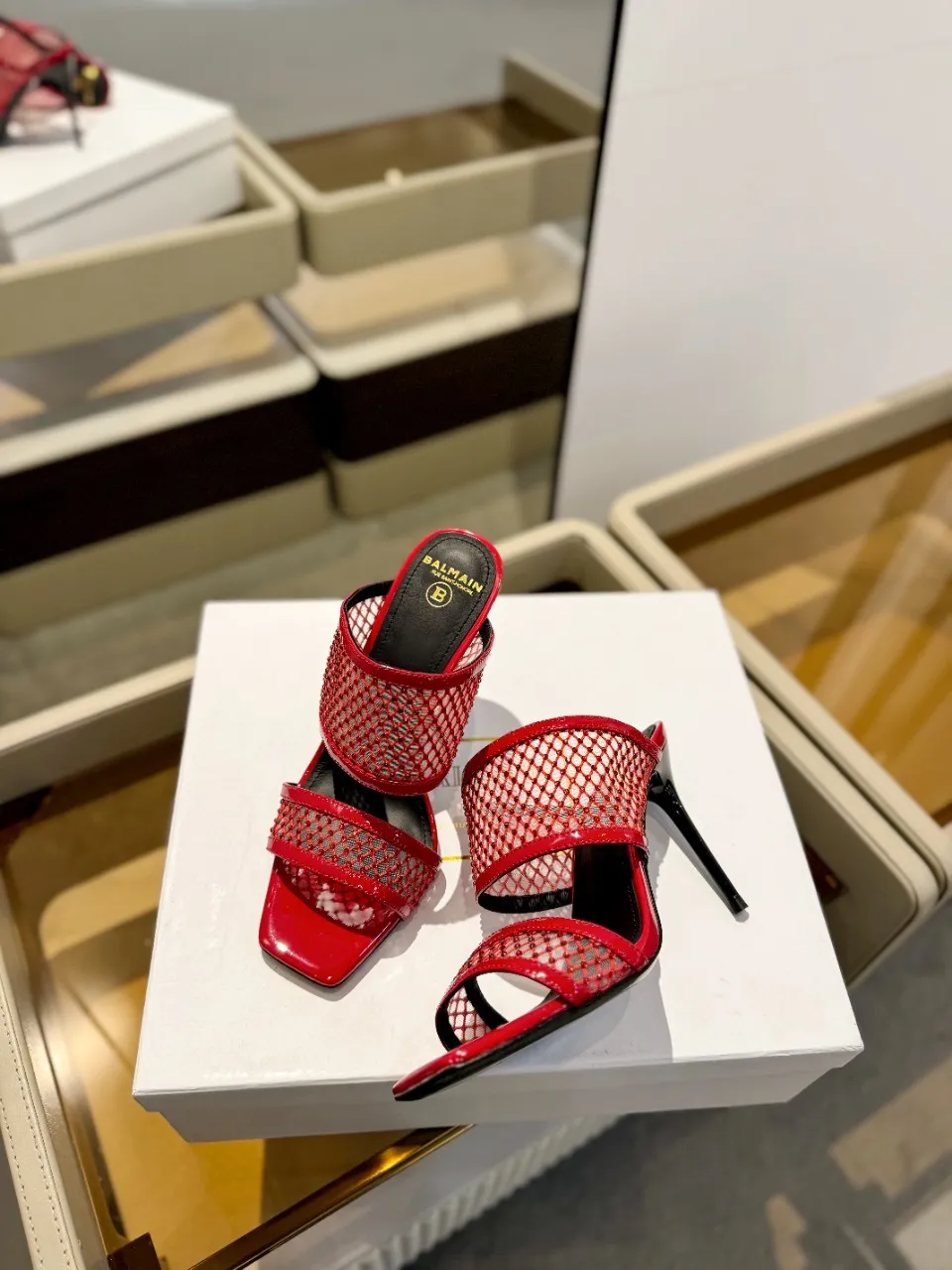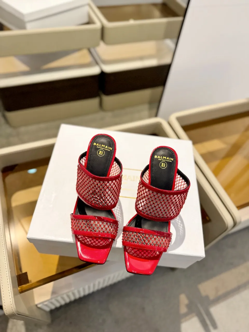 Balmain レッドメッシュクリスタルハイヒールスリッパ