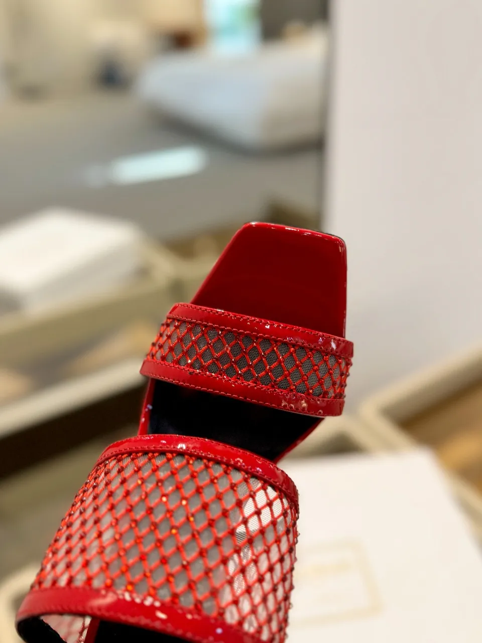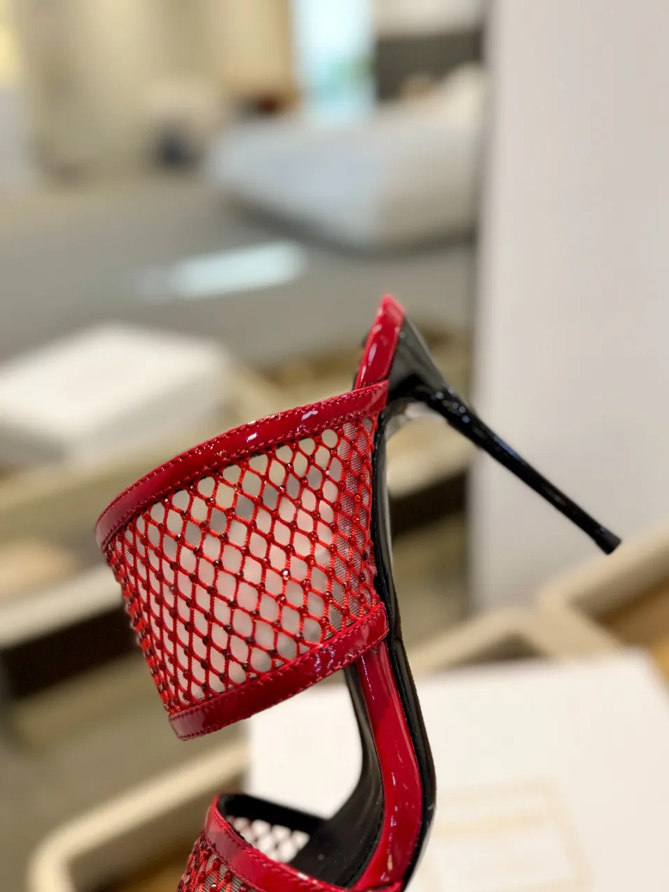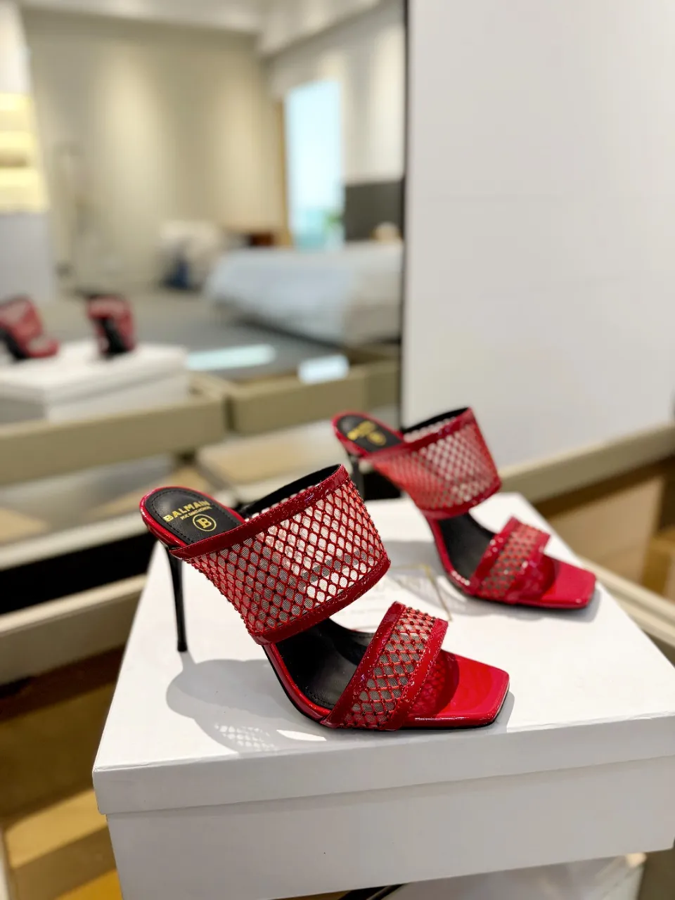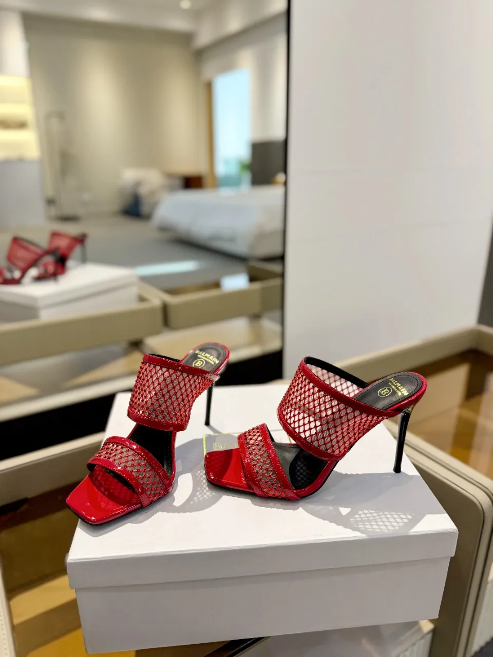 Balmain レッドメッシュクリスタルハイヒールスリッパ