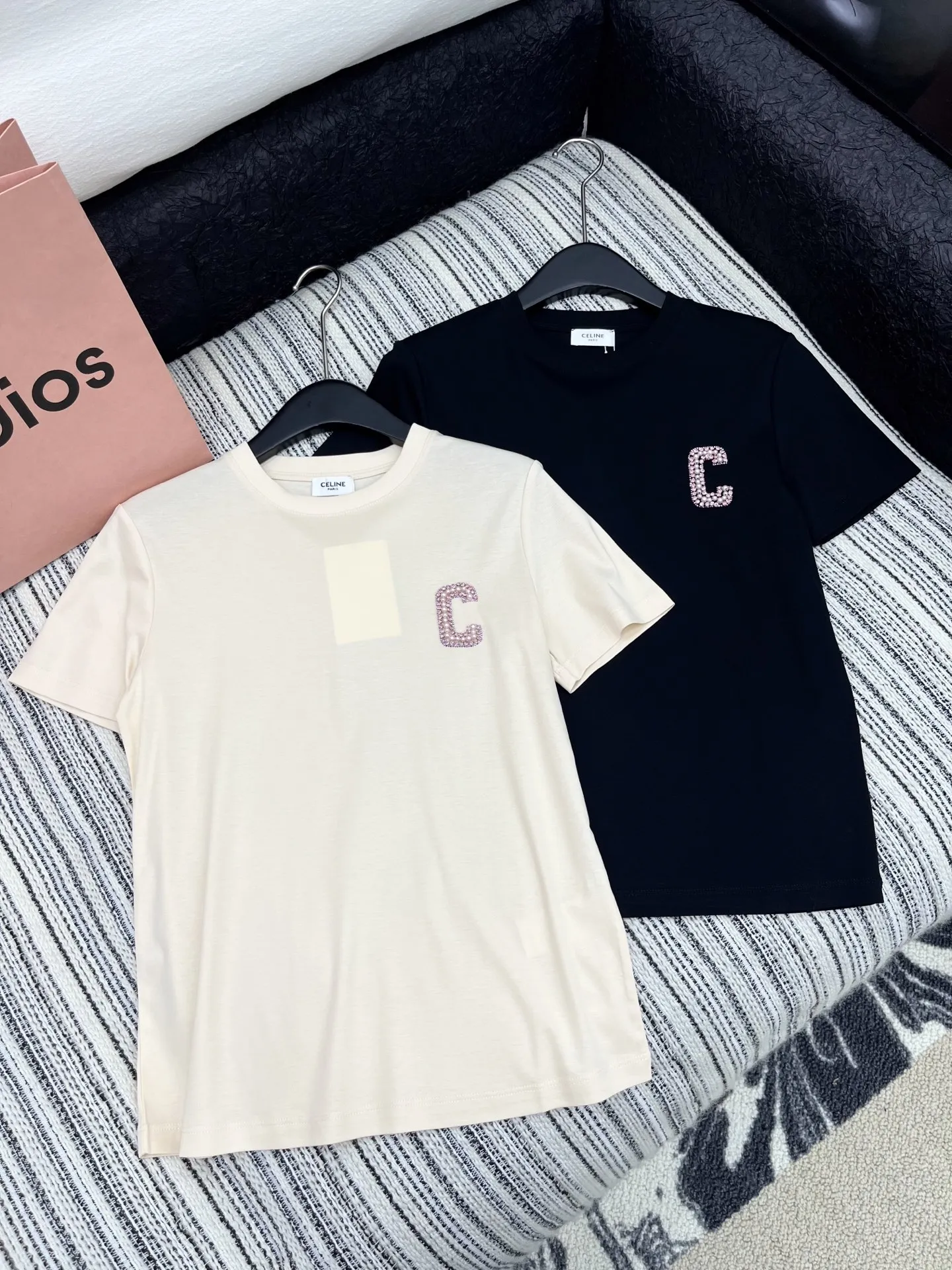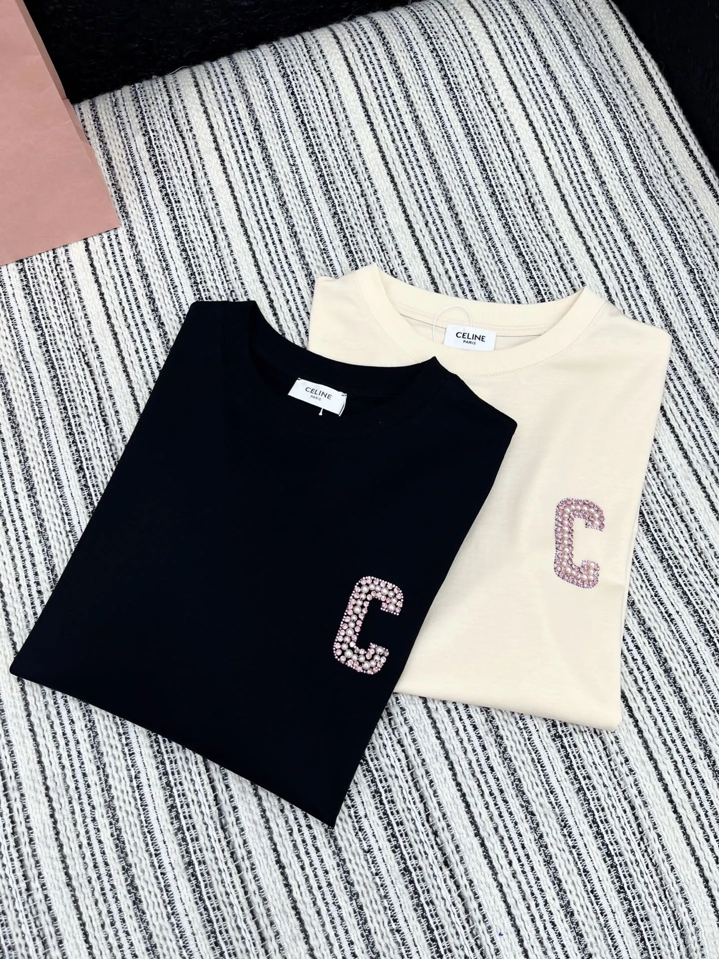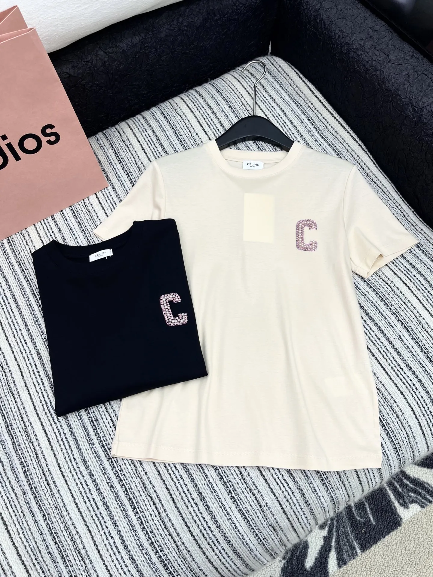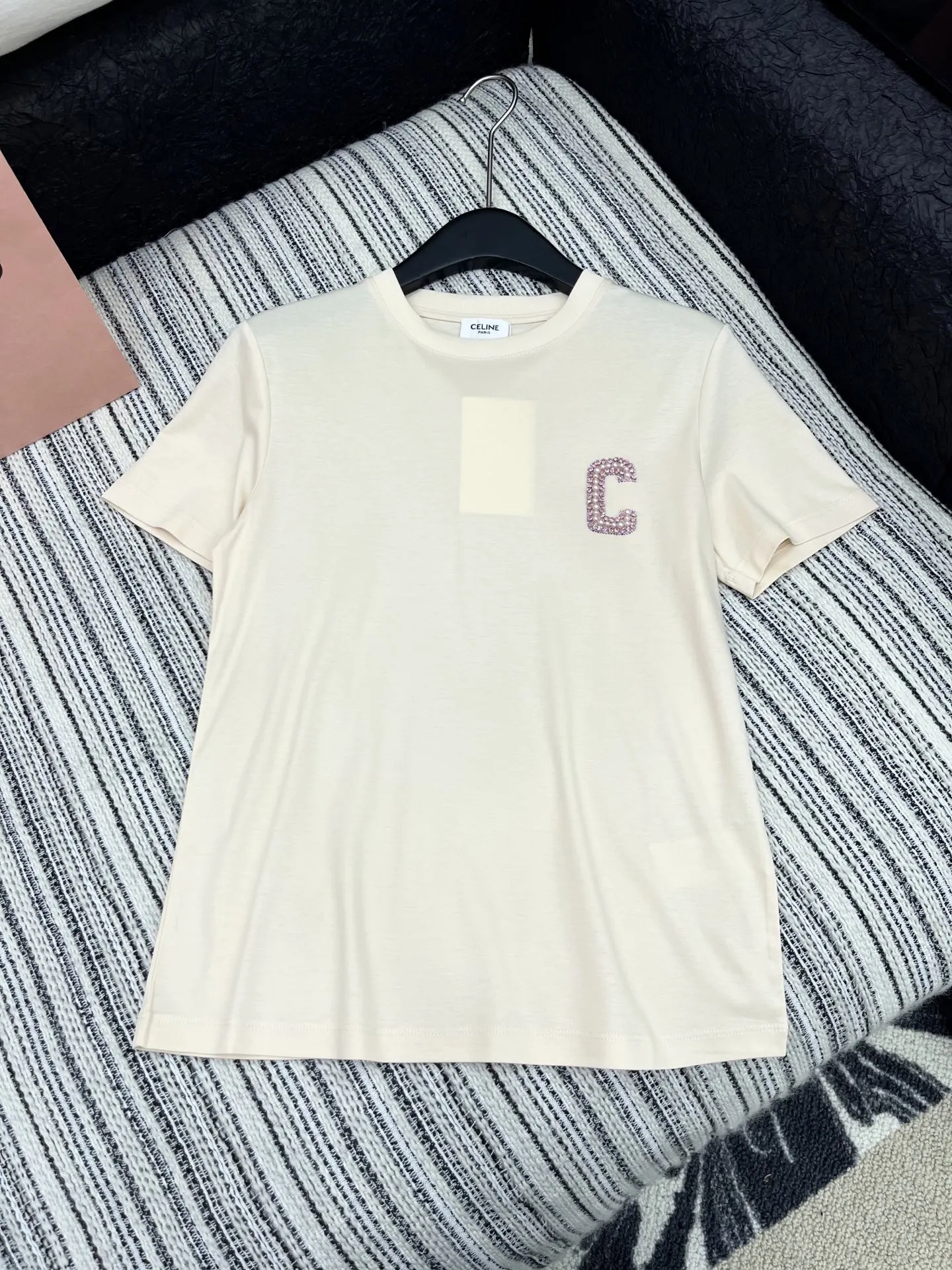 CELINE新作ピンク半袖Tシャツ刺繍デザイン
