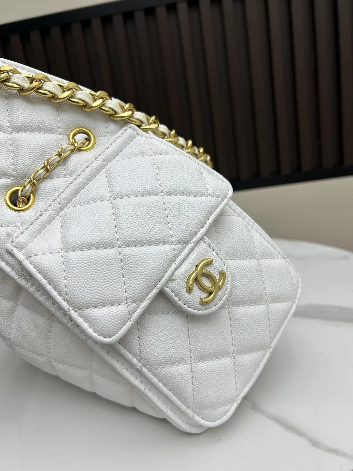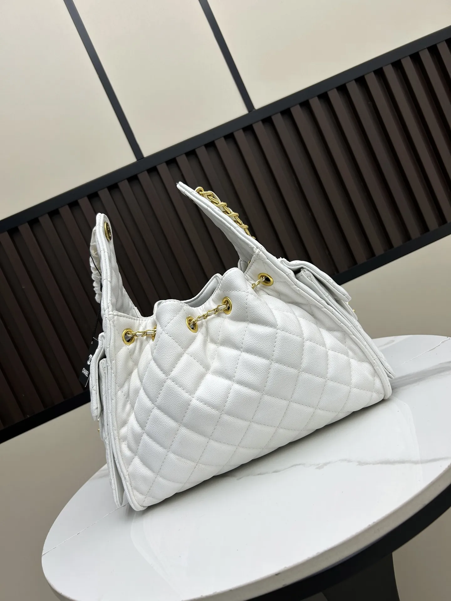 菱格子柄キルティング、皮革チェーン、ダブルCロックのブランドシグネチャー