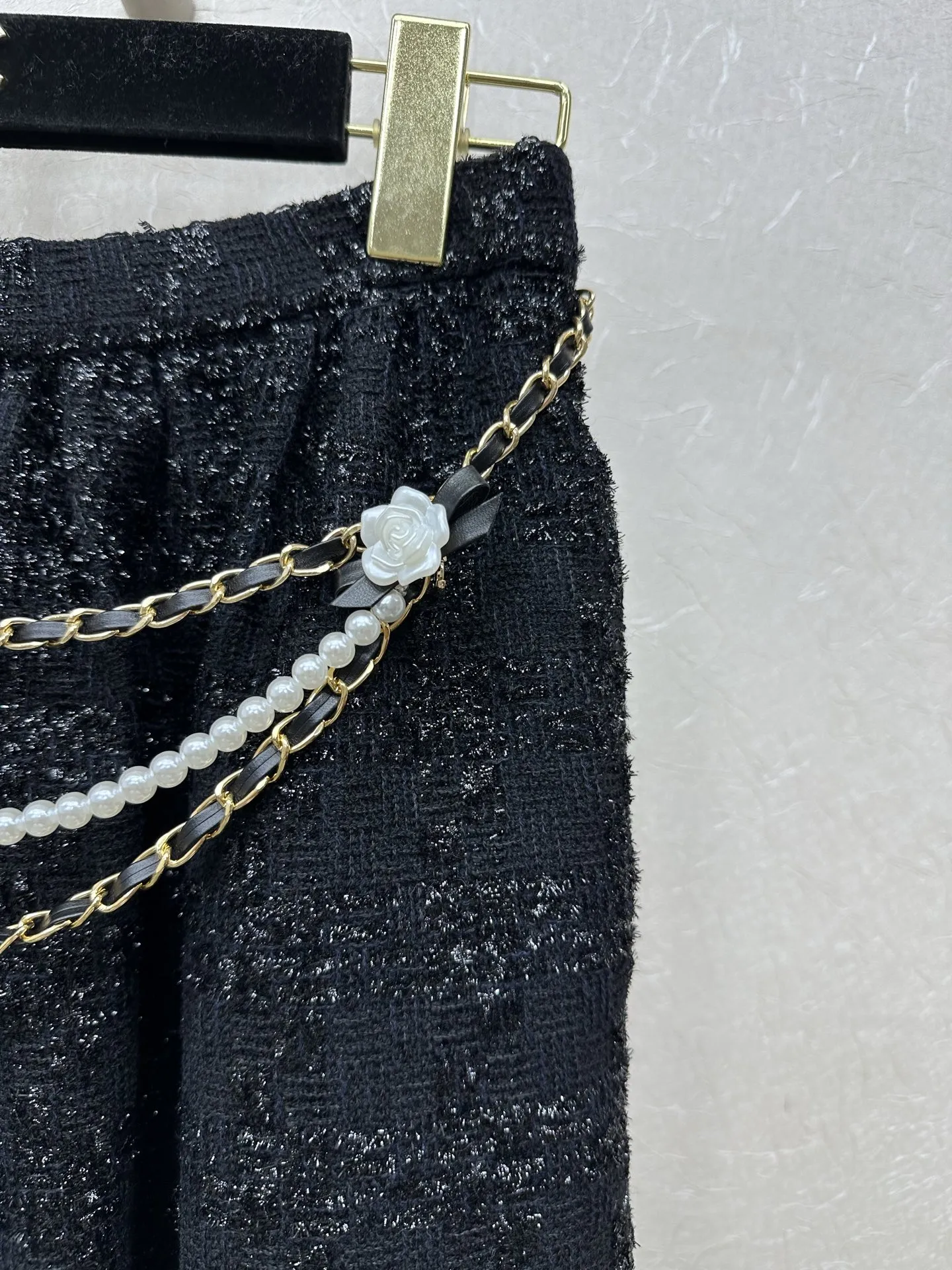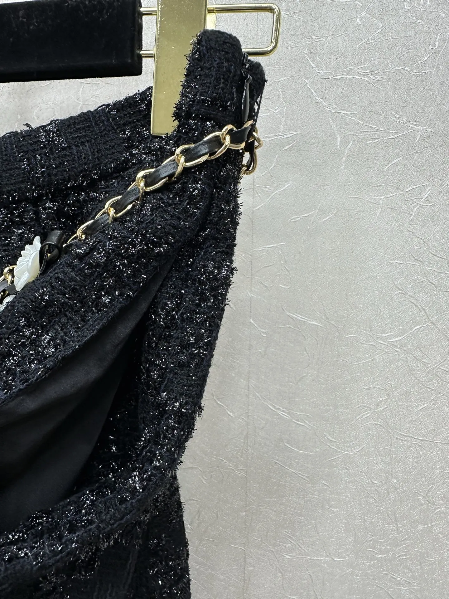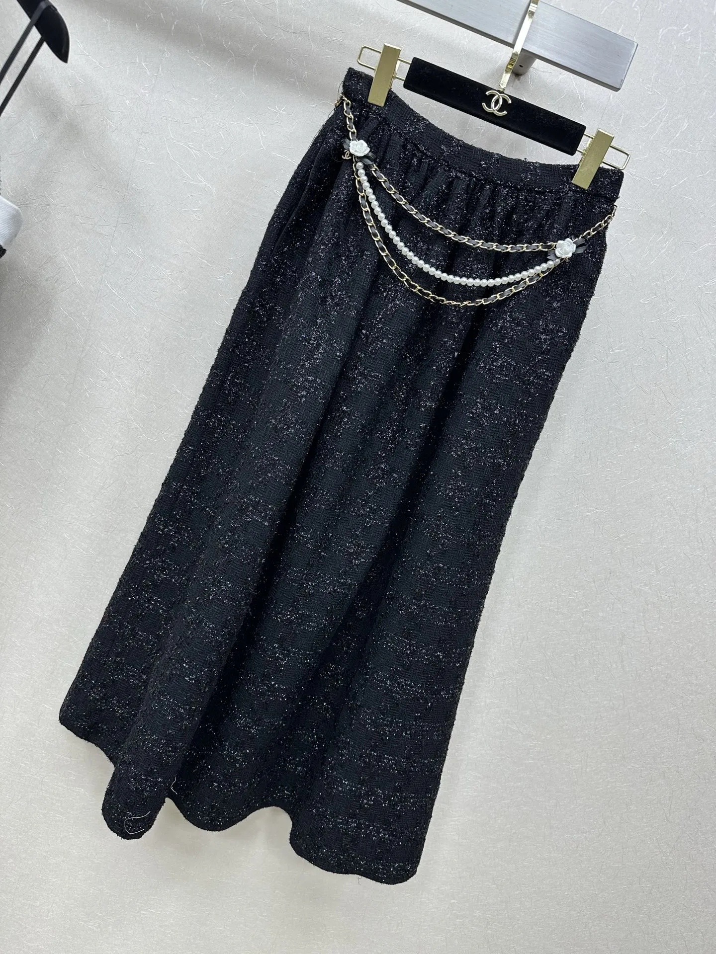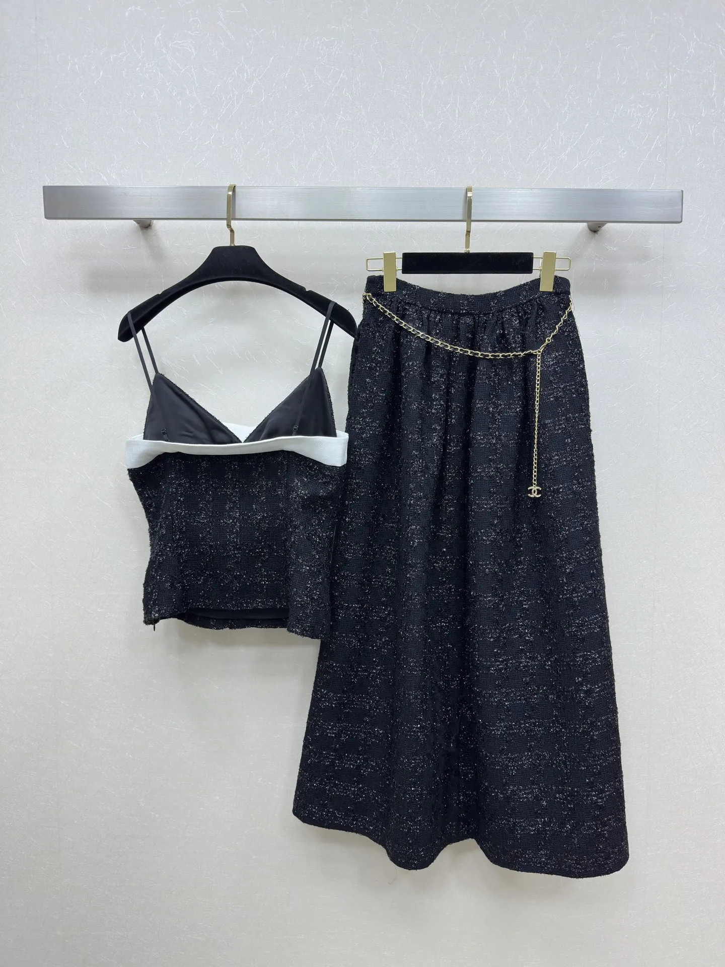 Chanel 25ssのブラックツイードセットアップは、吊りスカートと半スカートの組み合わせで、手作りのカメリアビーズとカスタムメイドの金具が特徴です。チェーンディテールのスカートがアクセントを加え、若々しくスリムに見せるデザインで、エレガントで洗練されたスタイルを演出します。日常から特別な場面まで幅広く対応できる一着です。類似品をお探しの方には、スーパーコピー優良サイトでのチェックもおすすめです。