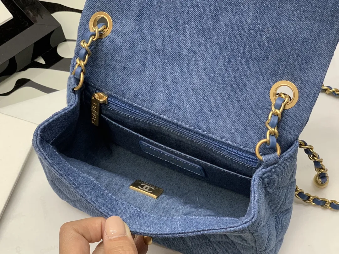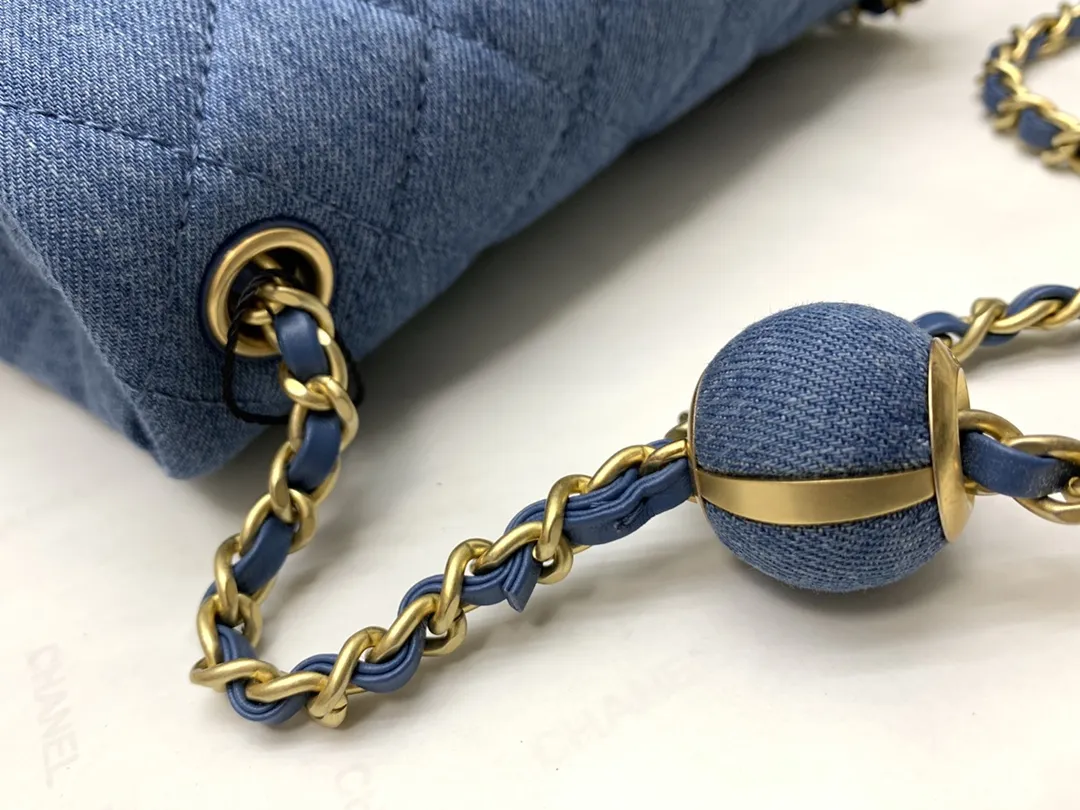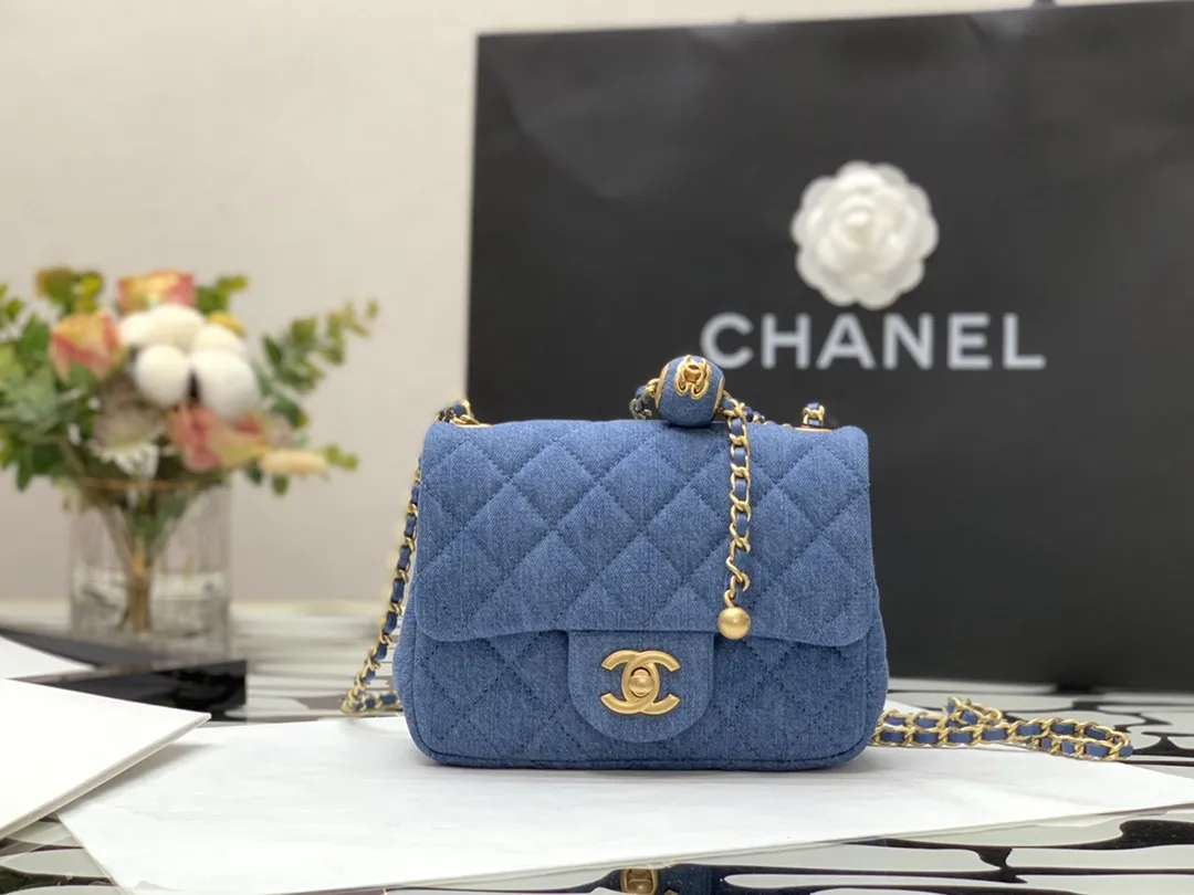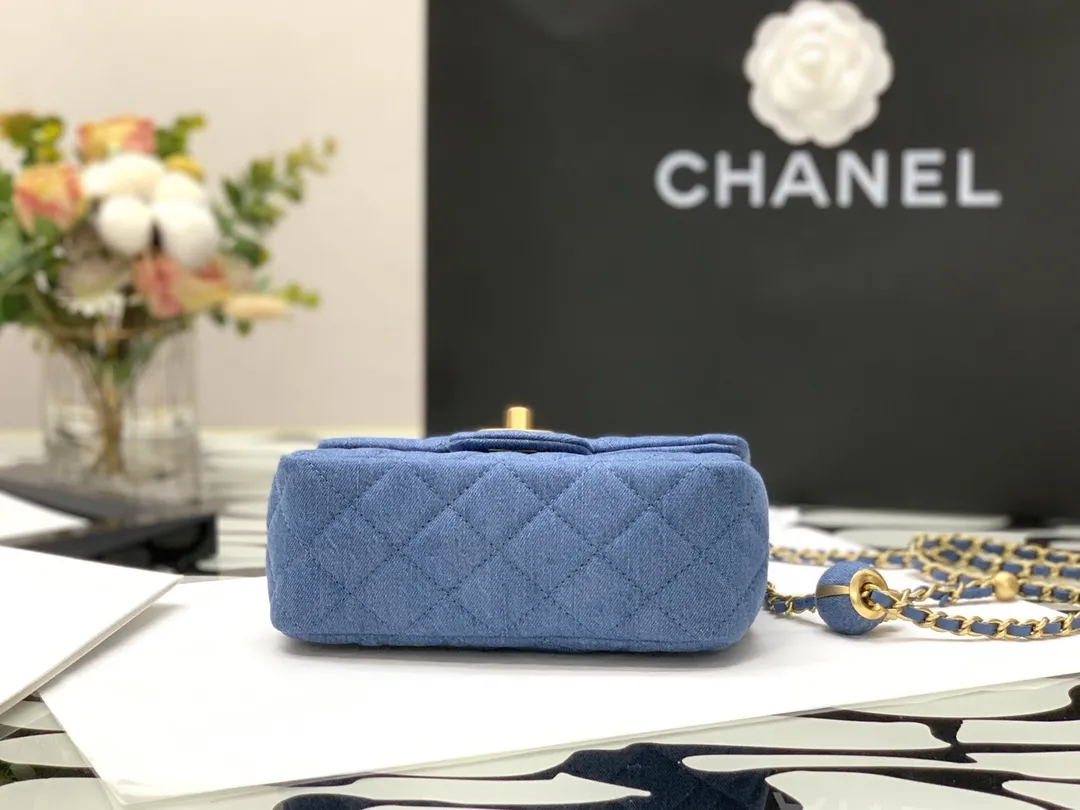 CHANELのブルーキルティングミニバッグは、深いブルーの丹宁牛仔素材を使用し、金色の金属球チェーンがアクセント。サイズは17cmで、ストラップは調節可能。高級感あふれるデザインで、ファッショナブルなスタイリングにぴったり。東京のトレンドセッターに人気の逸品で、N級品としても注目されています。