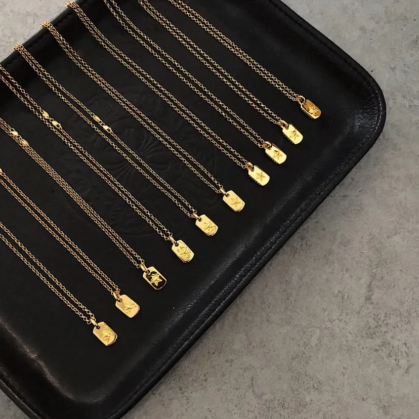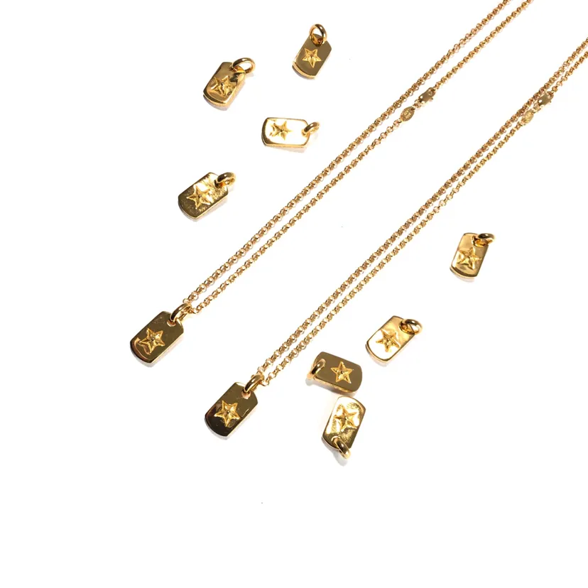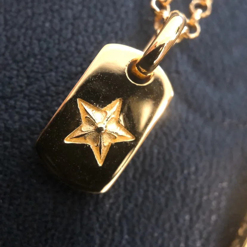 Chrome Heartsのゴールド五角星ネックレスは、純銀をベースに22K金メッキを施した高品質なアイテムです。細部までこだわった刻印加工が特徴で、他の商品よりも長持ちする色保ちが魅力です。チェーンの長さは55cmまたは65cmで、22K真金でのカスタムオーダーも可能です。市場には偽物も出回っているため、公式デザインの正規品を選ぶことが重要です。