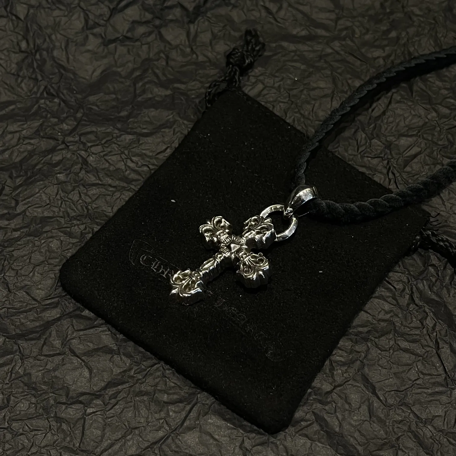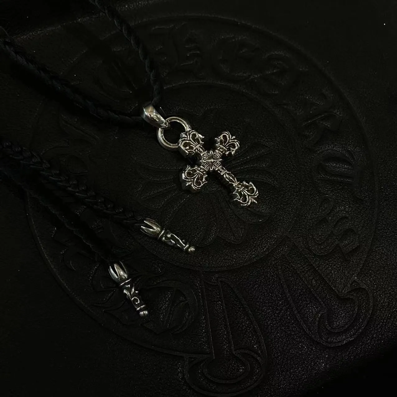 Chrome Hearts クロムハーツ 黒 皮紐編み十字架ネックレス