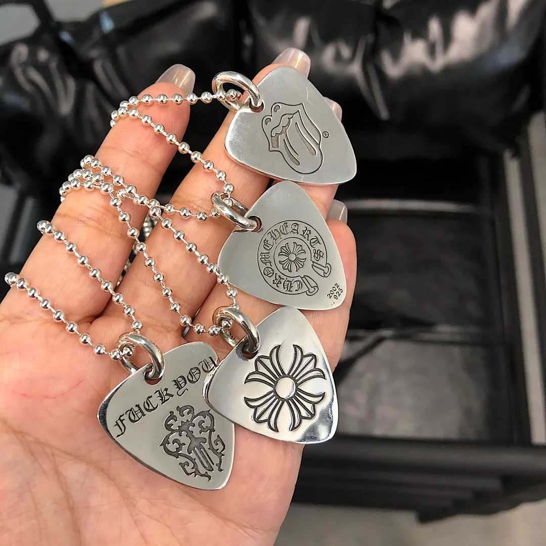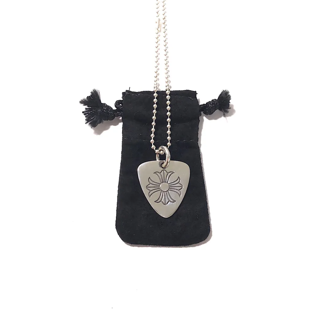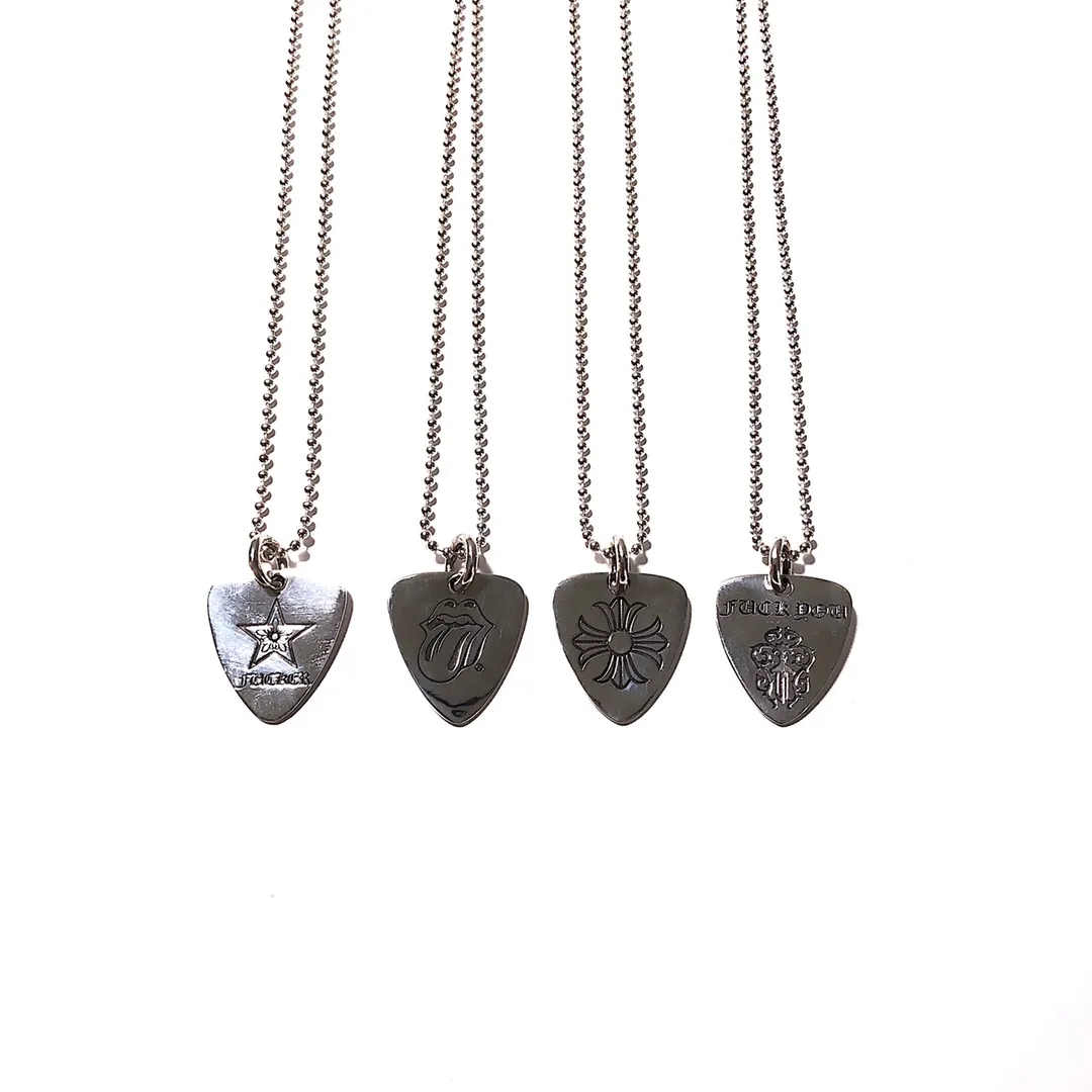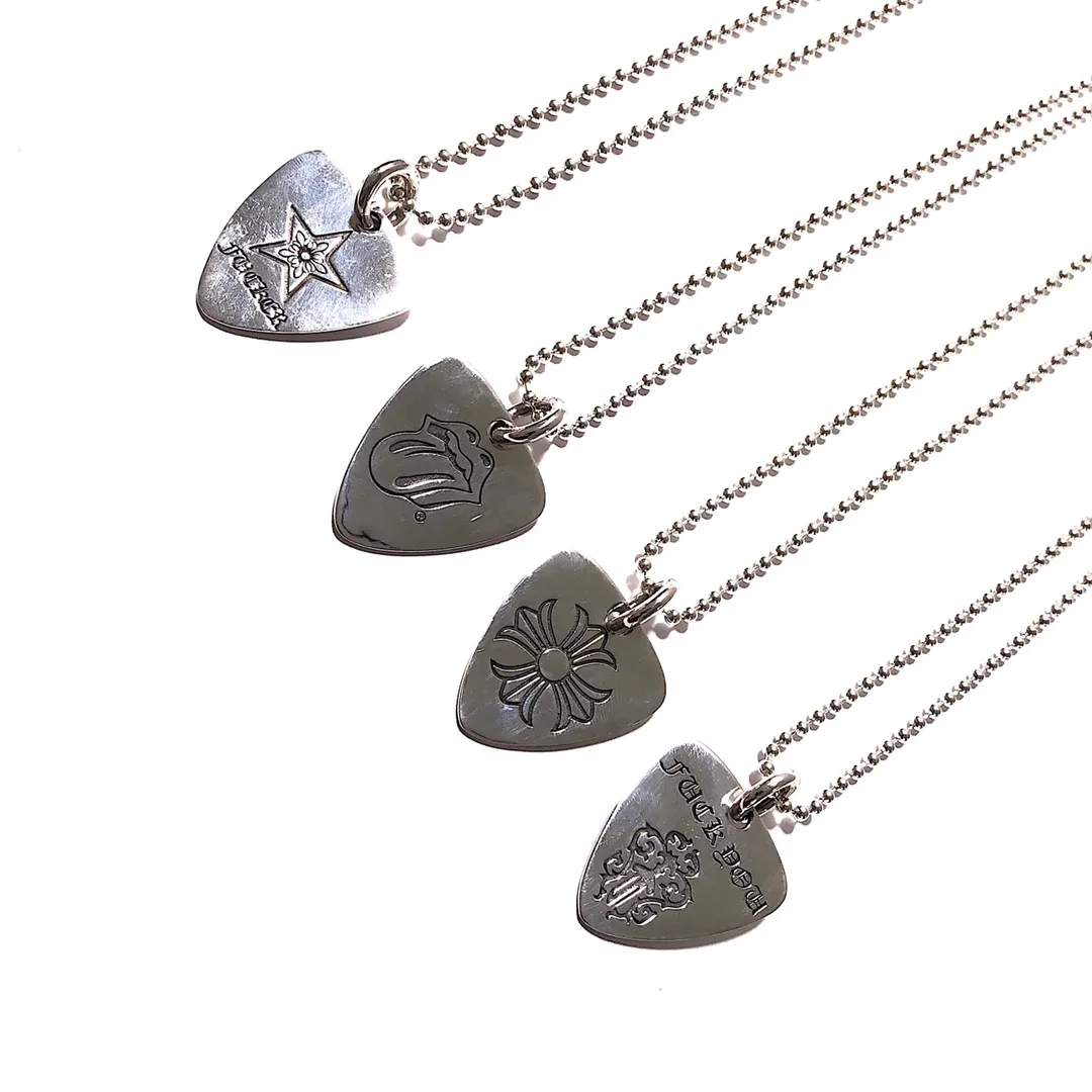 新品上架のChrome Hearts ギターピックネックレスです。シルバー製で、ギターピックのデザインが特徴的。五角星、舌頭、十字花、宝剣の4種類から選べます。丸珠チェーンが付いており、シンプルながらも細部にこだわったデザインが魅力。ギター好きの方にもおすすめです。市場には多くの偽物が出回っているため、正規品を選ぶことが重要です。