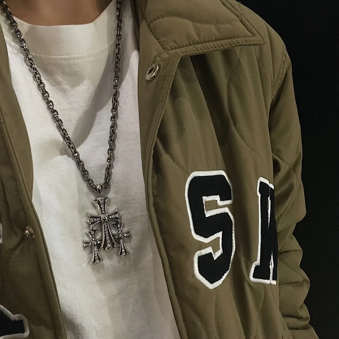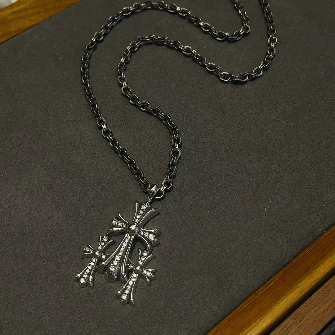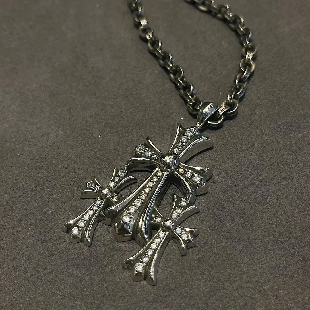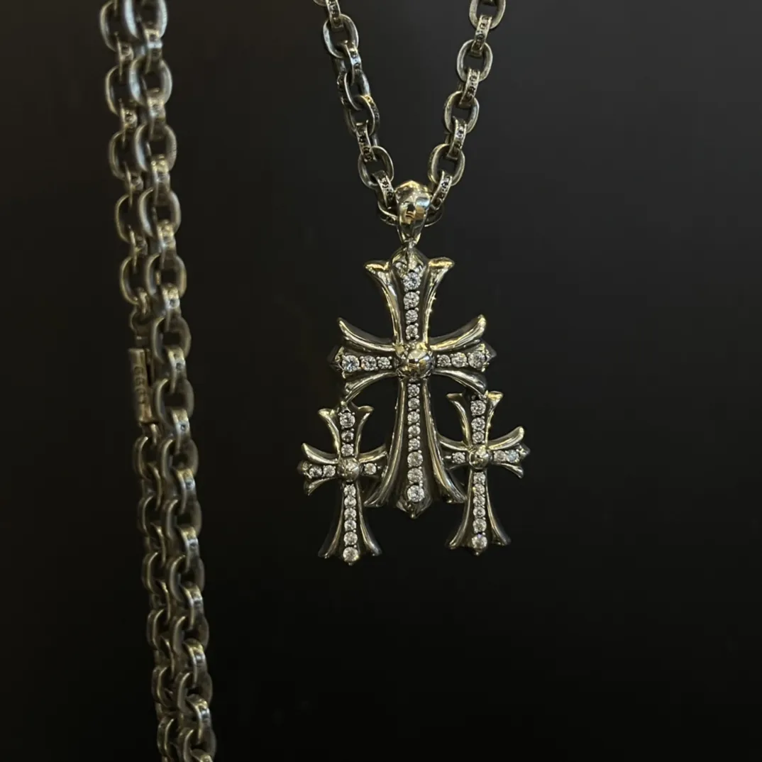 Chrome Heartsのシルバーネックレスは、石付きのクロスデザインが特徴的です。レイヤードデザインで、ヴィンテージ風の仕上げが施され、ゴシックスタイルを体現しています。高品質なシルバー素材を使用し、存在感のあるアクセサリーです。市場には偽物も出回っているため、購入時には正規品を見極めることが重要です。