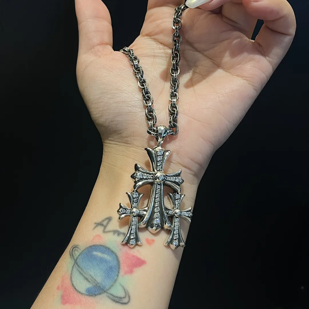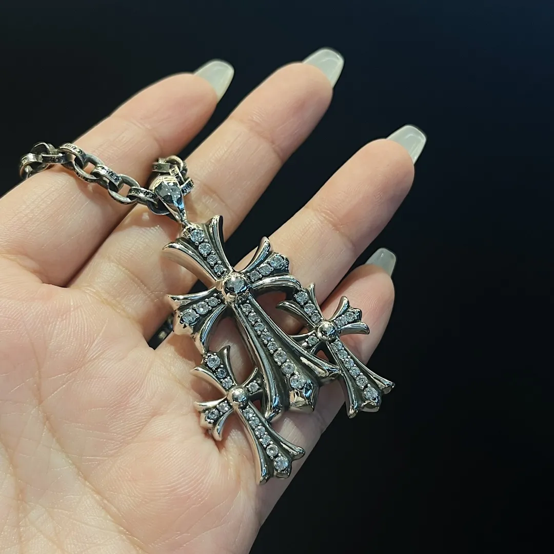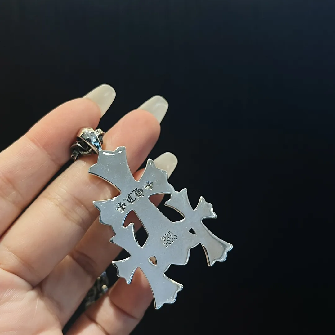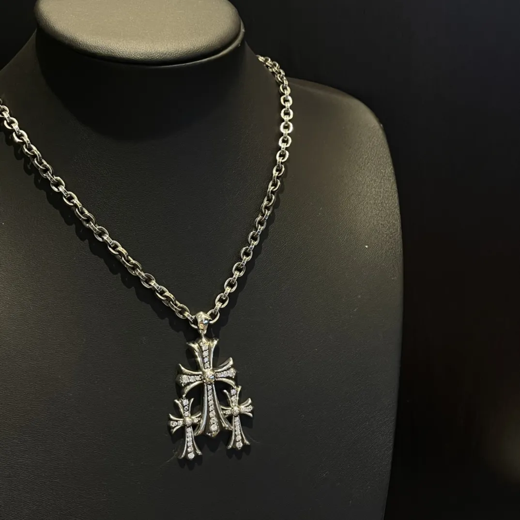 Chrome Heartsのシルバーネックレスは、石付きのクロスデザインが特徴的です。レイヤードデザインで、ヴィンテージ風の仕上げが施され、ゴシックスタイルを体現しています。高品質なシルバー素材を使用し、存在感のあるアクセサリーです。市場には偽物も出回っているため、購入時には正規品を見極めることが重要です。