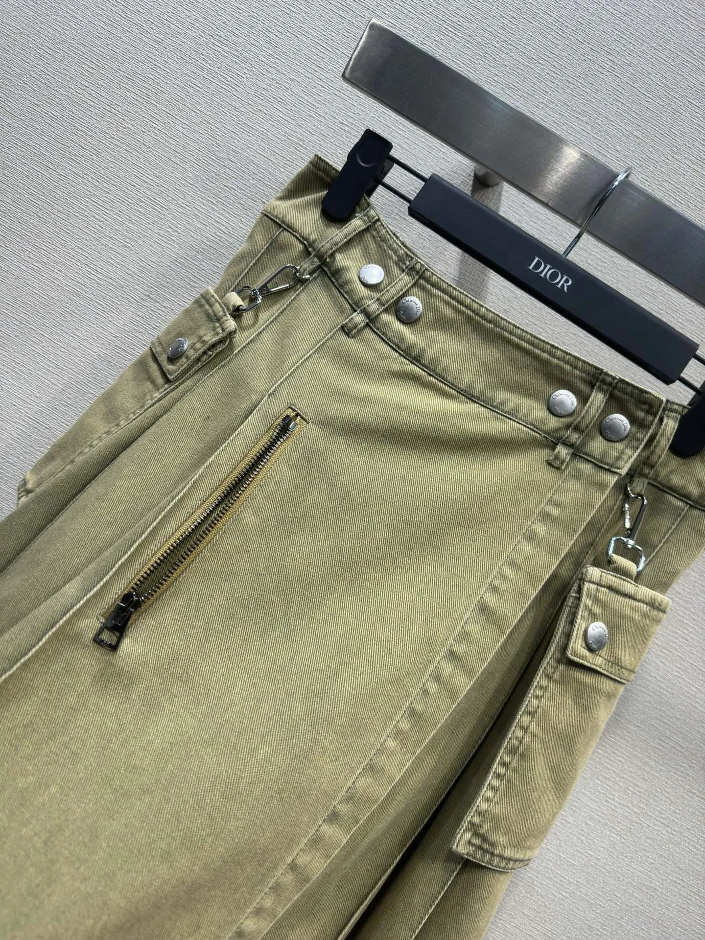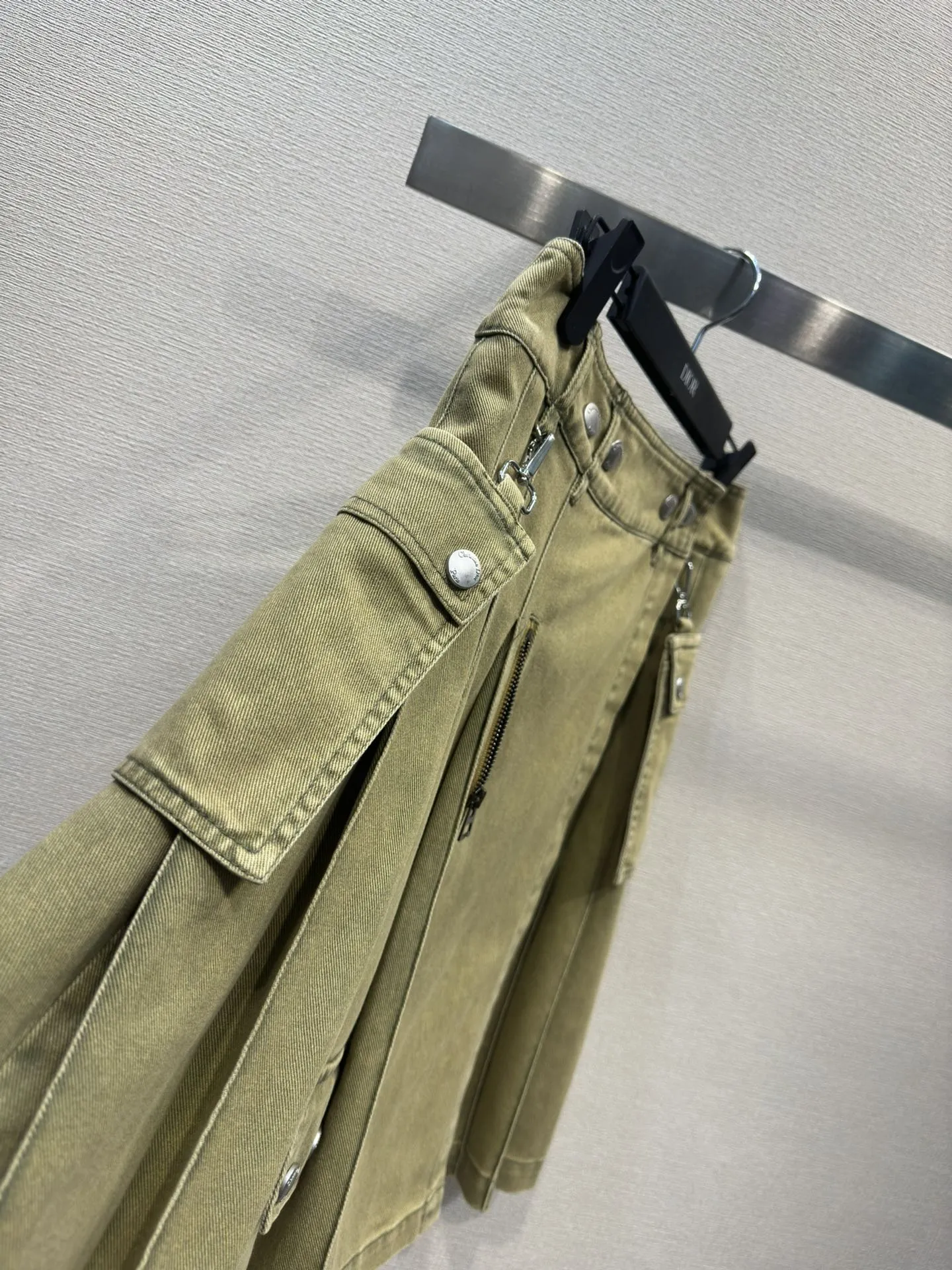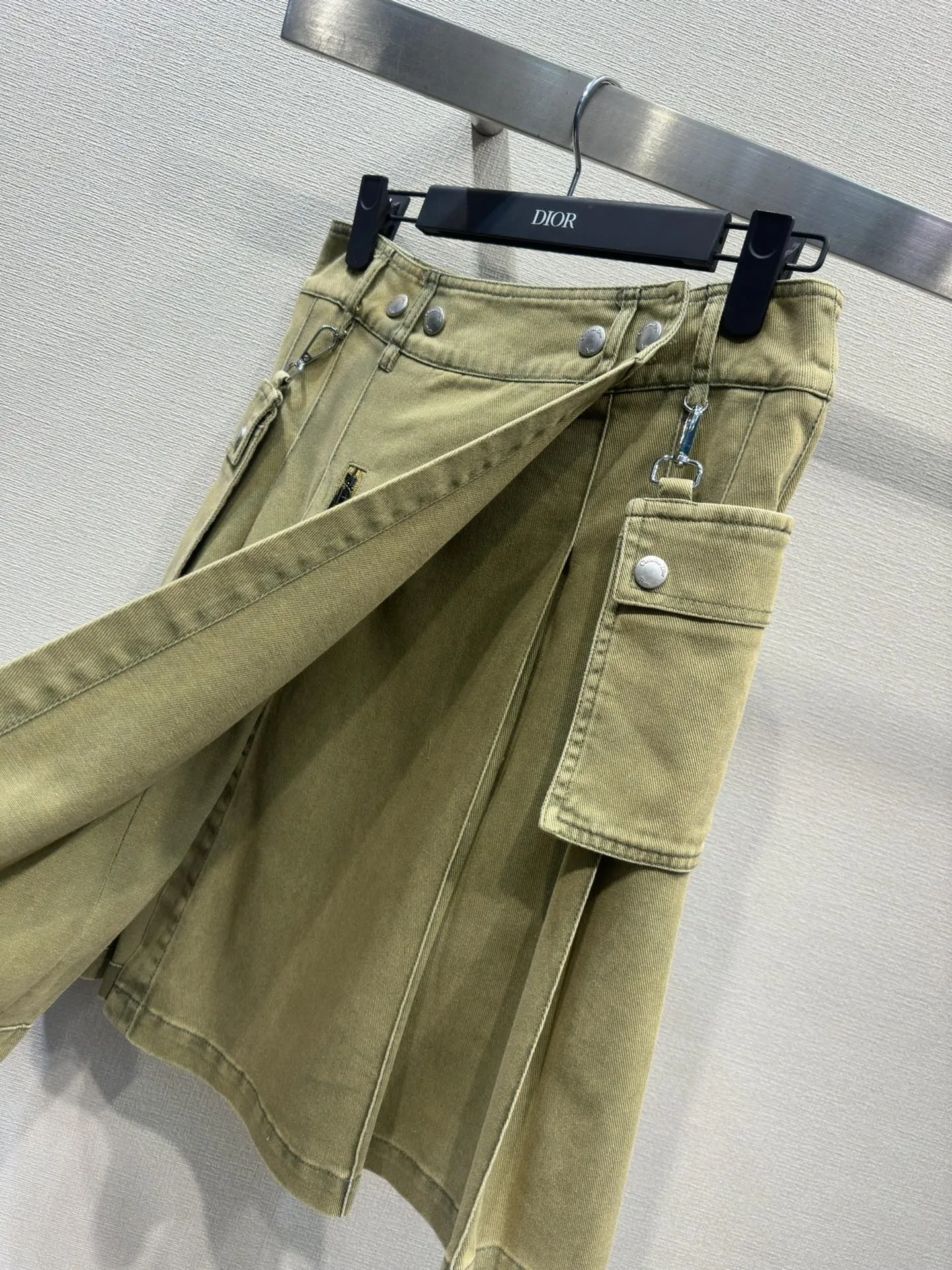 Dio2025の夏季新作、オリーブグリーンのデニムハーフスカートです。重工のスカートデザインが特徴で、ウエストには四合扣が装飾されています。半囲式の複雑なカッティングが施され、取り外し可能なサイドポケットが付いています。カスタム刻印ロゴのハードウェアが高級感を演出します。S、M、Lの3サイズ展開で、スーパーコピー優良サイトとしても注目されるデザイン性を兼ね備えています。