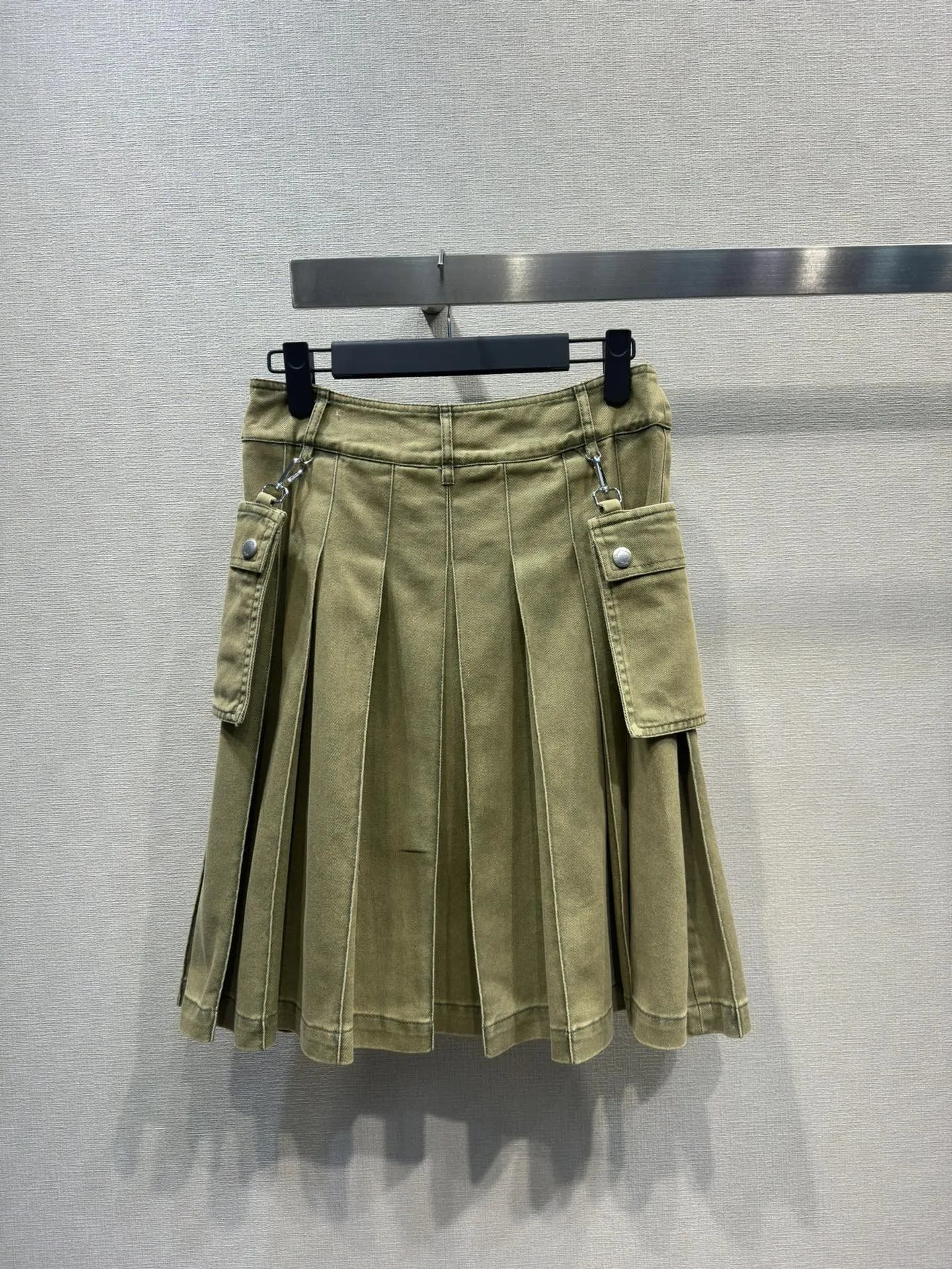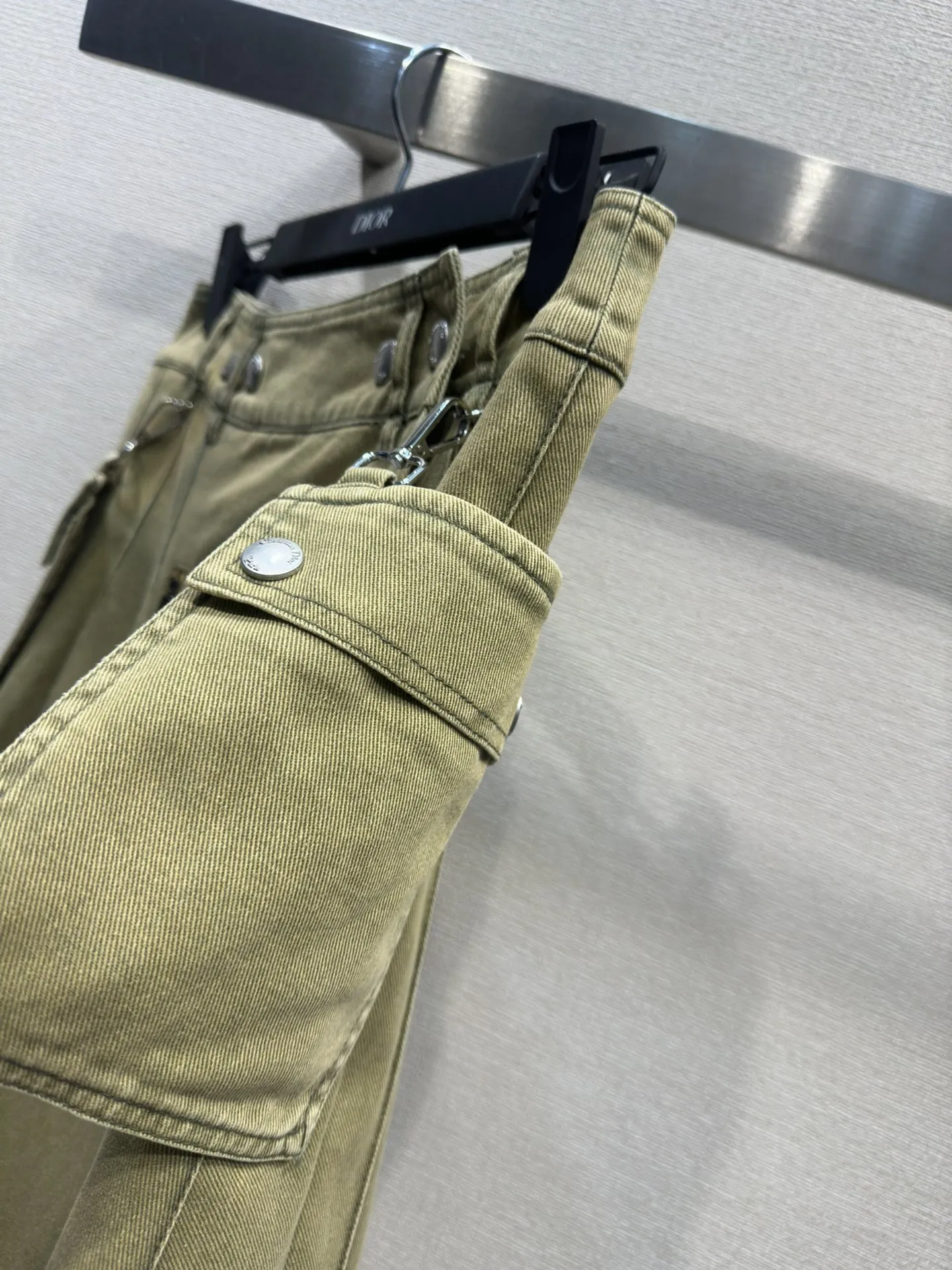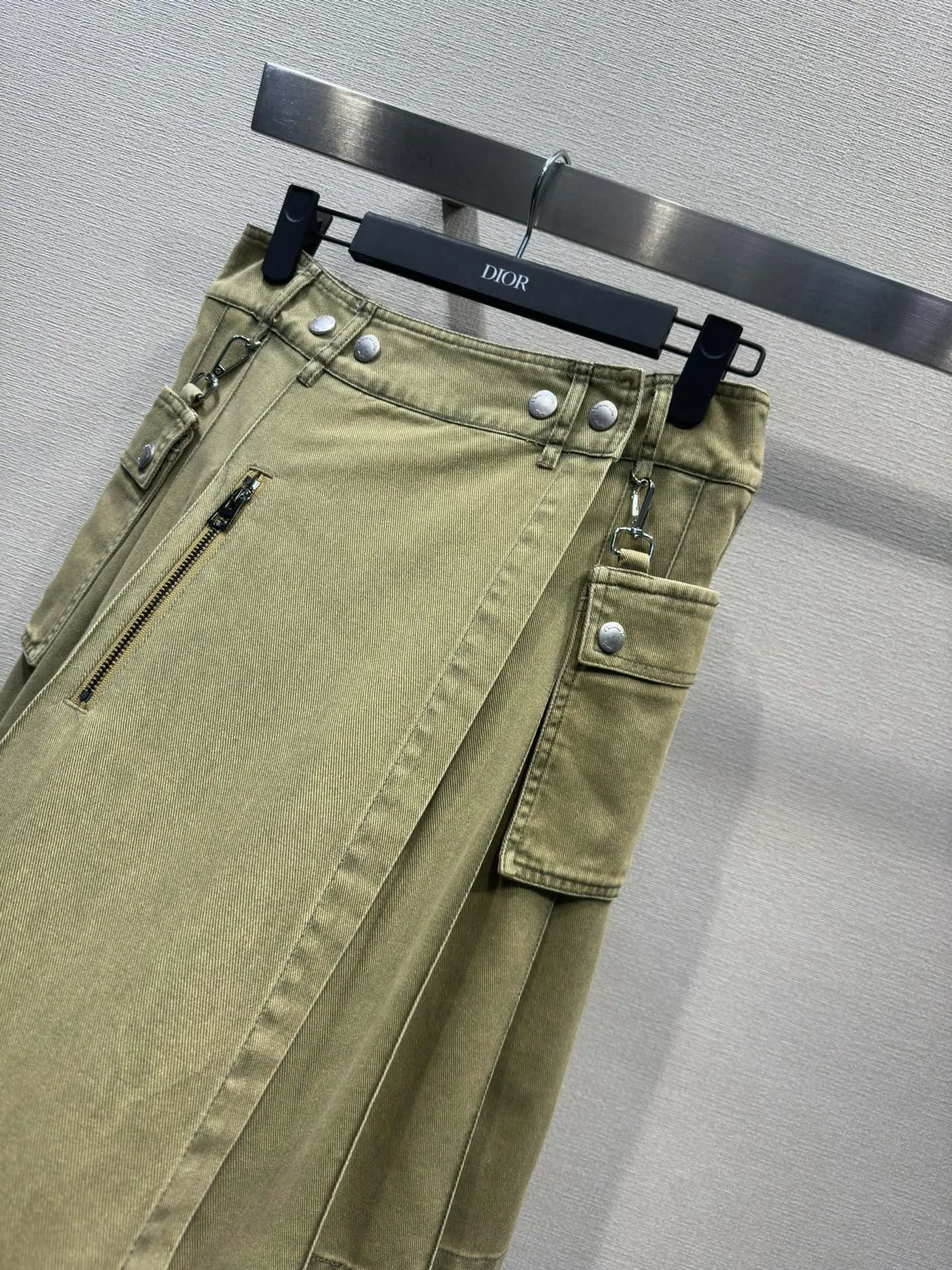 Dio2025の夏季新作、オリーブグリーンのデニムハーフスカートです。重工のスカートデザインが特徴で、ウエストには四合扣が装飾されています。半囲式の複雑なカッティングが施され、取り外し可能なサイドポケットが付いています。カスタム刻印ロゴのハードウェアが高級感を演出します。S、M、Lの3サイズ展開で、スーパーコピー優良サイトとしても注目されるデザイン性を兼ね備えています。