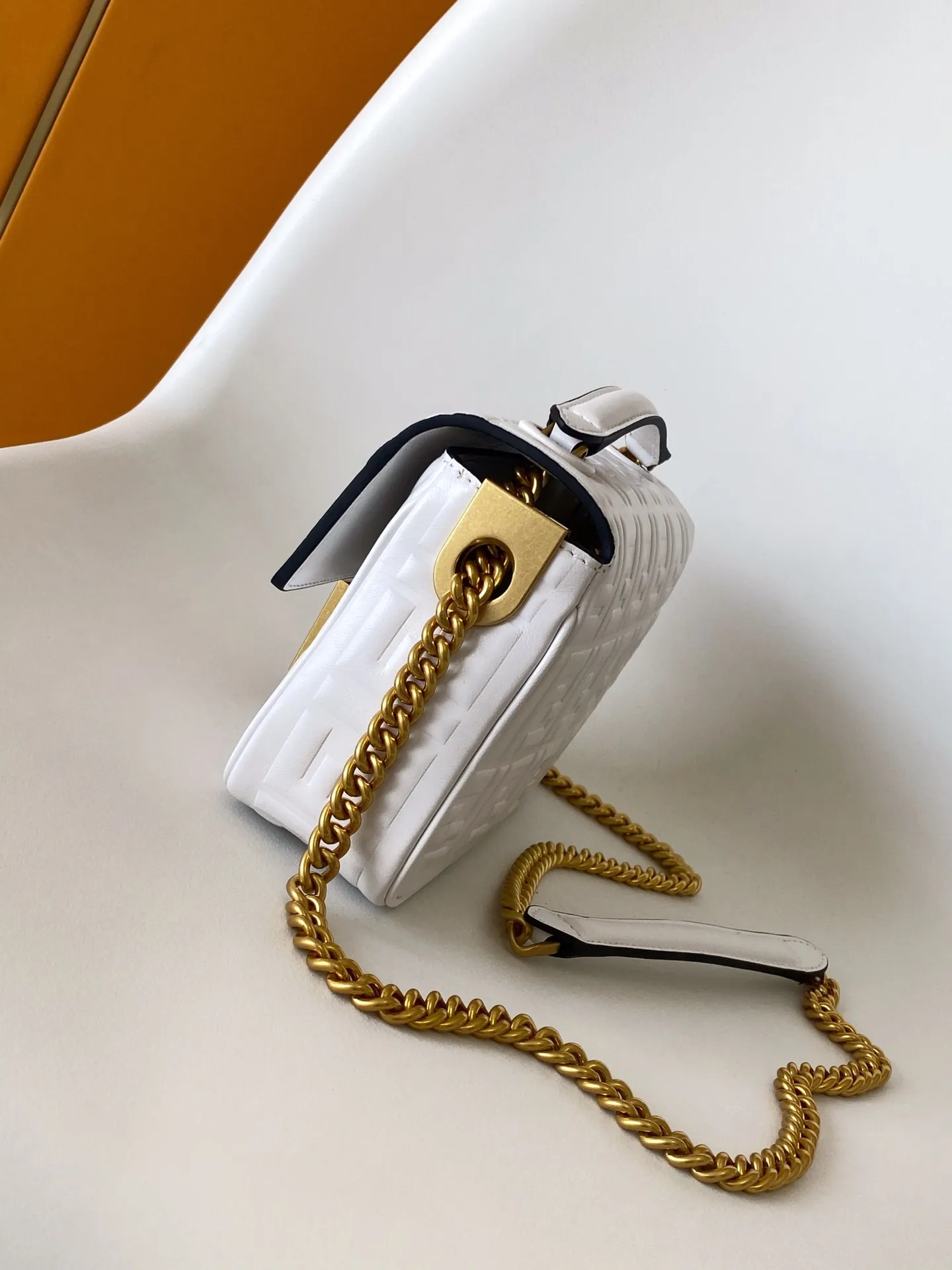 Fendiのクラシックミディアムバッグは、ホワイトのフルレザー素材で作られ、洗練されたエンボス加工が施されています。ゴールドチェーンのショルダーストラップがアクセントとなり、スタイリッシュな印象を与えます。サイズは24×7×14.5cmで、日常使いにも特別なシーンにも対応する高級感あふれるアイテムです。新しいファッション感を演出する一品として、N級品をお探しの方にもおすすめです。