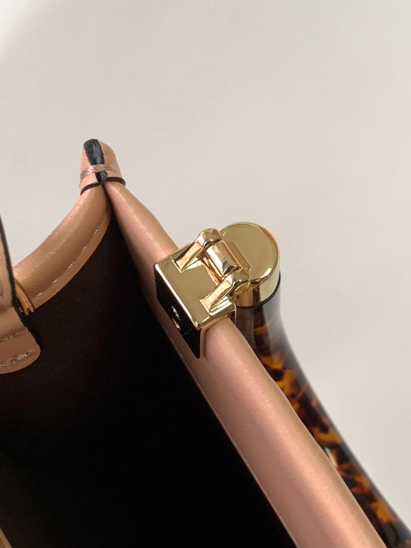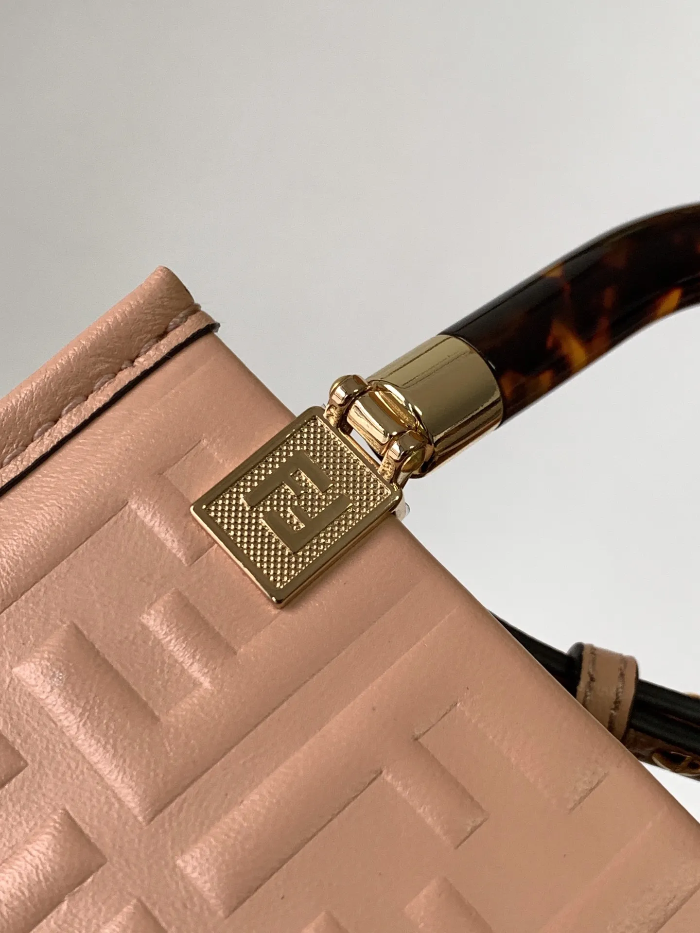 フェンディのミニサンシャインショッパーは、ピンクカラーのエレガントなデザインで、FENDI ROMAのエンボス加工が施されています。サイズは13-6.5-18cmで、コンパクトながらも機能的。内側には裏地付きのポケットがあり、2つの持ち手と取り外し可能な調節可能なショルダーストラップが付属しているため、ハンドキャリーやショルダーバッグとして使い分けが可能です。タートルシェル風のハンドルとゴールドのアクセントが高級感を演出し、N級品としてのクオリティを感じさせます。