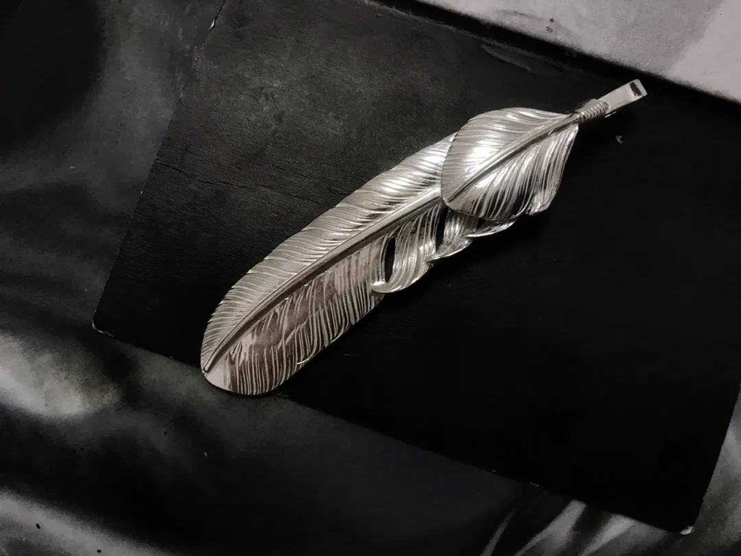 高橋吾郎がデザインしたシルバーフェザーペンダントです。ゴールドのアクセントが高級感を演出します。繊細な羽の模様が特徴で、シルバー素材の輝きが美しいです。全長約5.5cm、幅約1.5cmのサイズで、男女問わずお使いいただけます。個性的なデザインで、特別な存在感を放ち、スーパーコピー優良サイトでも注目される一品です。