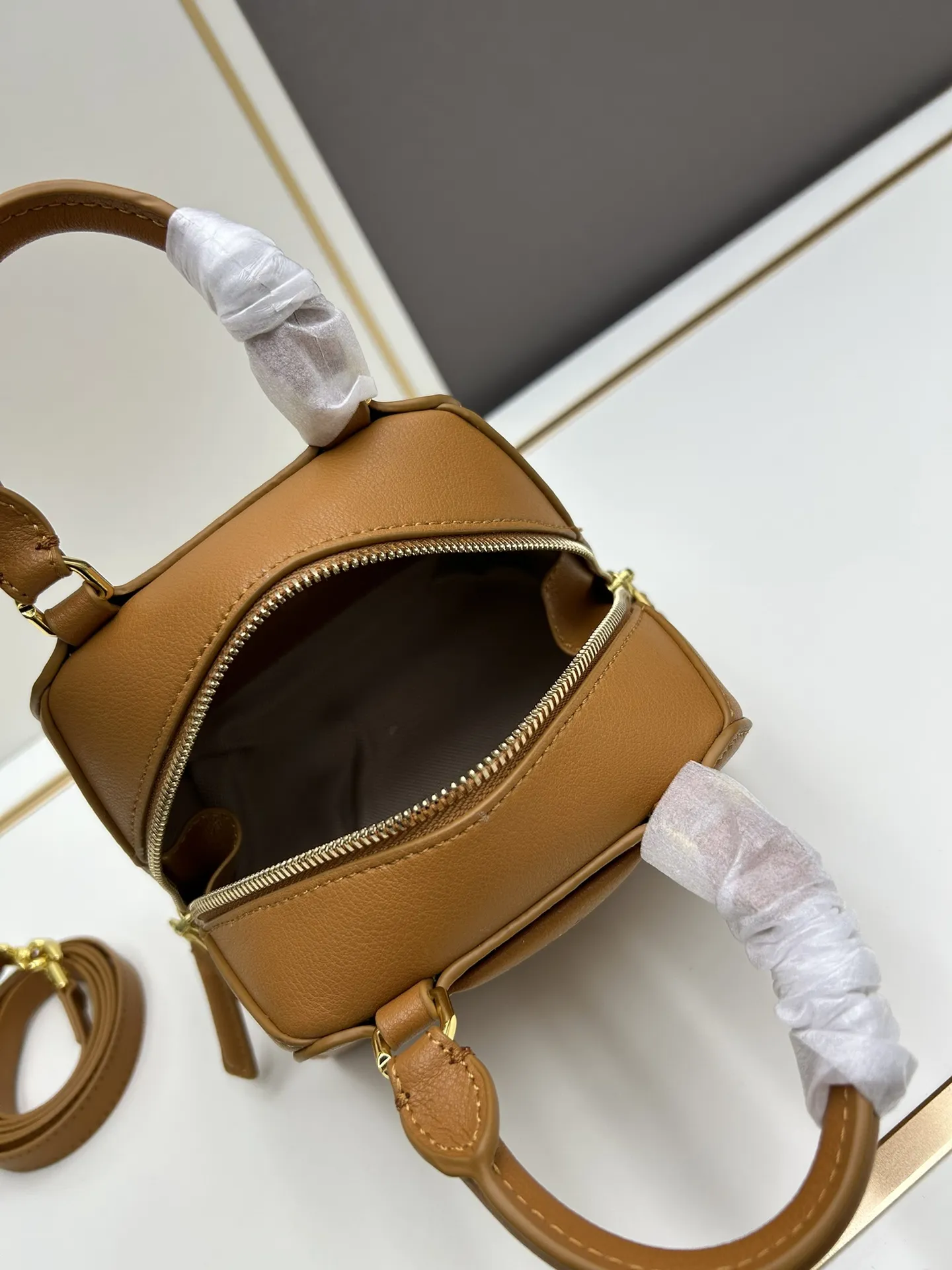 革製のヒンジ付きハンドル、4つのDリングでショルダーストラップ接続可能