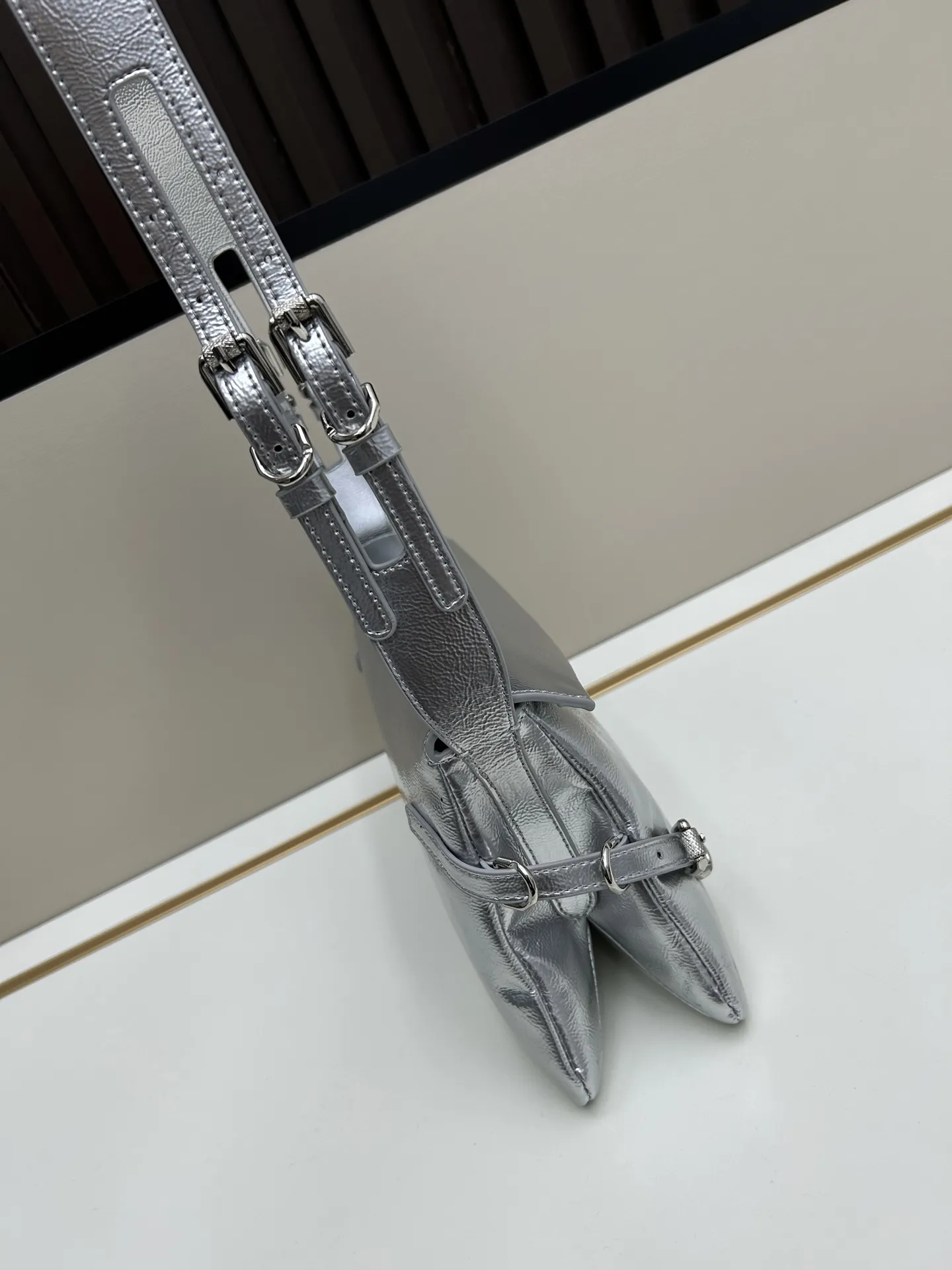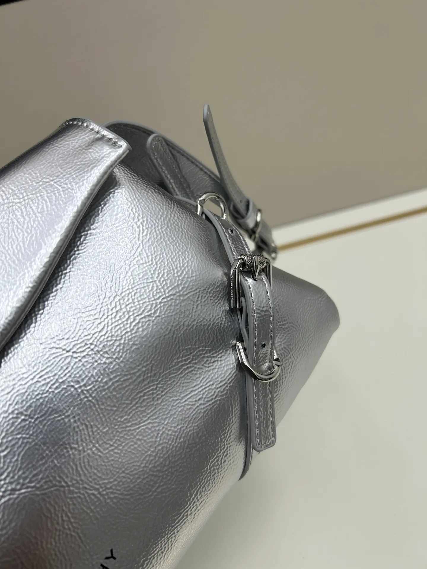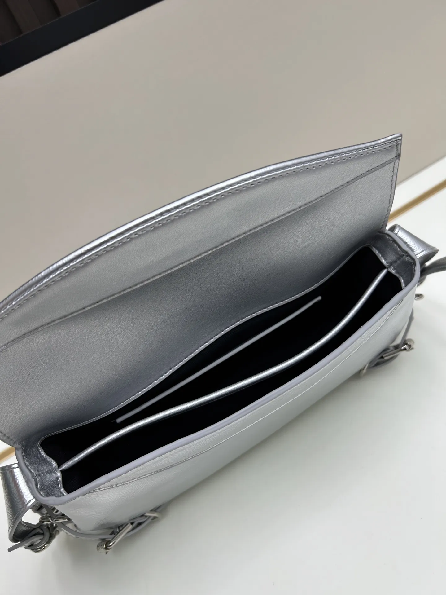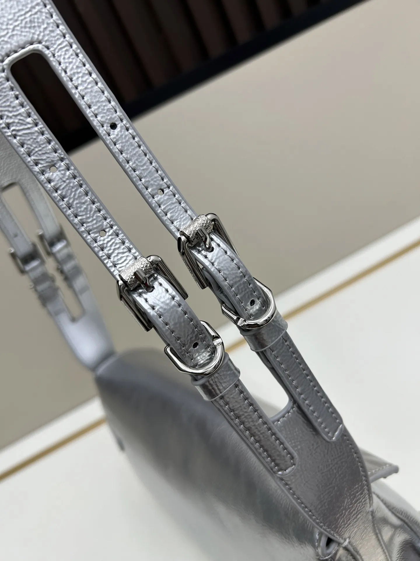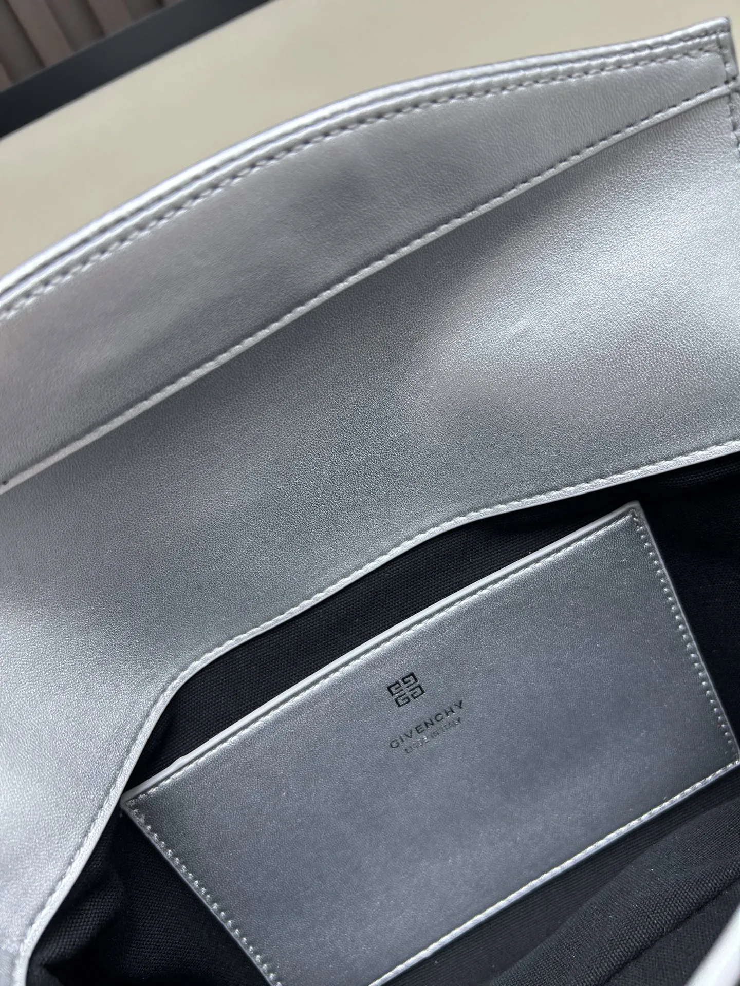 新作のGIVENCHY シルバー Voyou 小号漆面肩背包です。Voyouシリーズの特徴である磁力翻盖開閉と、可調節可拆卸の皮革短提手が付いています。GIVENCHYのロゴがエンボス加工で施され、銀色の金属ディテールが高級感を演出します。内部には2つの隔層とカードポケットがあり、機能性も兼ね備えています。サイズは32 cm x 15 cm x 9.5 cmで、肩掛けも可能です。最高品質のアイテムをお探しの方には、N級品としておすすめの逸品です。