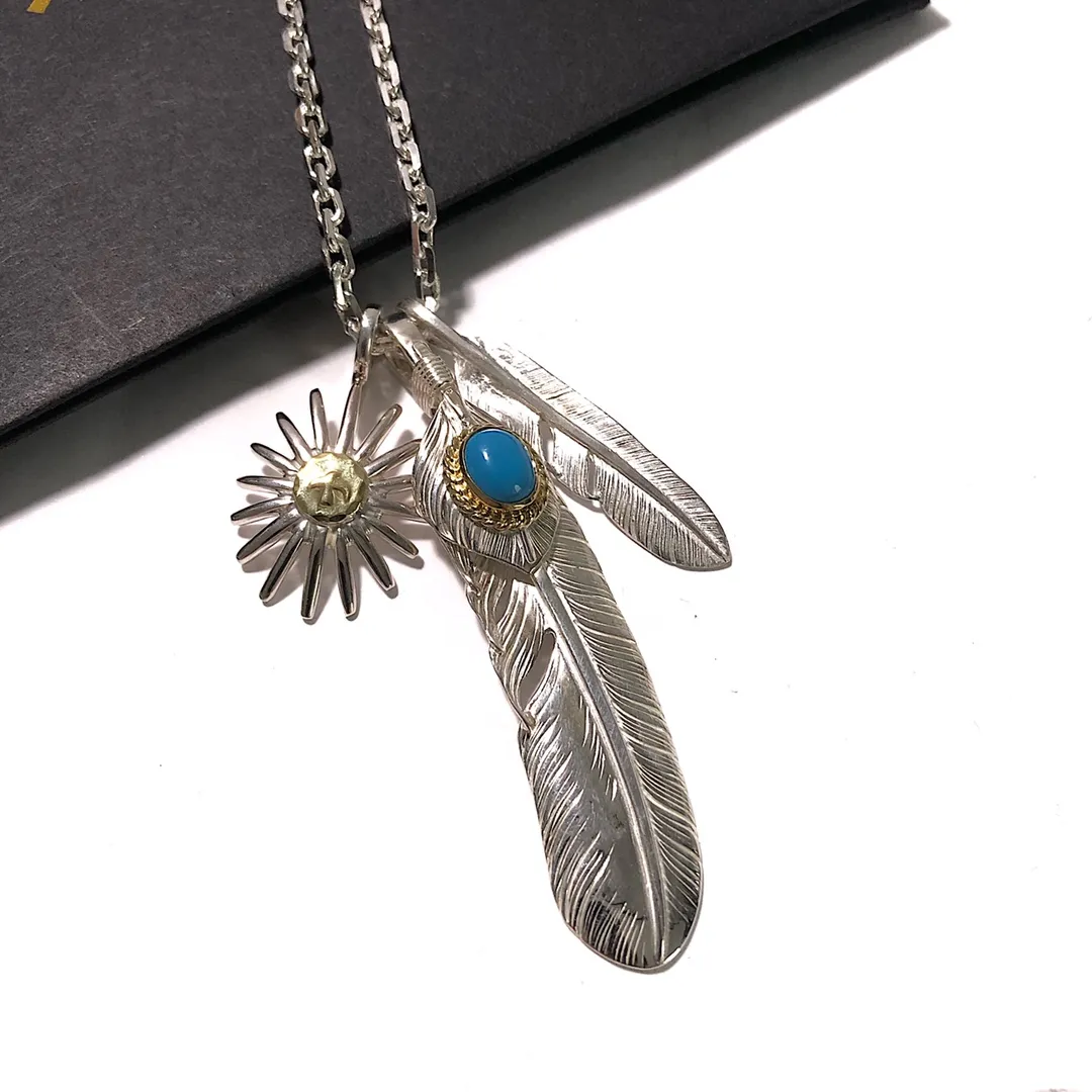 Goro’sの高橋吾郎デザインによるトップバージョンのネックレスです。シルバー素材にブルーのターコイズストーンがアクセントとなり、羽根、太陽、クロスのモチーフが特徴的。東京のトレンドを感じさせるデザインで、特別な存在感を放ちます。高級感あふれる仕上げで、日常から特別なシーンまで幅広く活躍します。市場にはスーパーコピー優良サイトからの類似品も出回っていますが、本物の品質とデザインをお楽しみください。