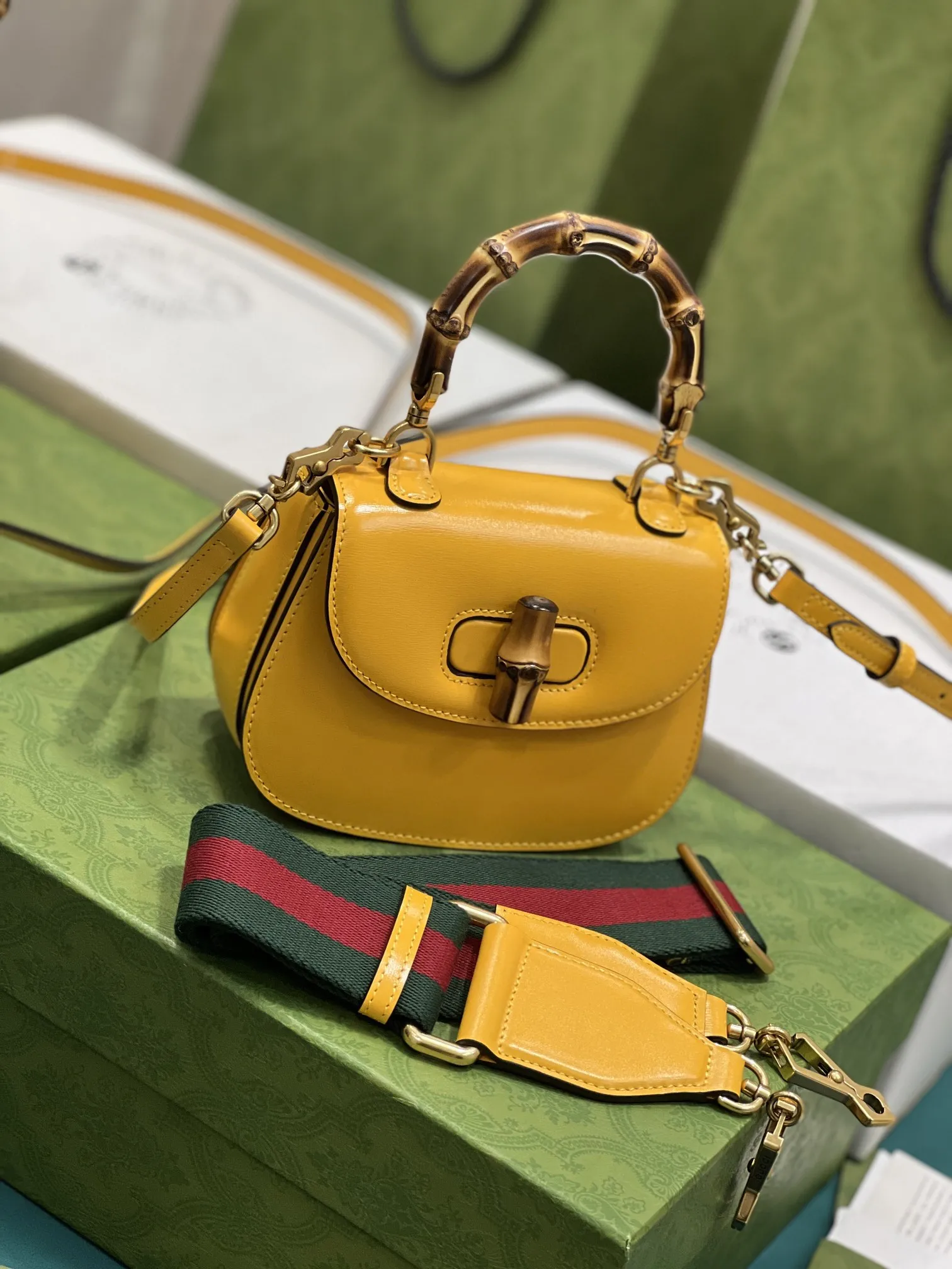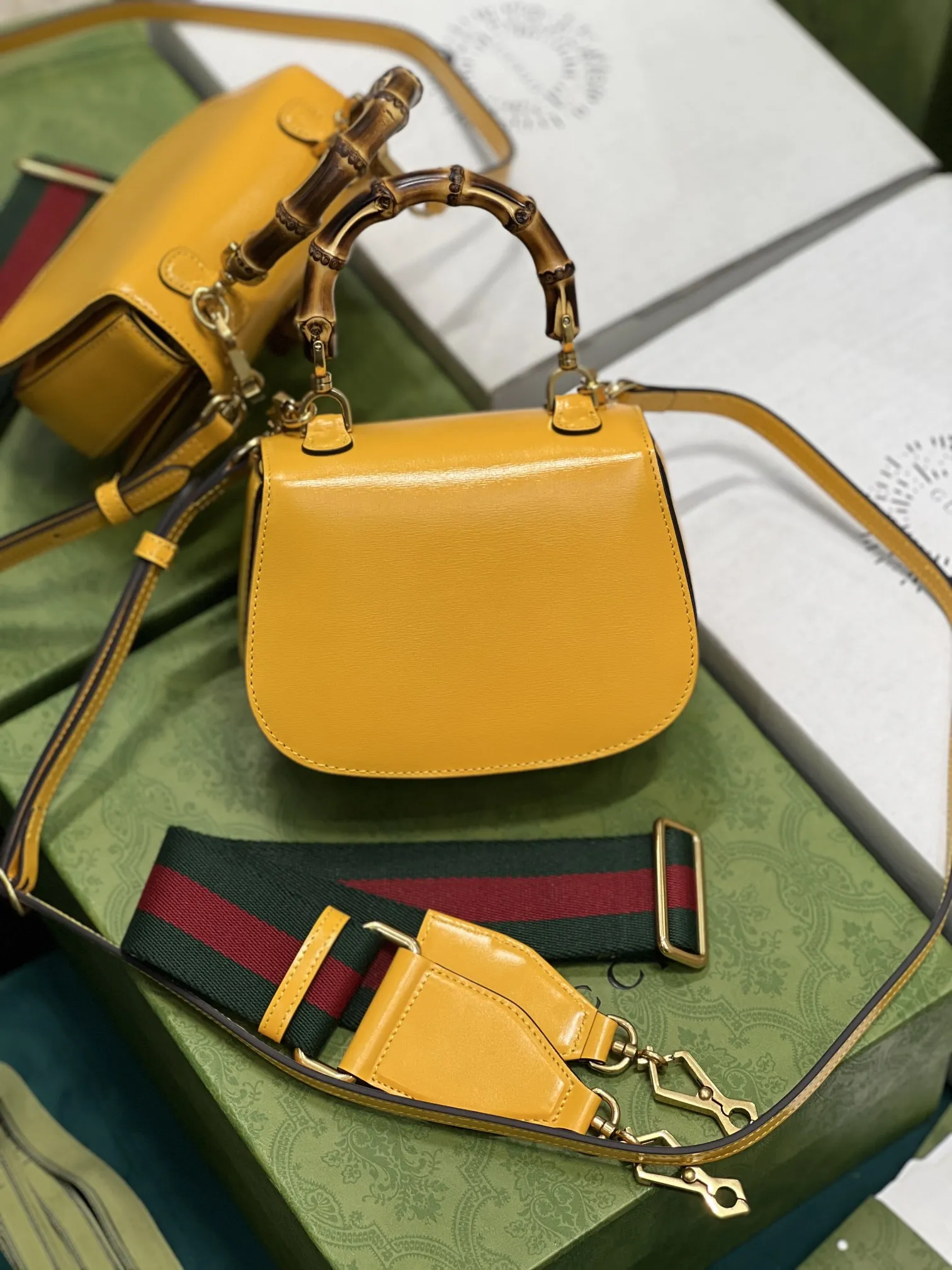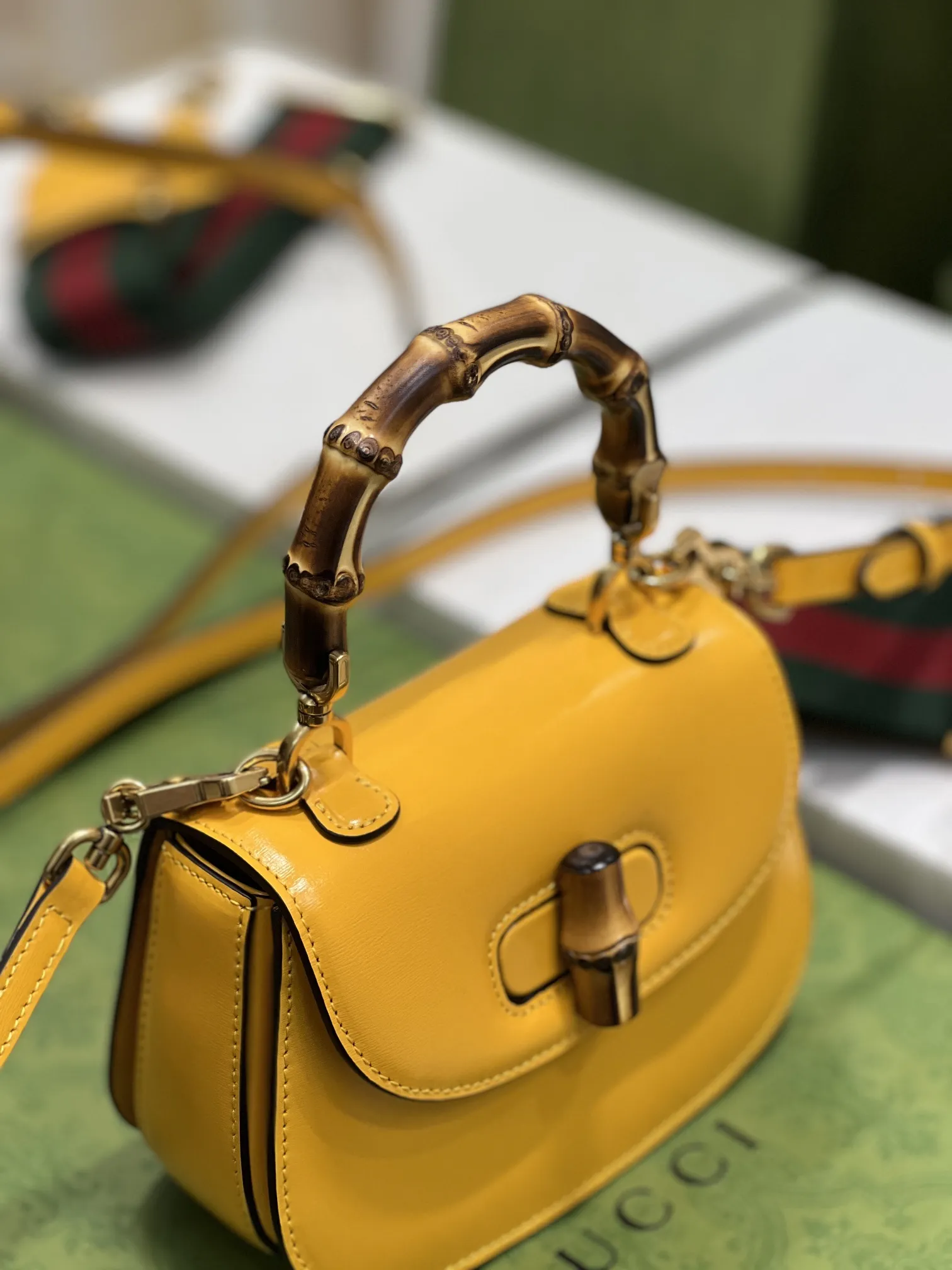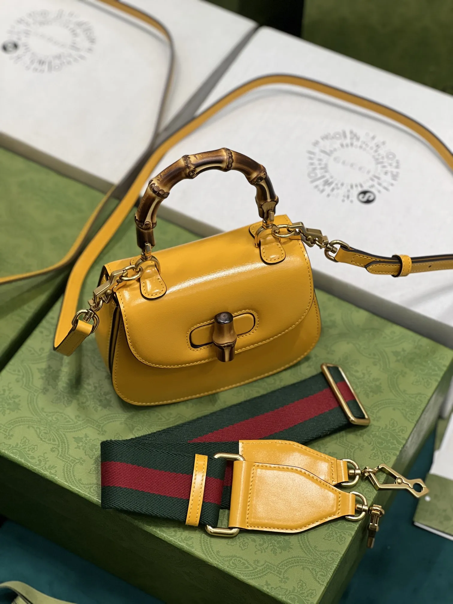 GucciのAriaシリーズから、イエローの光沢レザーで仕上げた小型ハンドバッグです。クラシックな竹節ハンドルが特徴で、80年以上の歴史を持つデザインを現代的に再解釈しています。2種類の交換可能なショルダーストラップが付属し、スタイルに合わせて使い分けできます。このような高品質なデザインは、まさにN級品のクオリティを感じさせます。サイズは17×12×7.5cmで、型番は68686です。