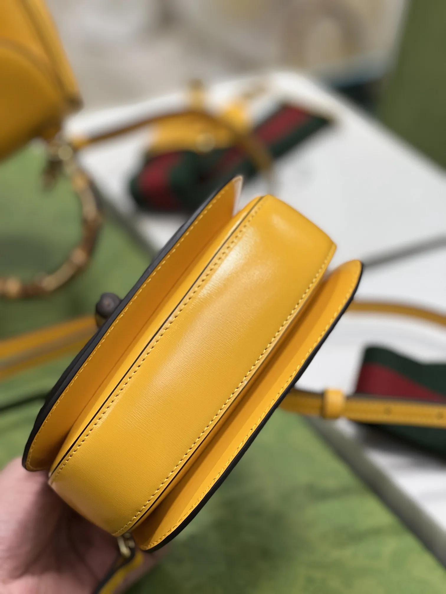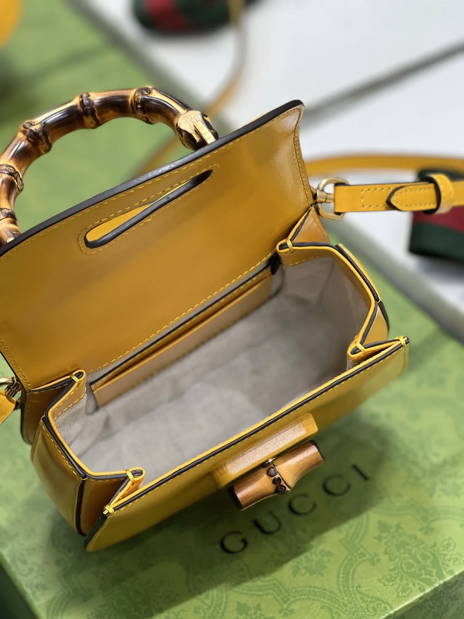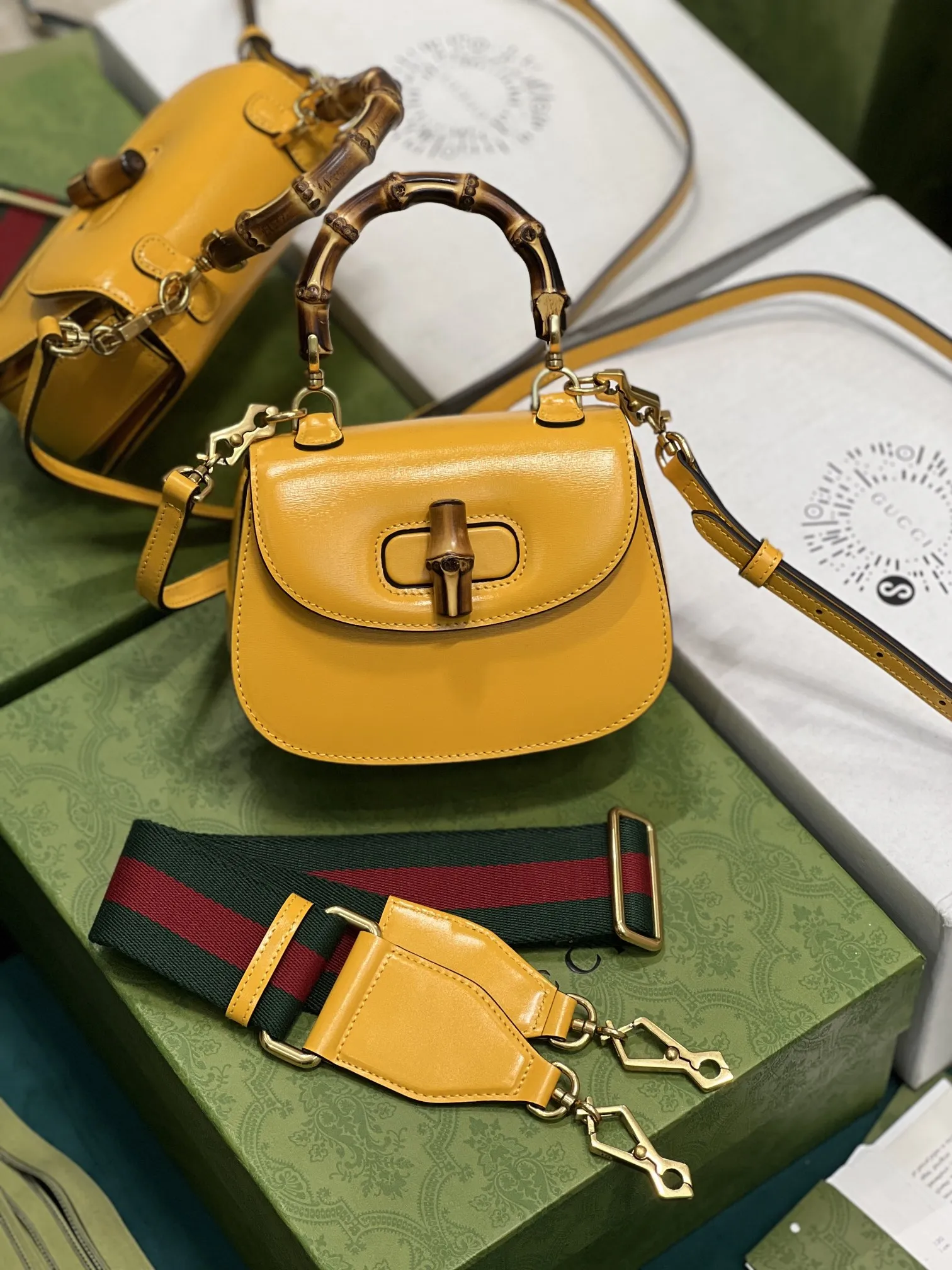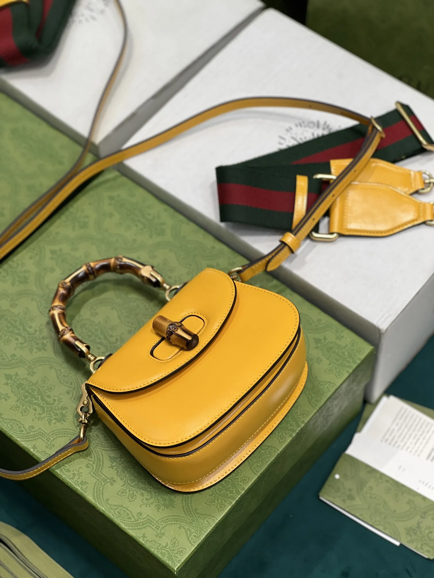 GucciのAriaシリーズから、イエローの光沢レザーで仕上げた小型ハンドバッグです。クラシックな竹節ハンドルが特徴で、80年以上の歴史を持つデザインを現代的に再解釈しています。2種類の交換可能なショルダーストラップが付属し、スタイルに合わせて使い分けできます。このような高品質なデザインは、まさにN級品のクオリティを感じさせます。サイズは17×12×7.5cmで、型番は68686です。