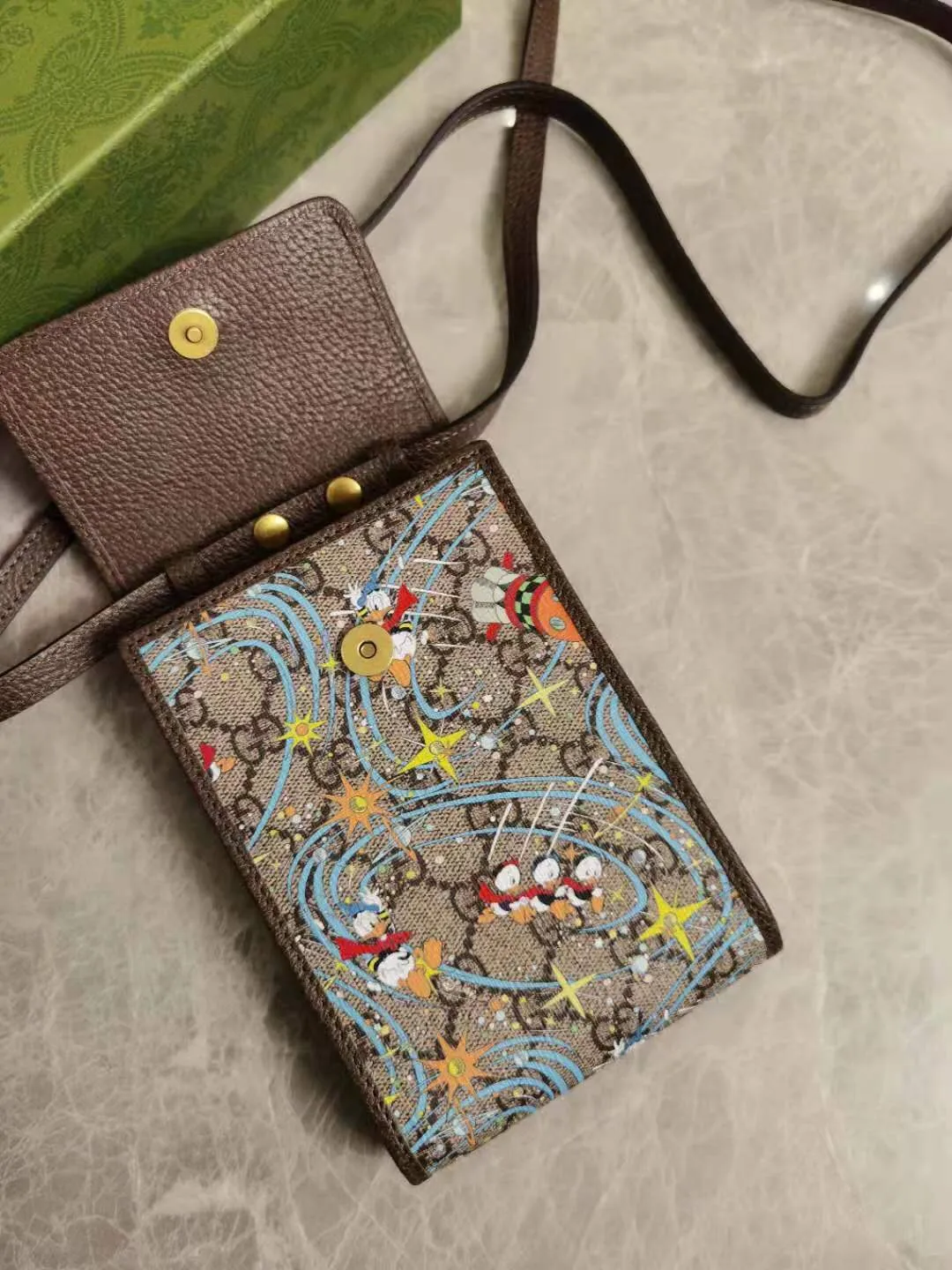 Gucciのドナルドダック柄ショルダーバッグは、唐老鸭シリーズの一員として、ドナルドダックとその三人の甥たちが一緒に登場するユニークなデザインが特徴です。ファッションと実用性を兼ね備えたこのバッグは、オリジナルの皮素材で作られ、ブラウンカラーが高級感を演出します。サイズは18x11x3cmで、日常使いに最適です。特別なアイテムをお探しの方には、スーパーコピーバッグとしても注目される一品です。
