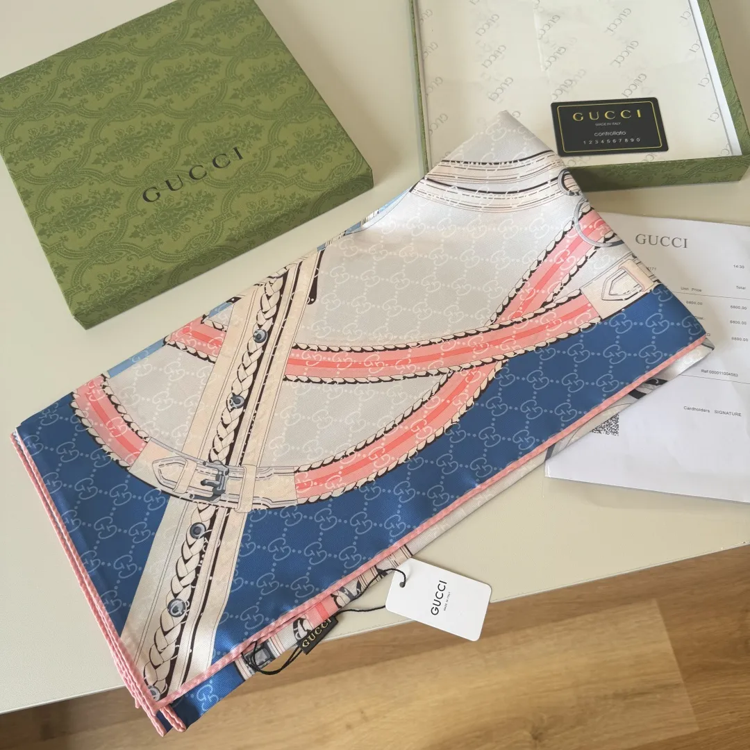 Gucci 新しいマルベリーシルクスクエアスカーフ ブルー ホースビット柄