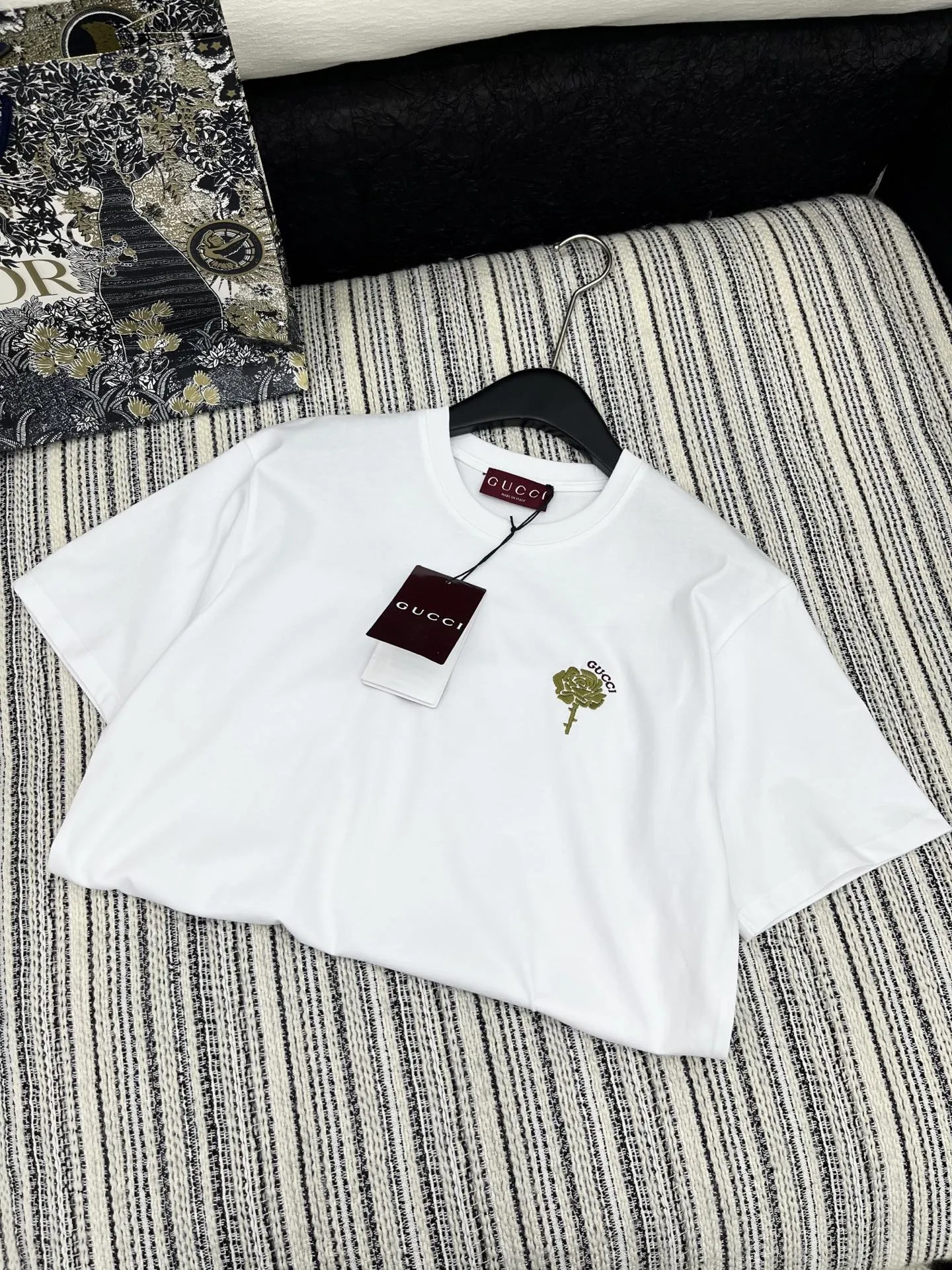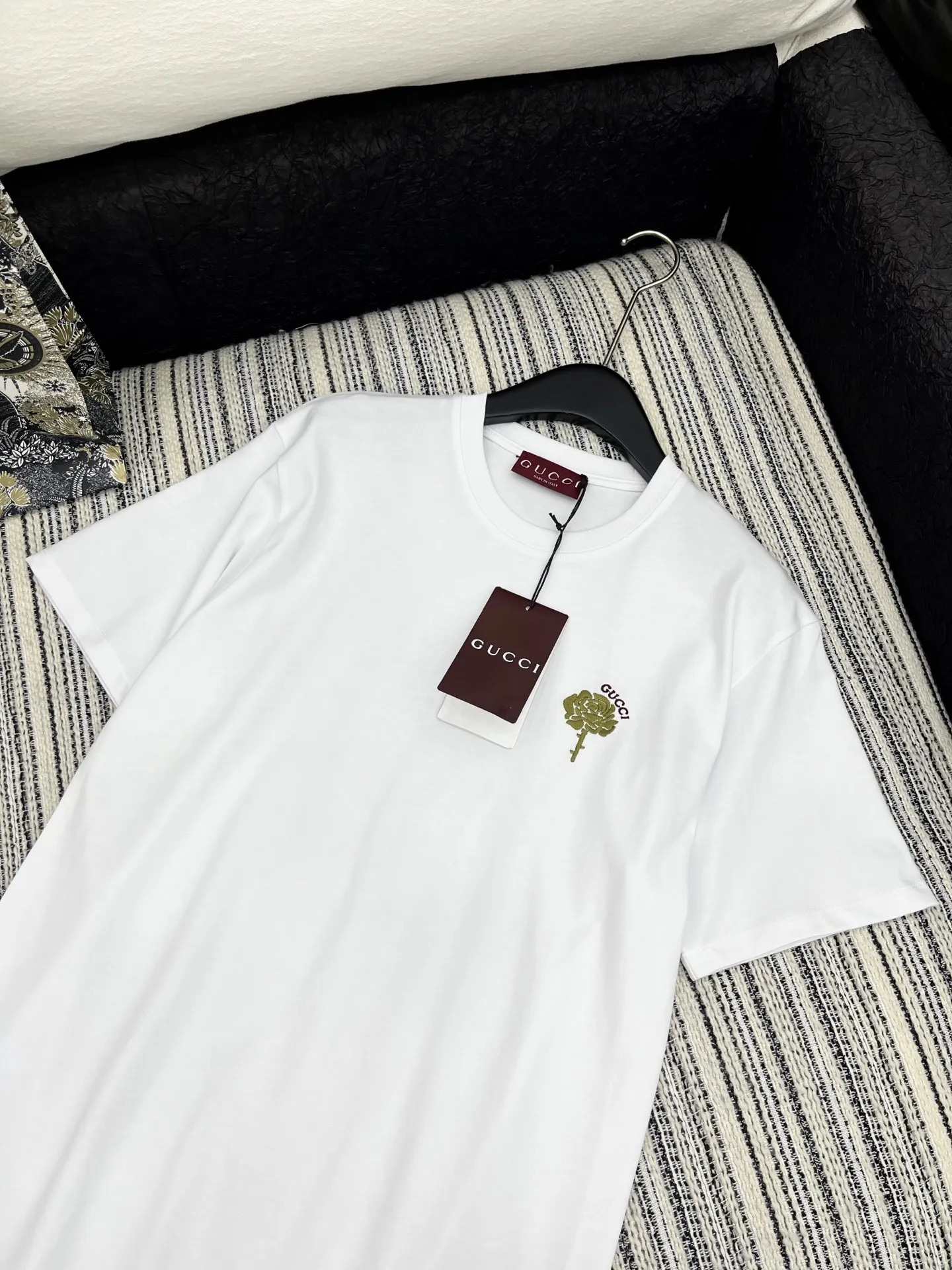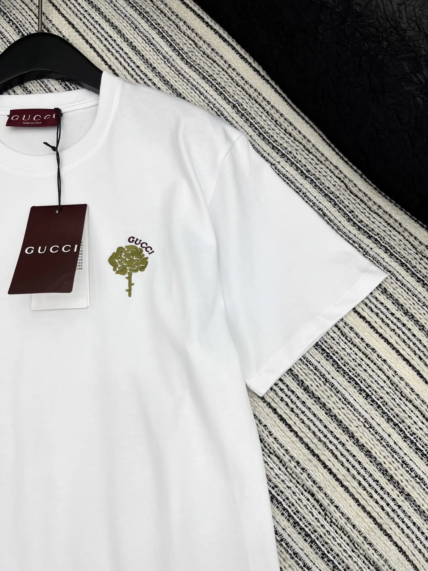 Gucciの新作、白い拼接螺纹半袖Tシャツです。25限定シリーズの新品で、オリジナル品質を誇ります。最新の花刺繍が施され、低調な高級感を演出。スタイリッシュな必需品として、どんなスタイルにも合わせやすいクラシックなシルエットが特徴です。トレンドを押さえたデザインのTシャツ スーパー コピーをお探しの方にもおすすめの一着です。