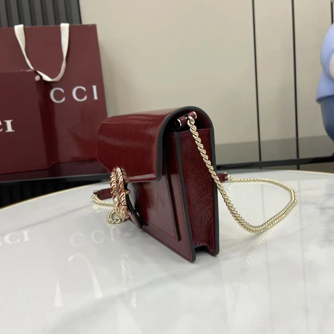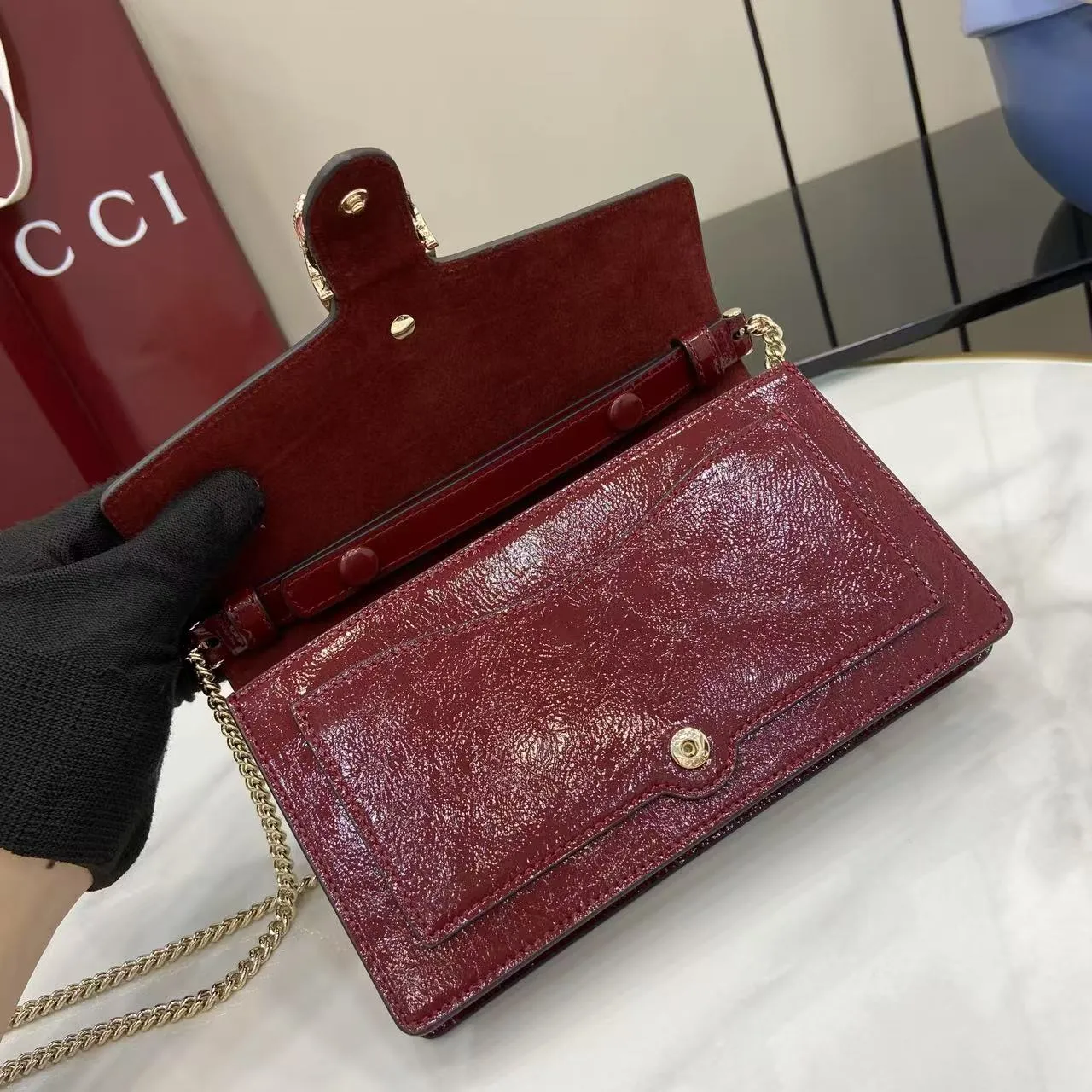 新品のGucci安可拉紅漆皮チェーンバッグです。漆皮素材で作られたこのバッグは、スタイリッシュなデザインと実用性を兼ね備えています。浅金色調のチェーンショルダーストラップが付属しており、様々なスタイルに合わせやすいです。内部には6つのカードスロットと1つのジッパーポケット、外部には1つのフラットポケットがあり、収納力も抜群です。最高品質のアイテムをお探しの方には、N級品として自信を持ってお勧めできる一品です。