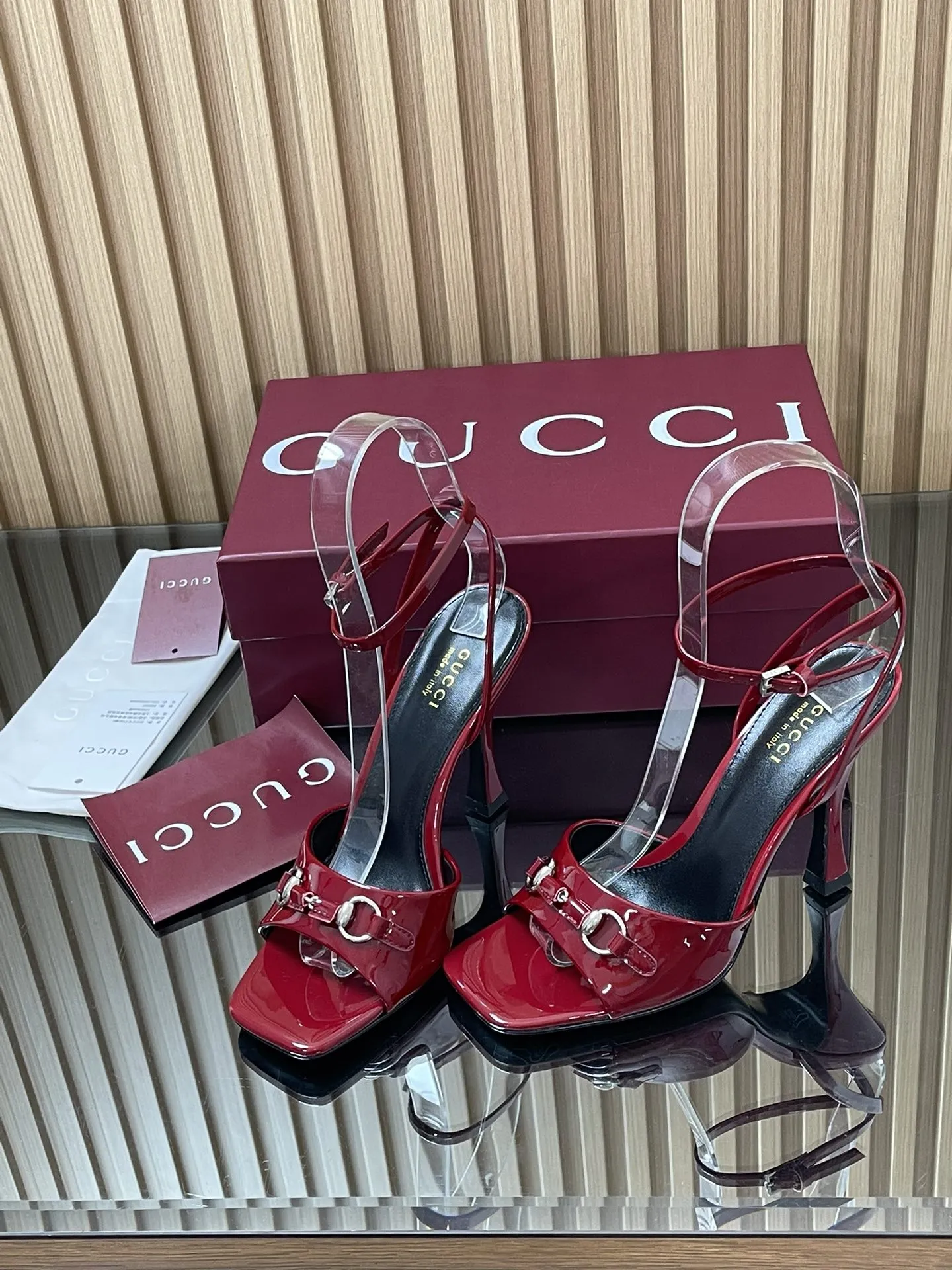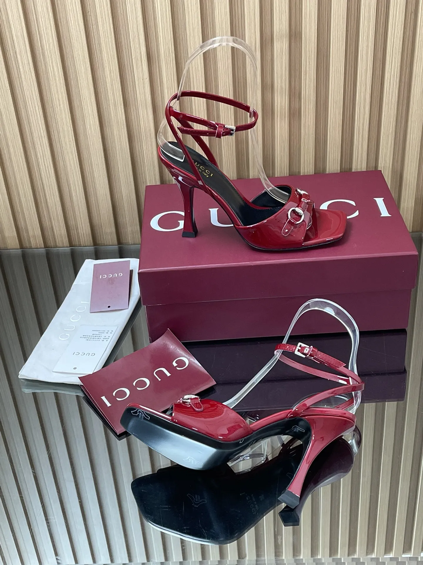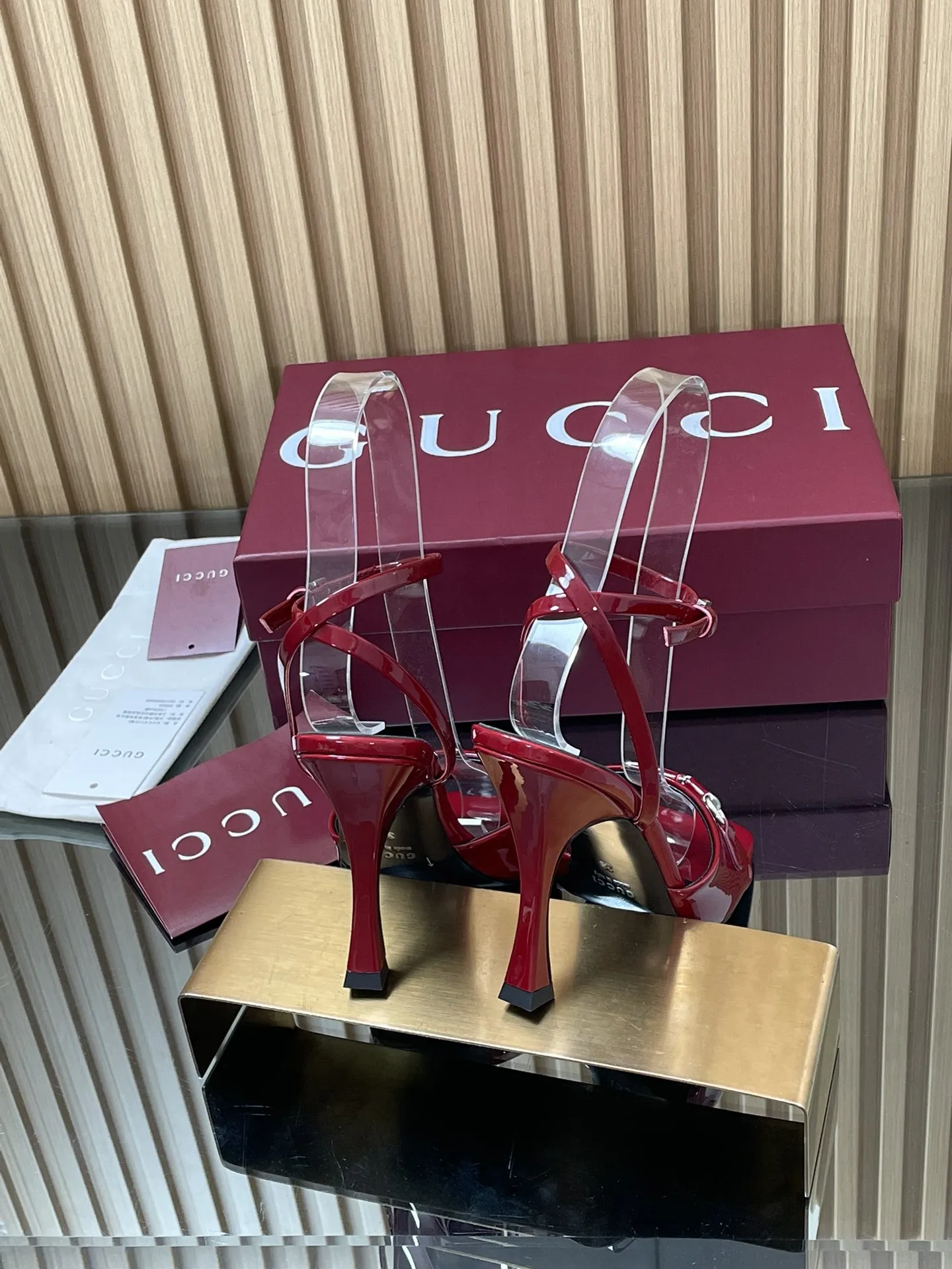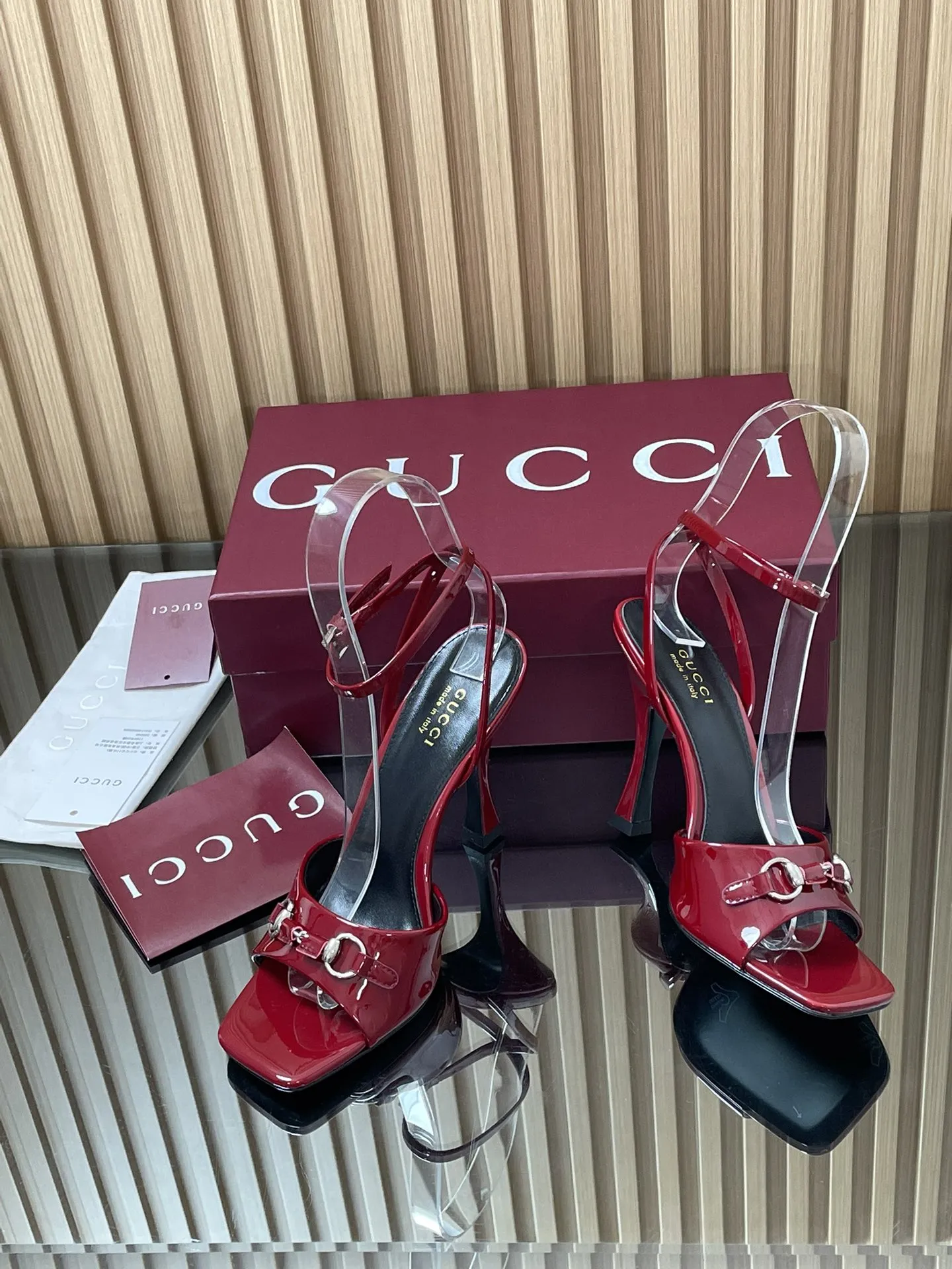 GUCCIレッドパテントレザーハイヒールサンダル