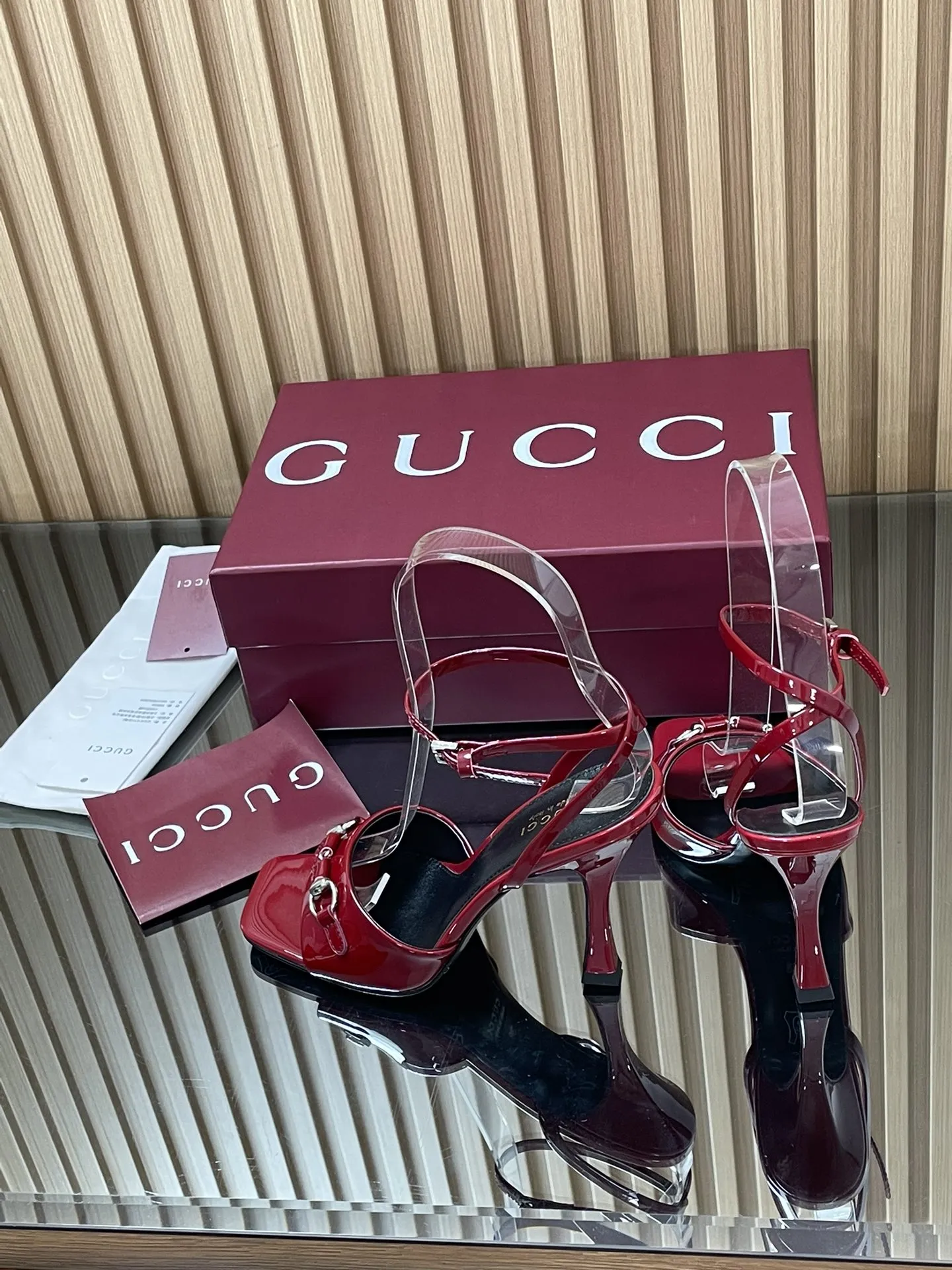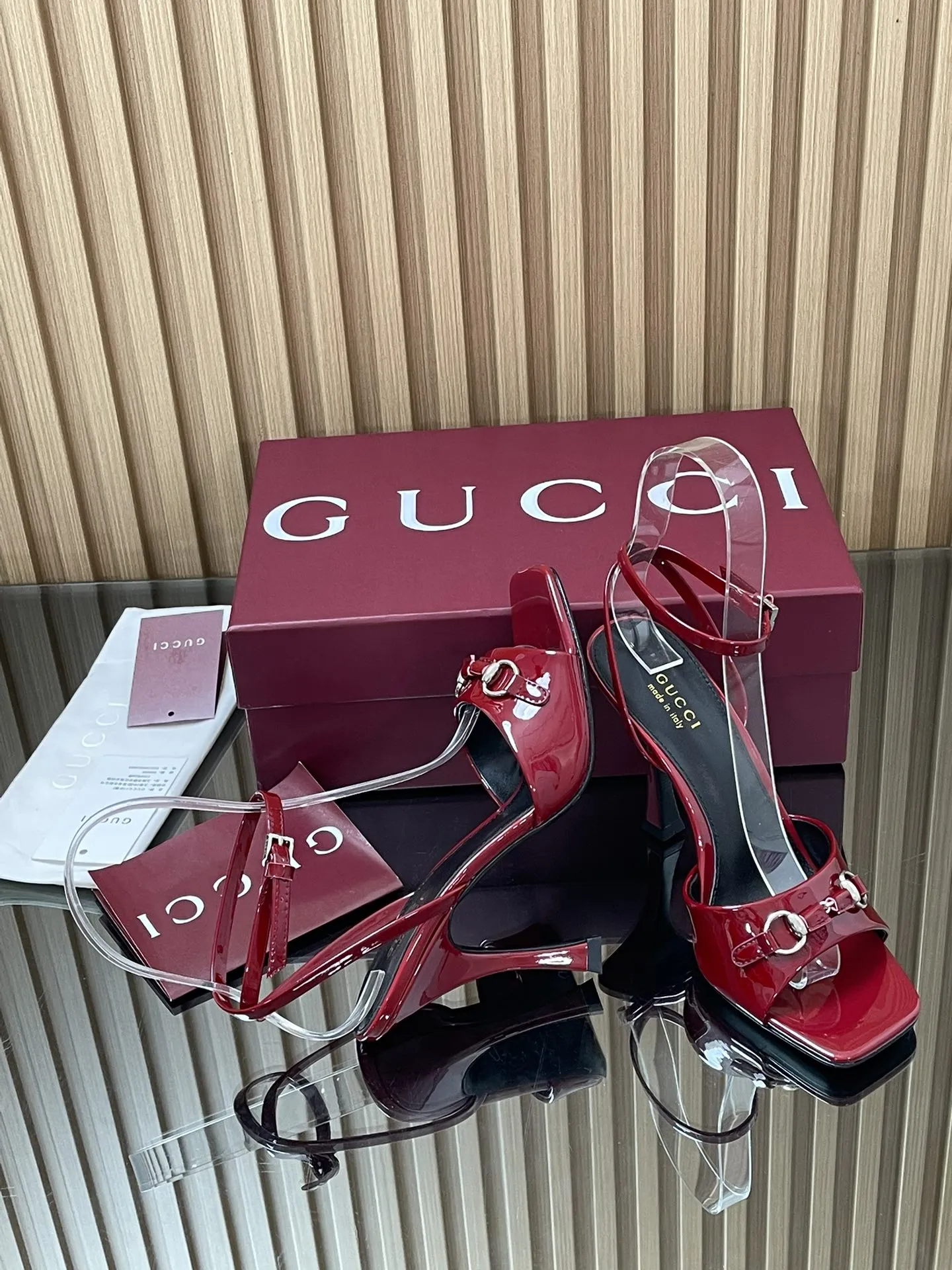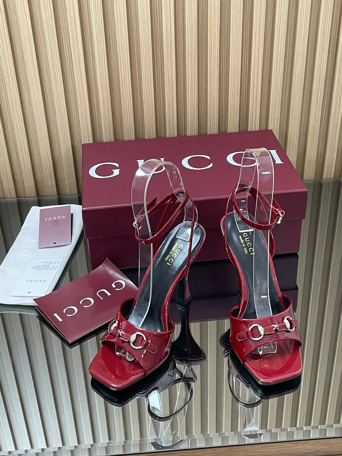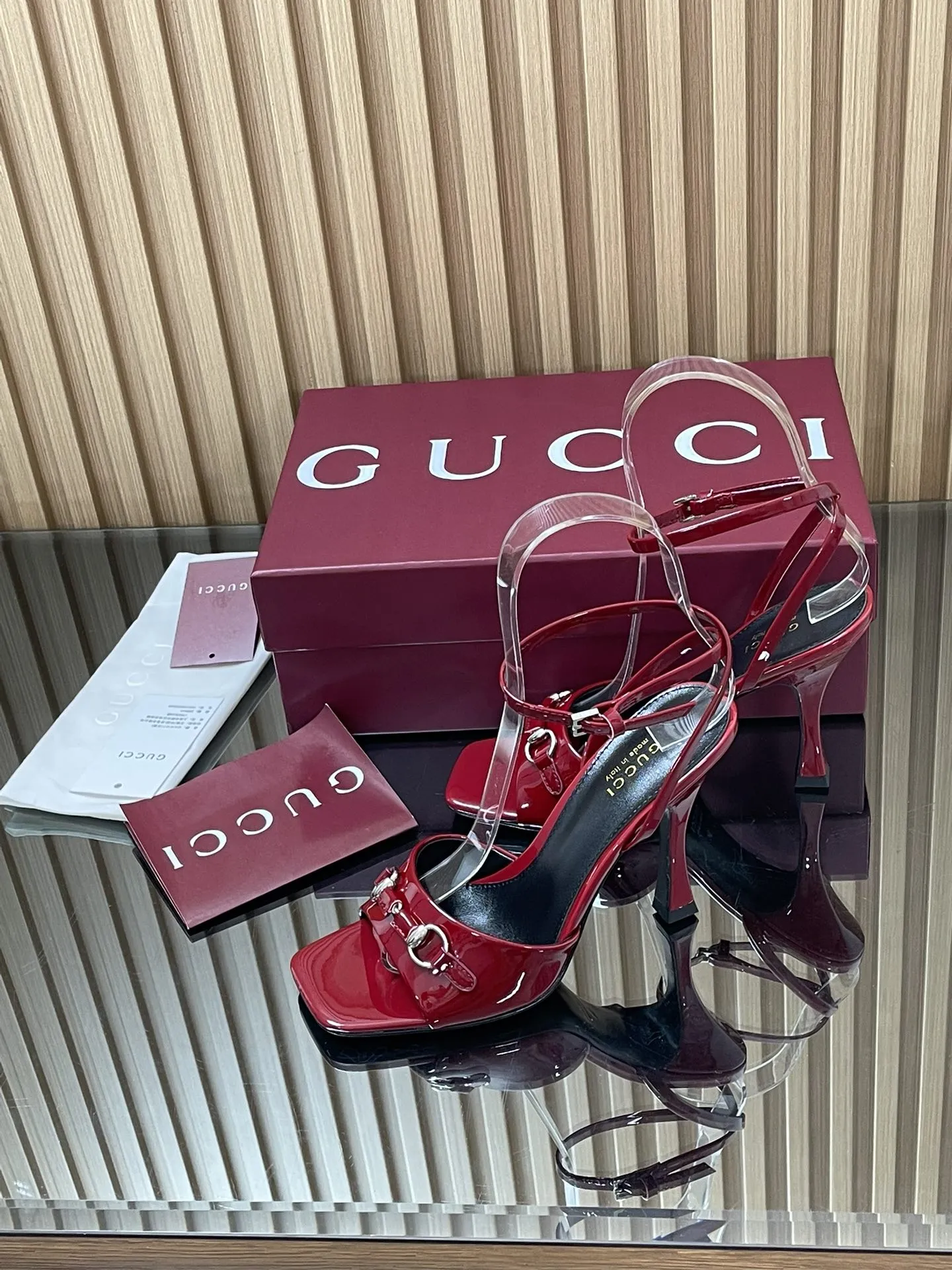 GUCCIレッドパテントレザーハイヒールサンダル