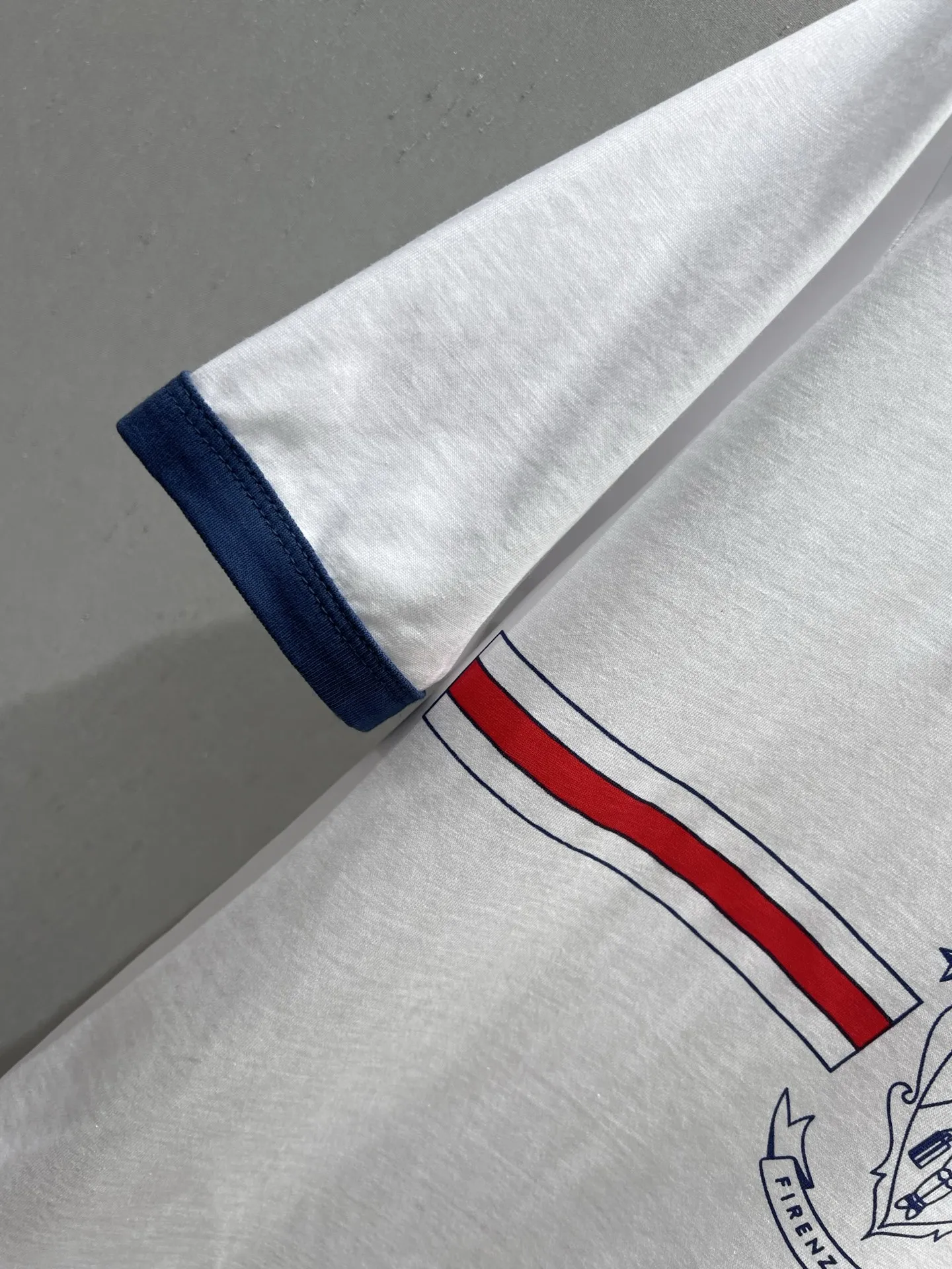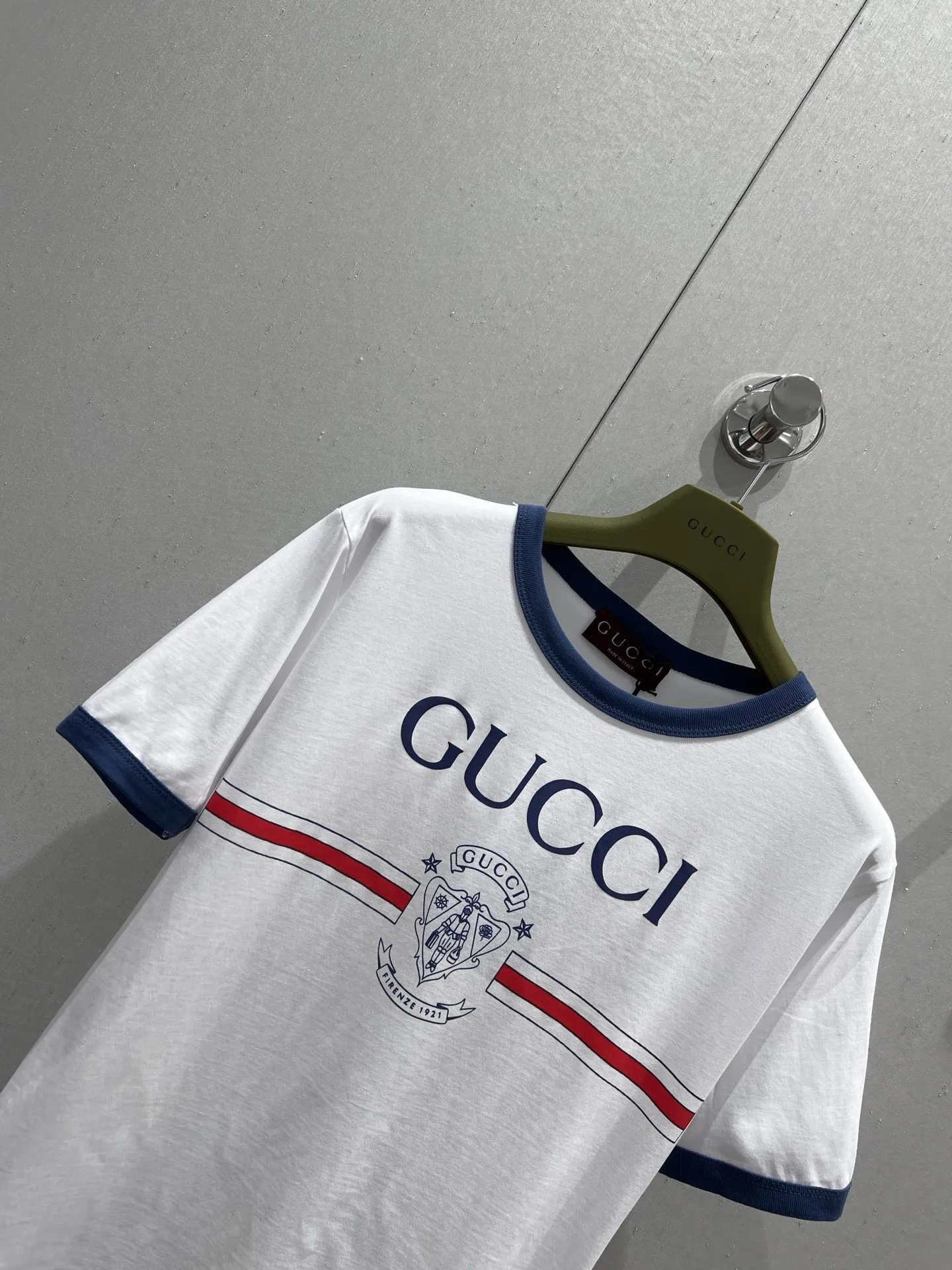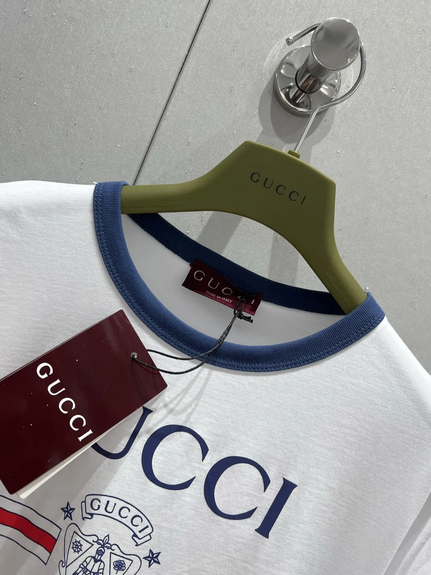 Gucciの2025年早春新作、Gucci Firenze 1921行李员徽章プリントの半袖Tシャツです。軽量な白色ニットコットンを使用し、青色のリブ編みカラーと袖口がアクセント。高品質な仕上げで、限定開発モデルとして現品販売しています。シンプルでありながら、ディテールにこだわった一着で、Tシャツ スーパーコピーとしても注目されるデザインです。