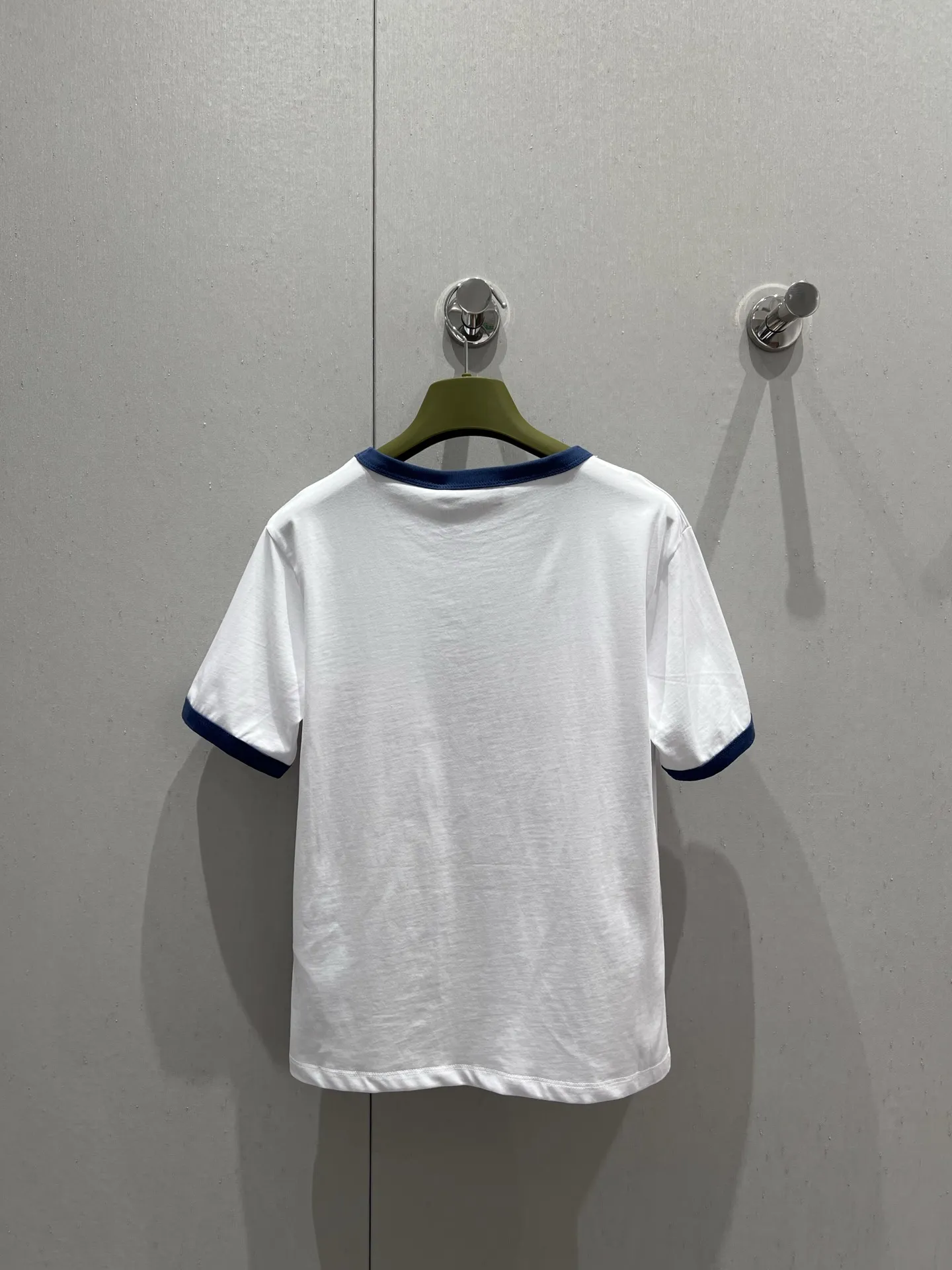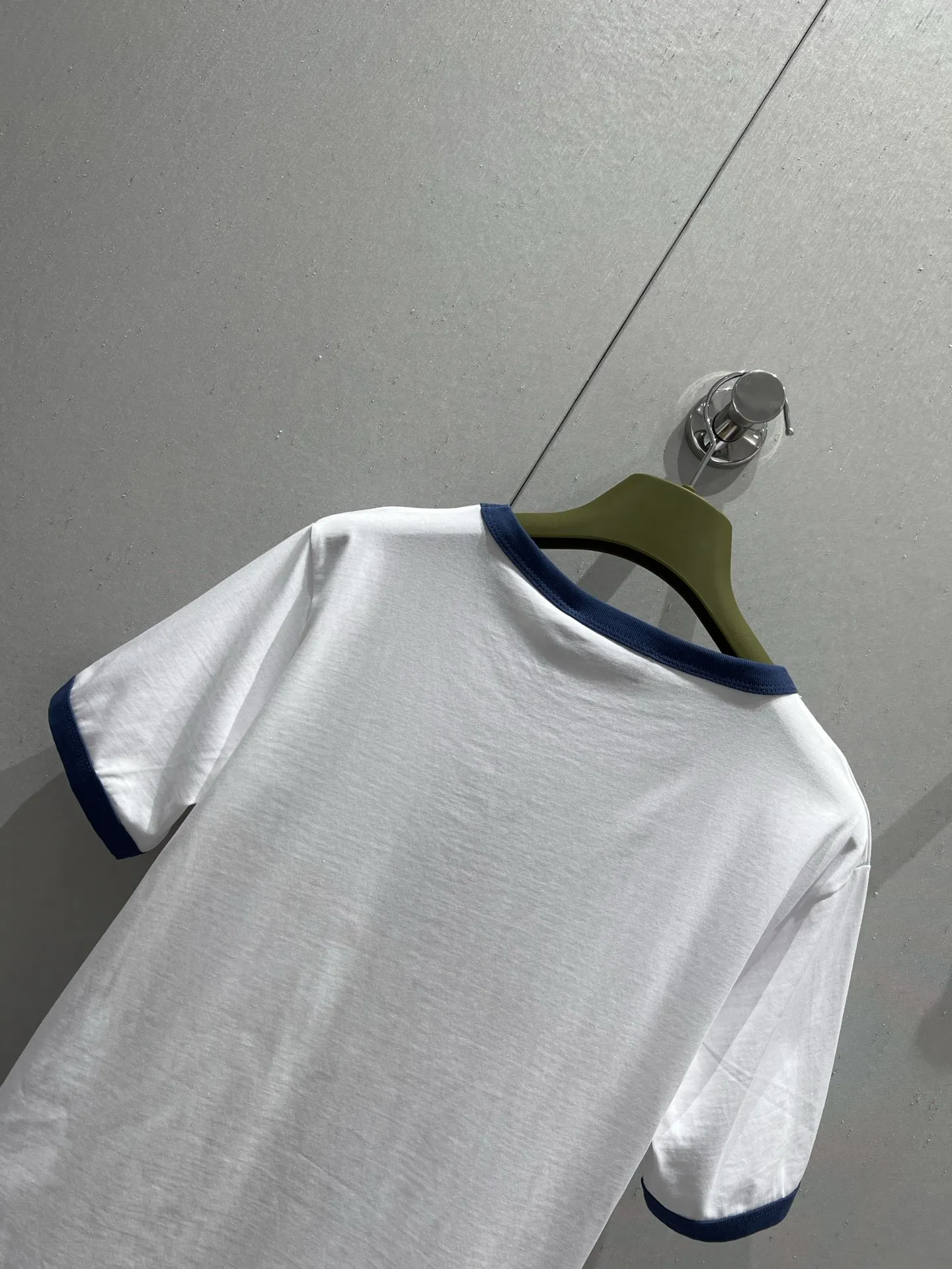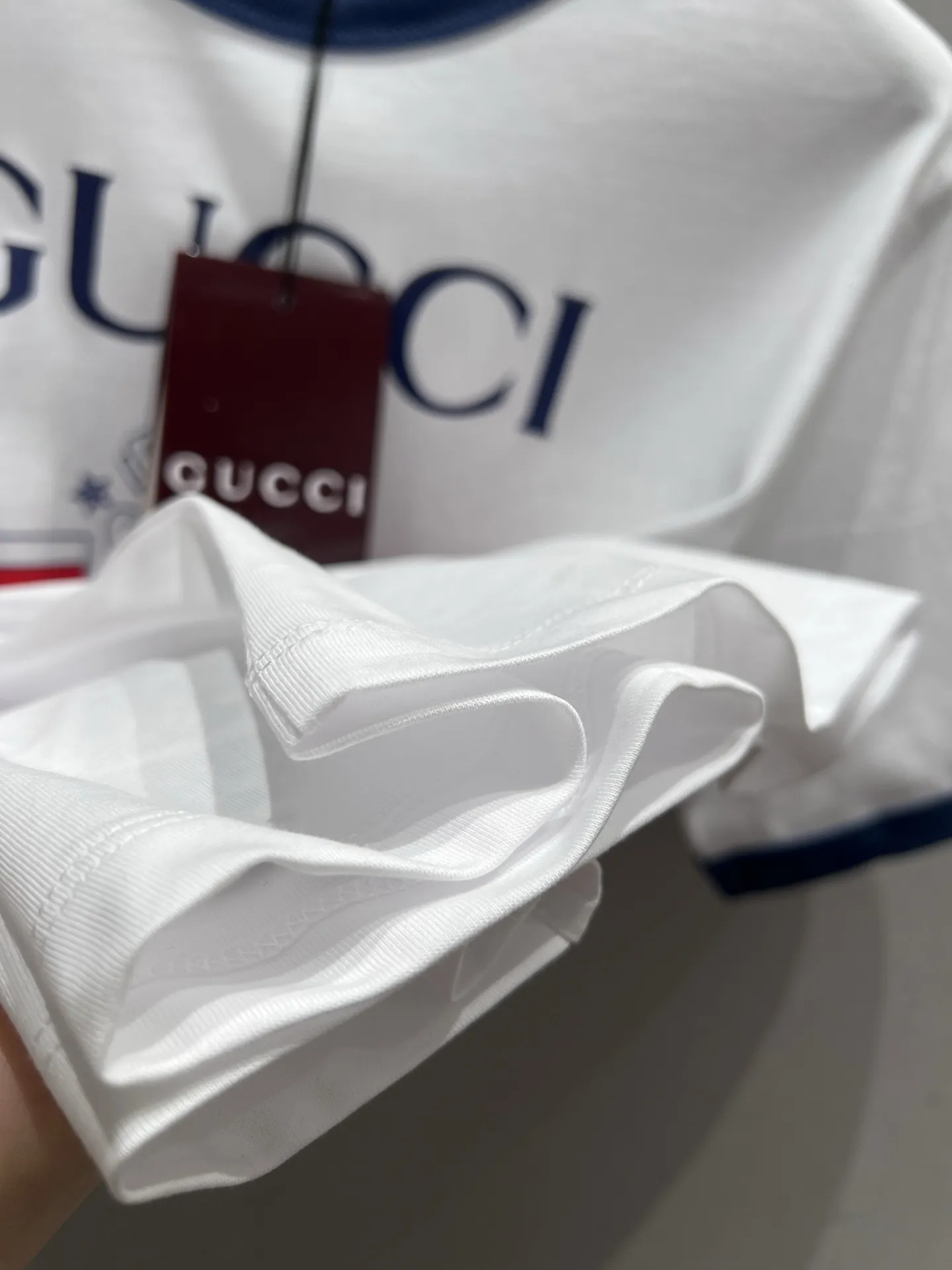 Gucciの2025年早春新作、Gucci Firenze 1921行李员徽章プリントの半袖Tシャツです。軽量な白色ニットコットンを使用し、青色のリブ編みカラーと袖口がアクセント。高品質な仕上げで、限定開発モデルとして現品販売しています。シンプルでありながら、ディテールにこだわった一着で、Tシャツ スーパーコピーとしても注目されるデザインです。
