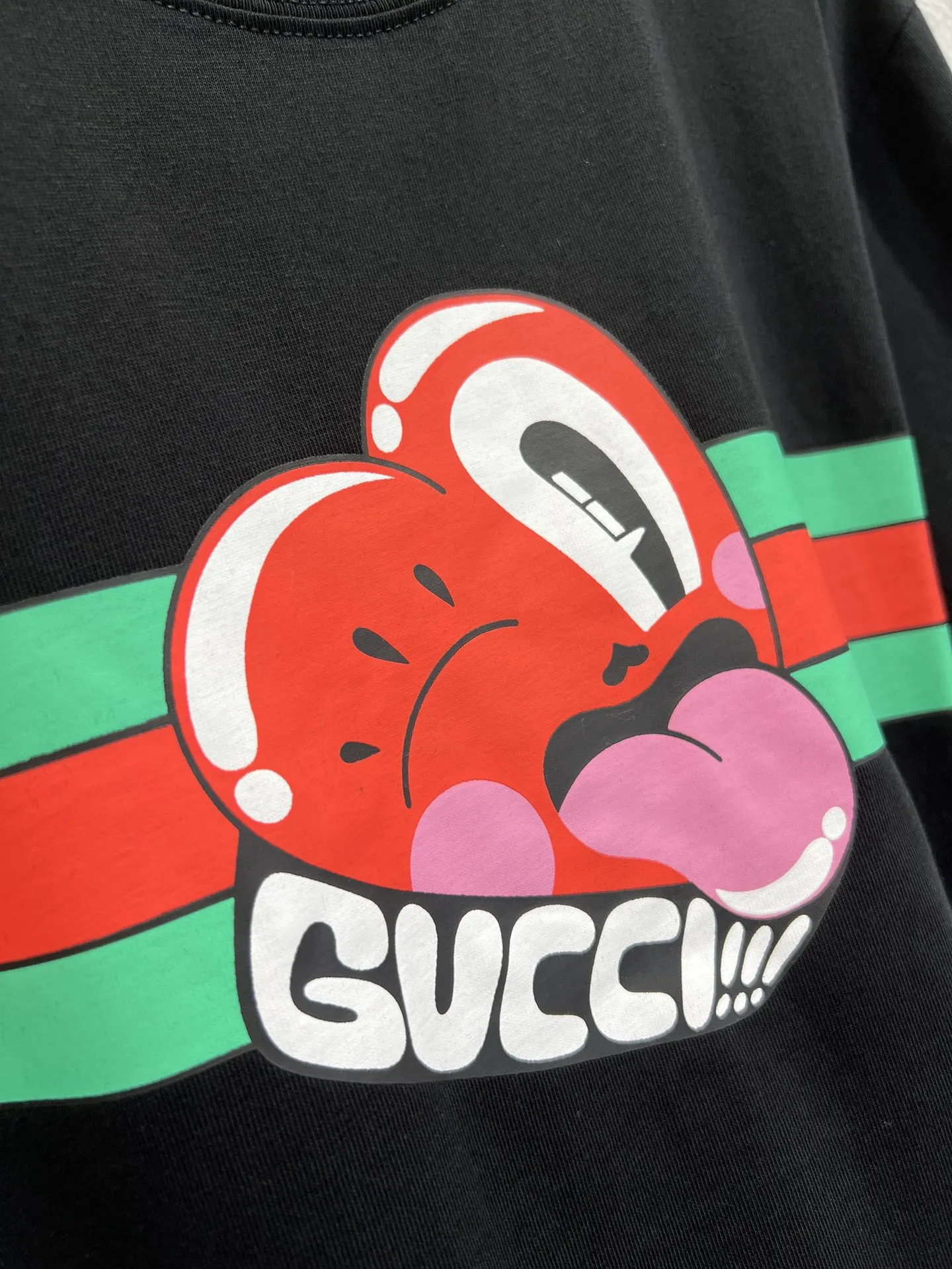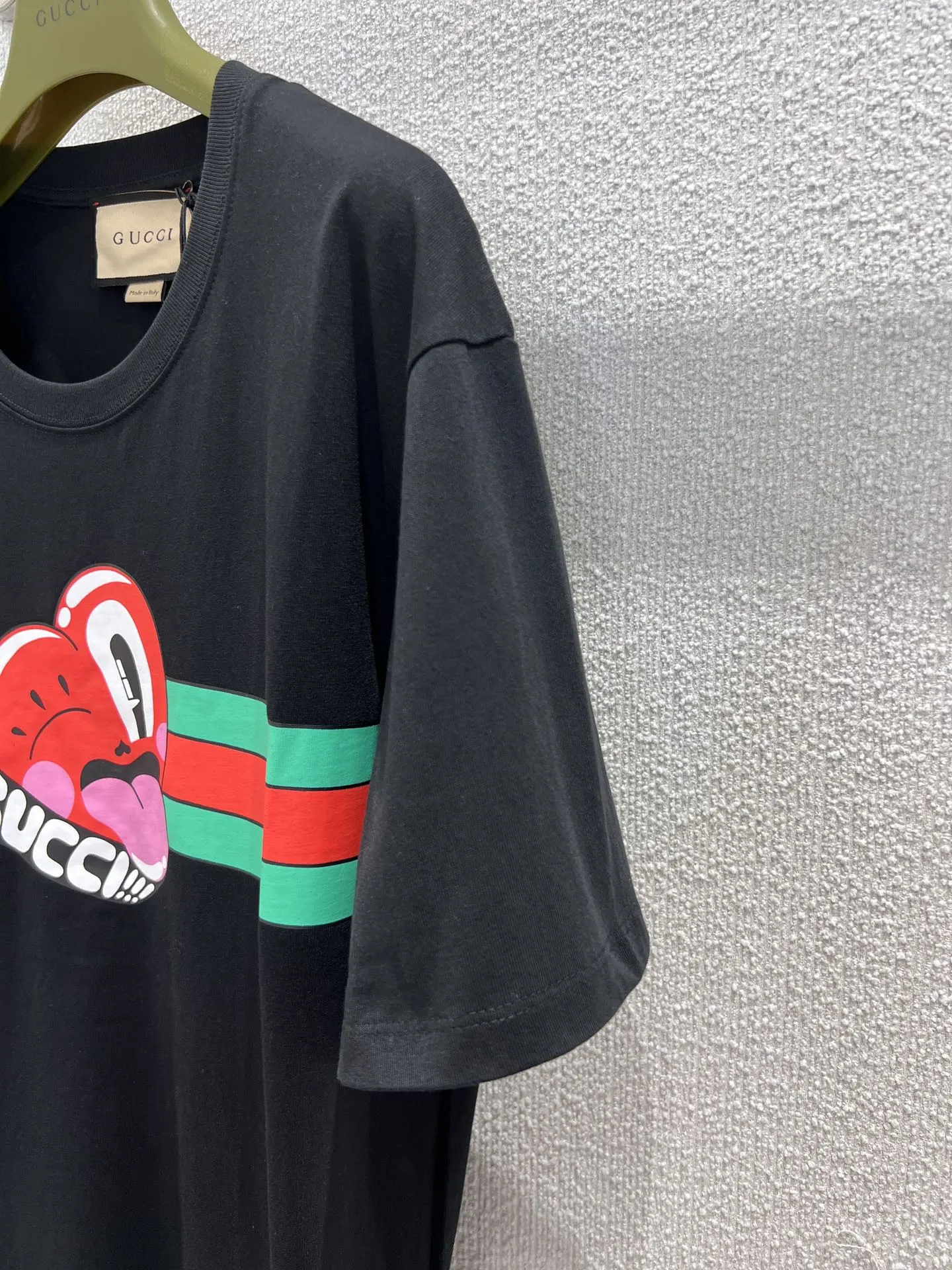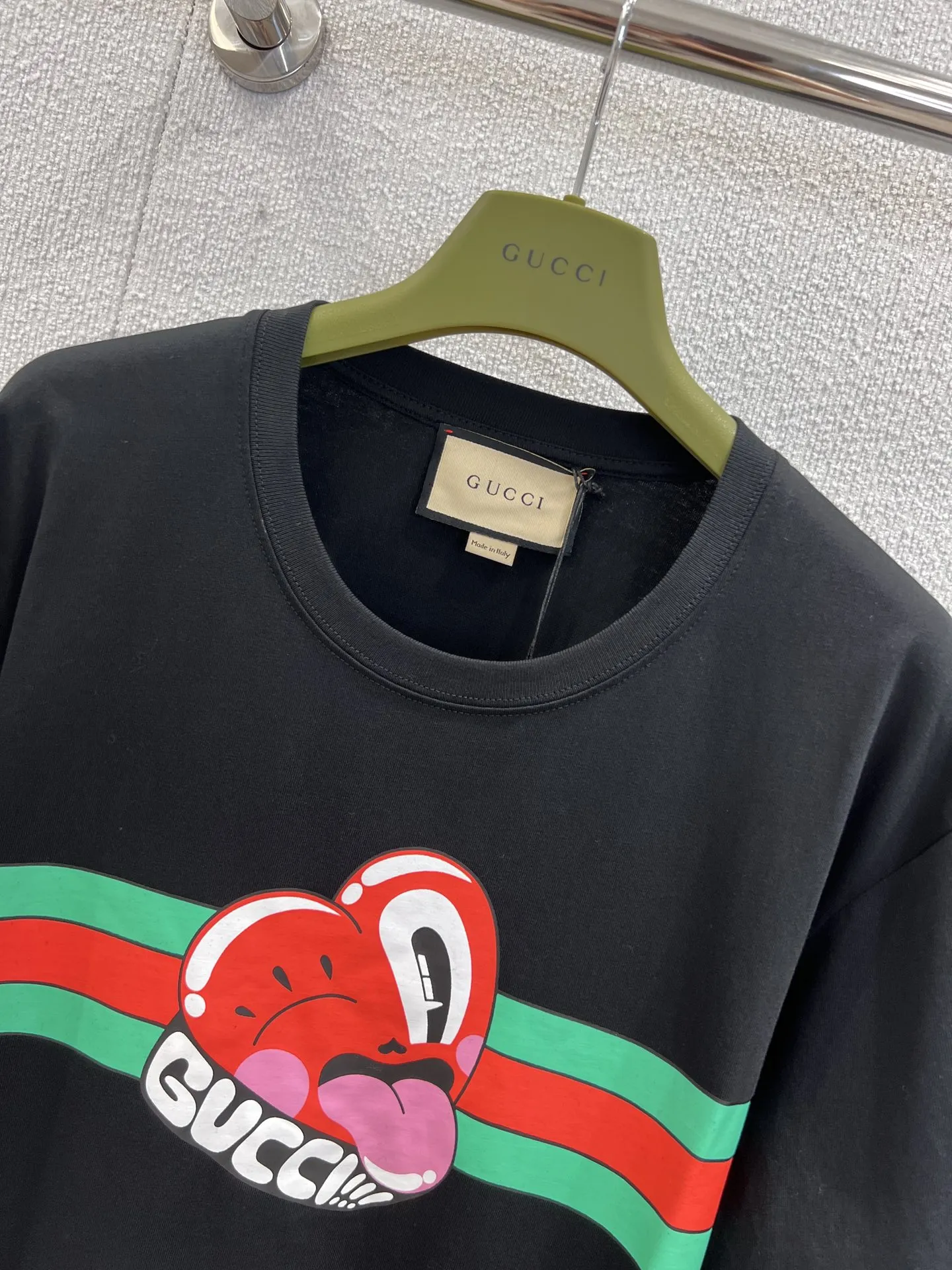 Gucciの2025年春夏新作、黒プリント半袖Tシャツです。ハティ・スチュワートのアートワークが胸元に施され、心形とリボンのプリントが特徴的。黒色のニットコットン素材で、ラウンドネックとリブ編みの襟と裾が上品な印象を与えます。ゆったりとしたシルエットで、男女兼用。S/M/Lサイズの即納が可能です。おしゃれなデザインの Tシャツ スーパーコピー をお探しの方にもおすすめです。