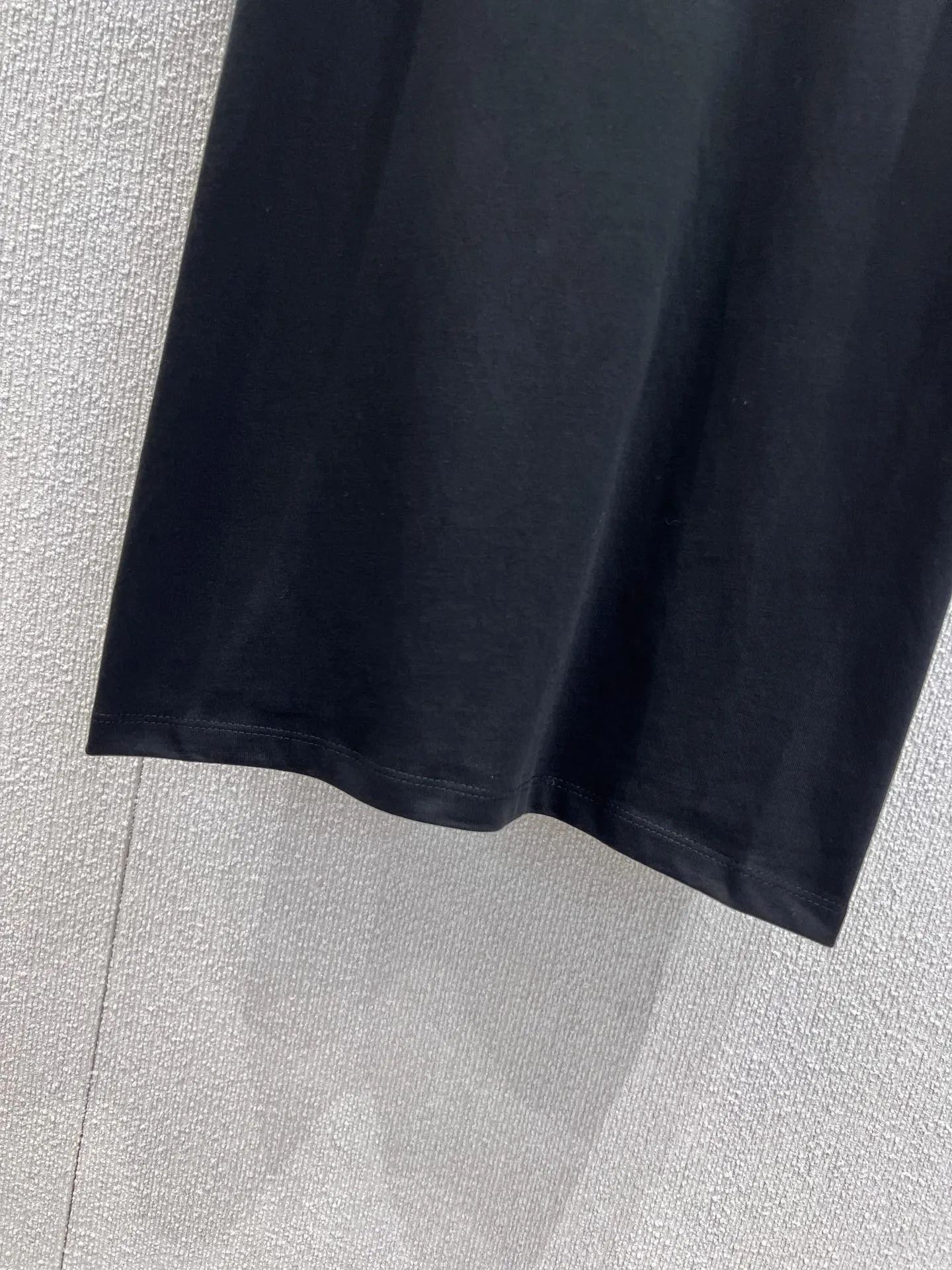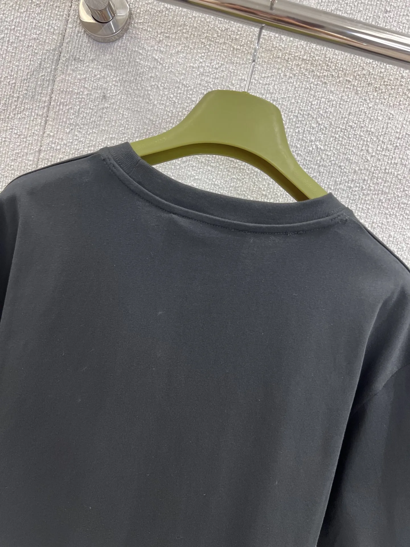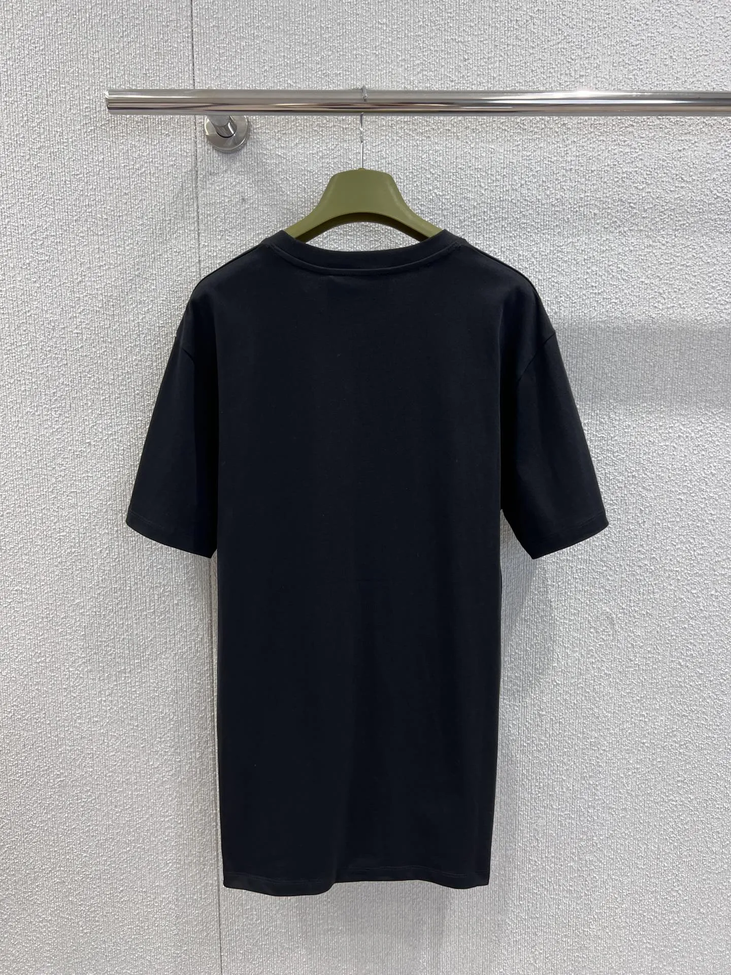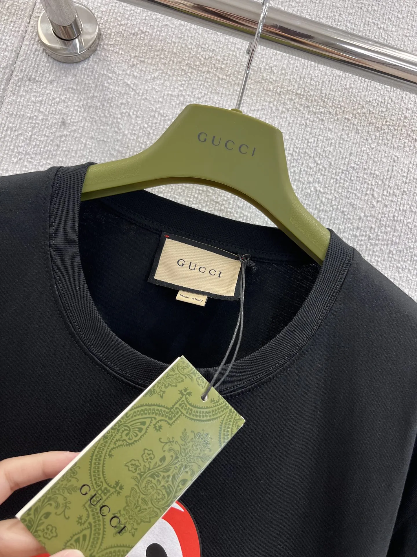 Gucciの2025年春夏新作、黒プリント半袖Tシャツです。ハティ・スチュワートのアートワークが胸元に施され、心形とリボンのプリントが特徴的。黒色のニットコットン素材で、ラウンドネックとリブ編みの襟と裾が上品な印象を与えます。ゆったりとしたシルエットで、男女兼用。S/M/Lサイズの即納が可能です。おしゃれなデザインの Tシャツ スーパーコピー をお探しの方にもおすすめです。