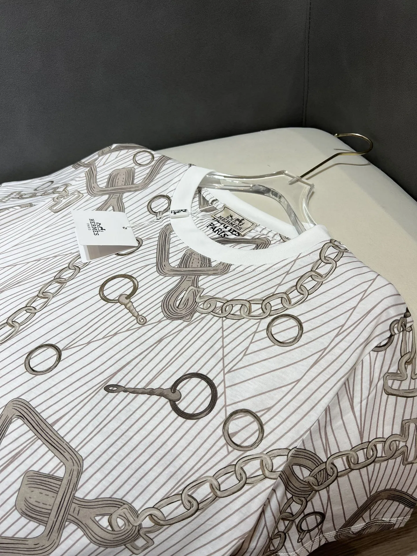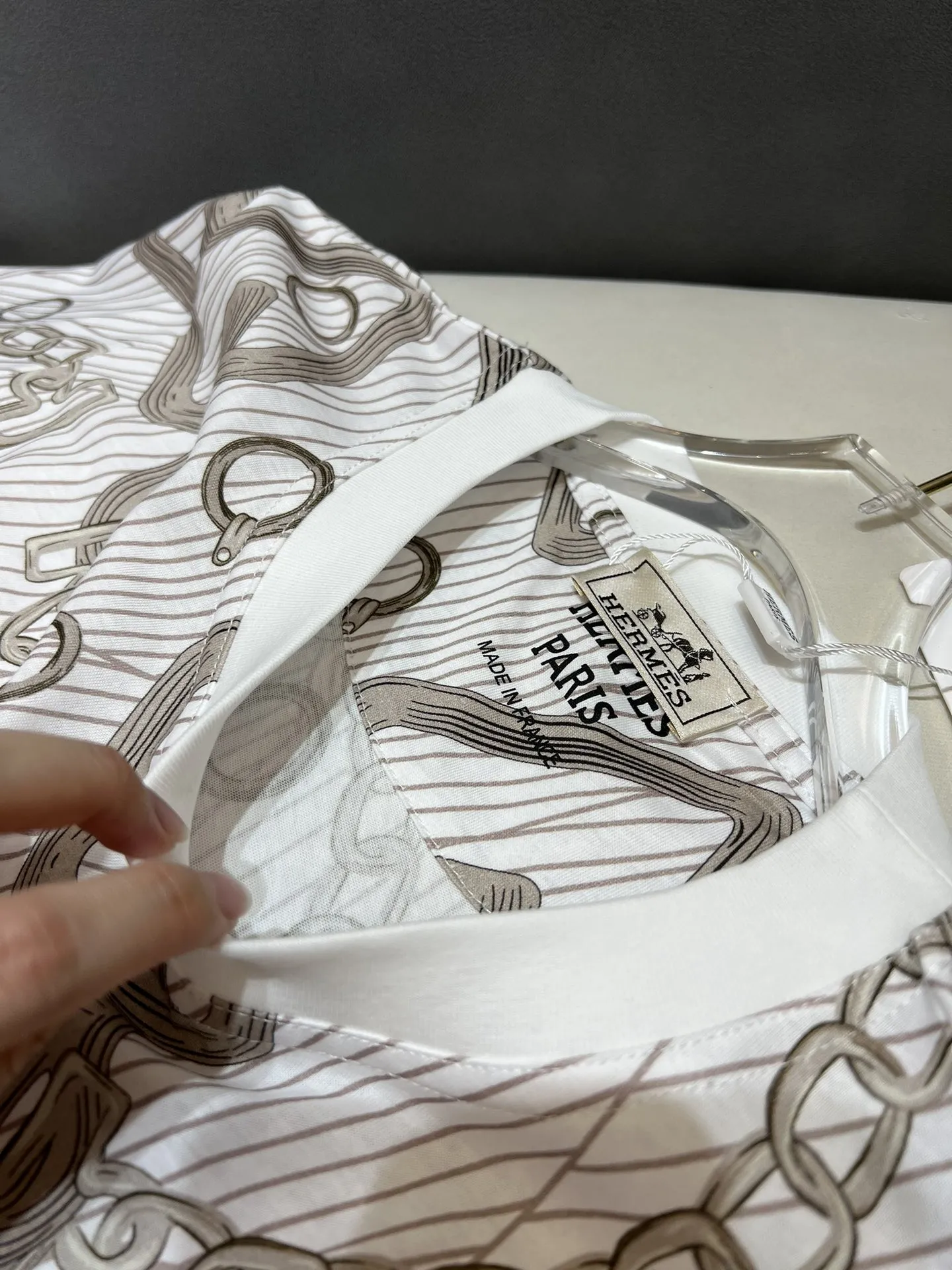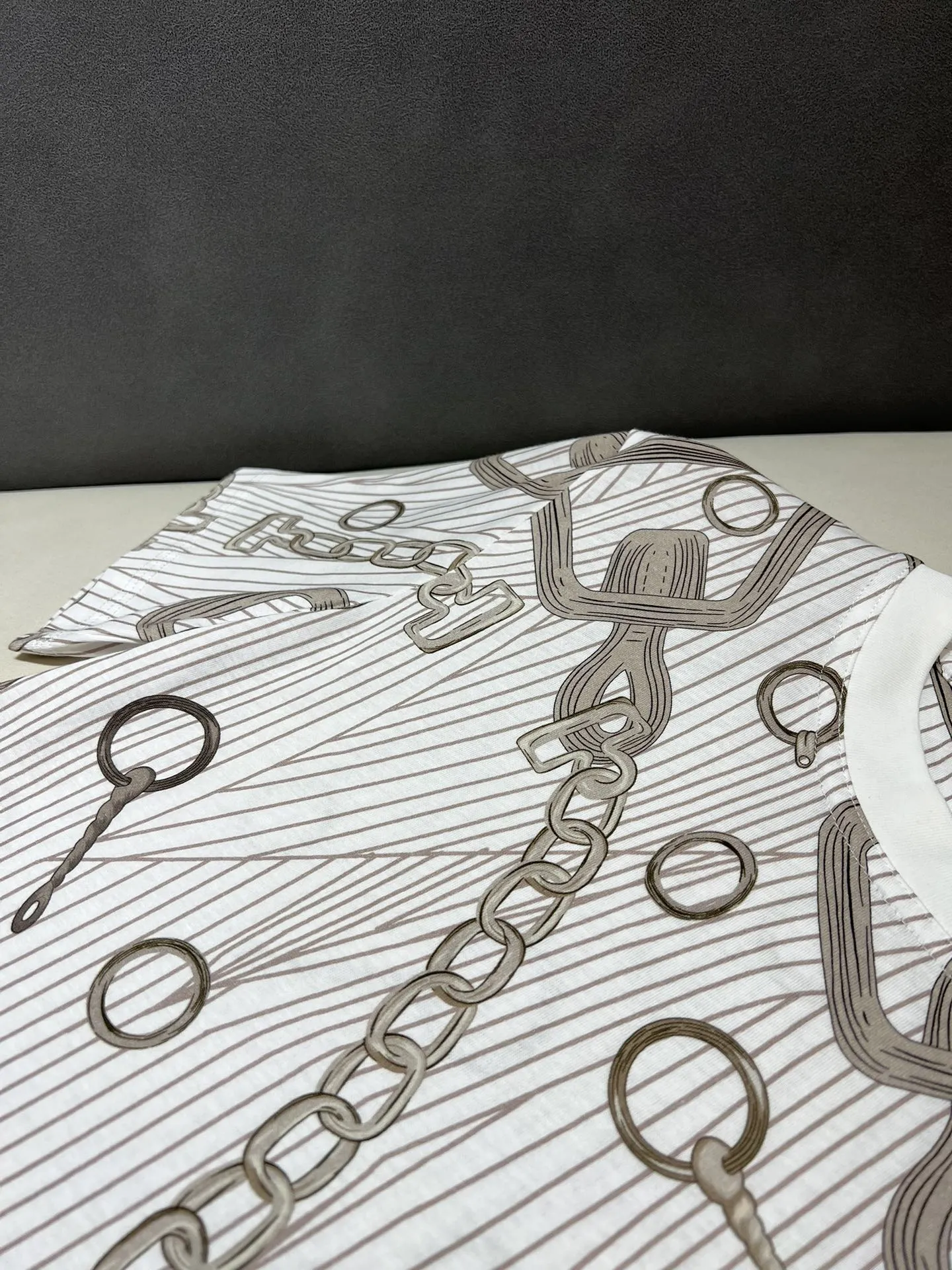HER2024春夏新作のホワイトストライプブレスレットTシャツです。全棉素材を使用し、透気性が高く、快適な着心地を提供します。丸首落ち肩デザインで、成衣定位活性プリントにより異なるブレスレット柄が施されています。高級感とアート性を兼ね備えたデザインで、日常の街着に最適です。トレンドのスタイルをお探しの方には、Tシャツ スーパーコピーもおすすめです。