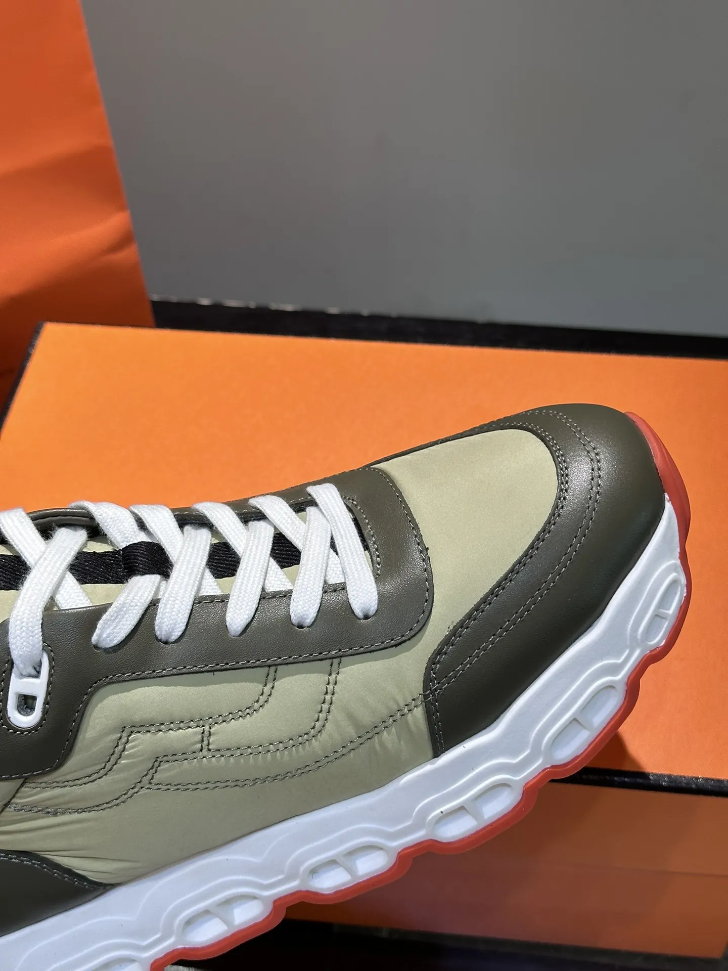 HERMESのHugo厚底スニーカーは、多素材のパッチワークとコントラストカラーが特徴的なデザインです。牛革ライニングとインソールが快適な履き心地を提供し、透湿性にも優れています。幾何学模様のゴムソールと象徴的な「H」ディテールが個性を引き立て、スニーカー スーパー コピーとしても注目される一足です。