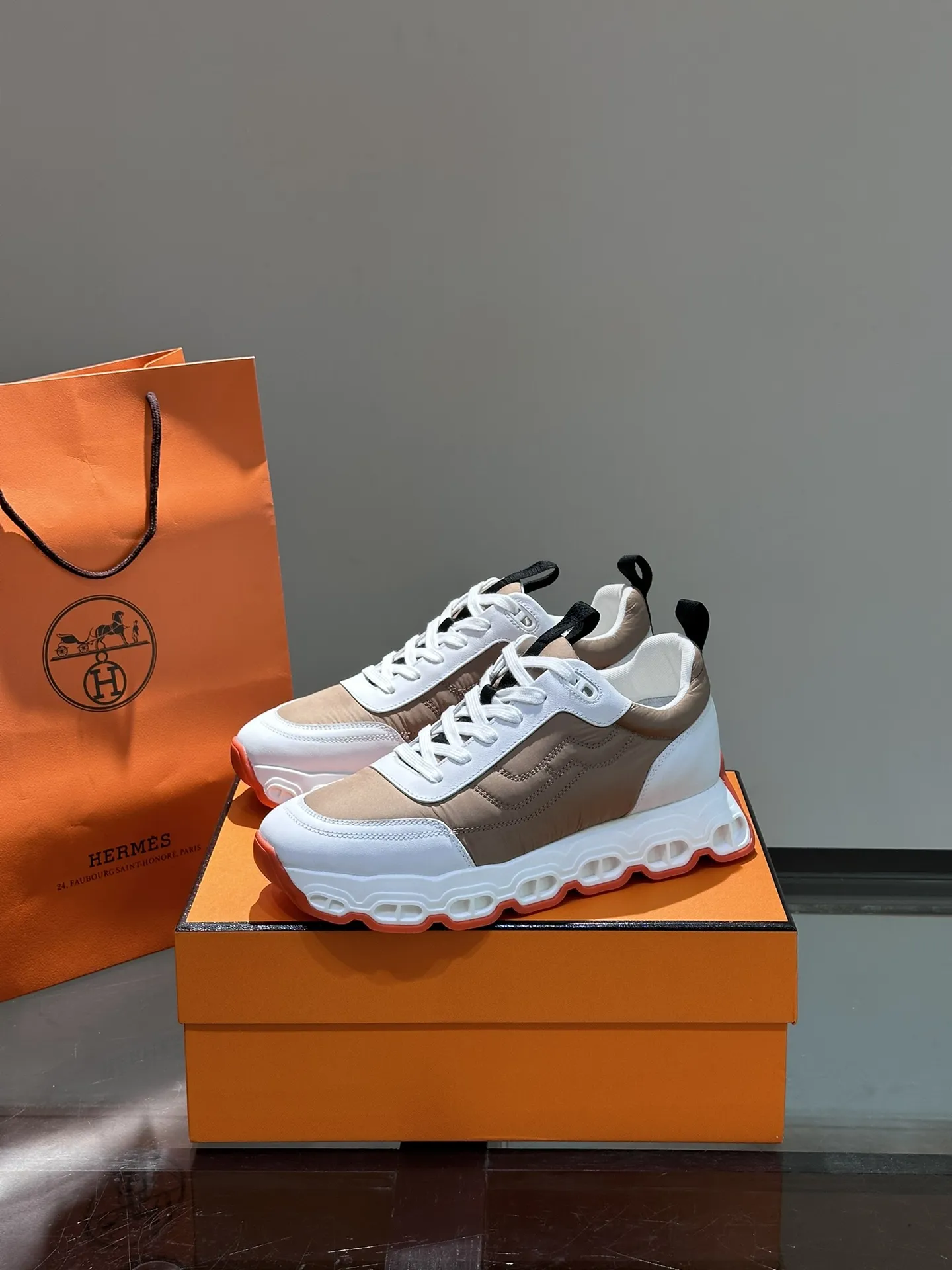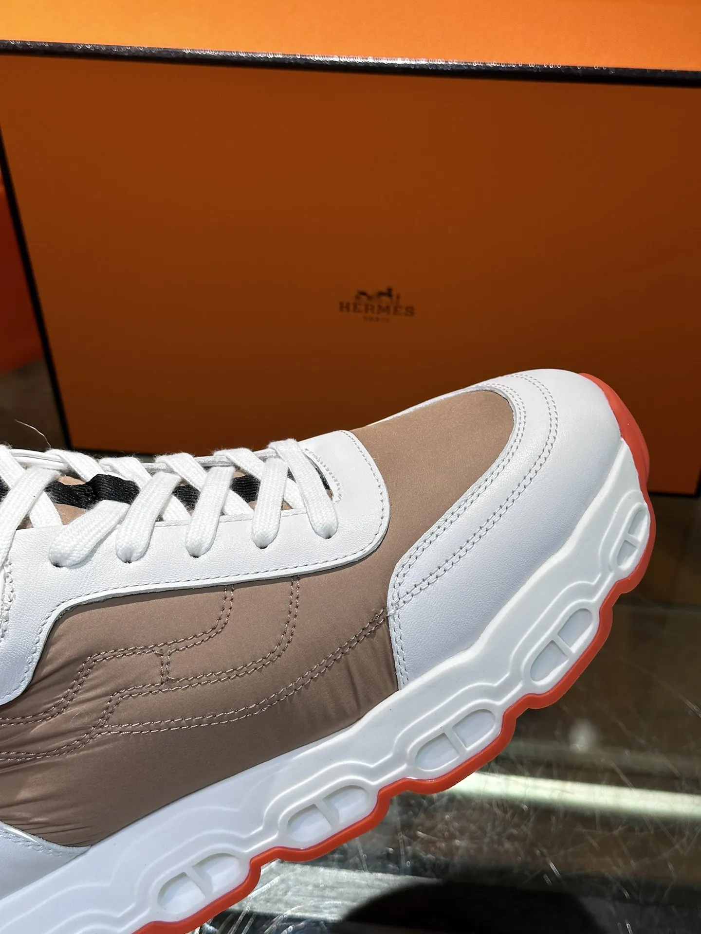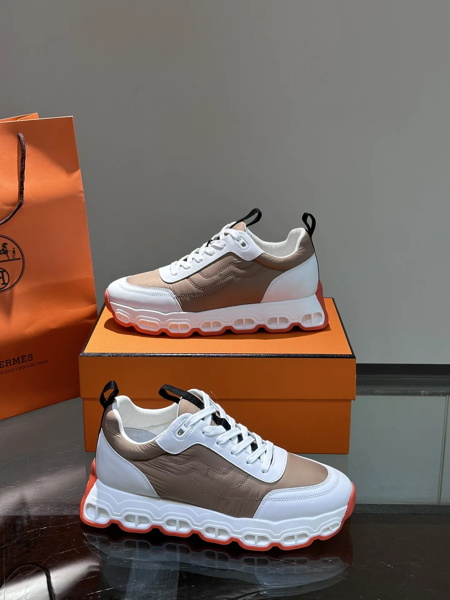 HERMESのHugo厚底スニーカーは、ホワイトとブラウンのコントラストが際立つデザインで、多素材のパッチワークが現代的な動感を演出します。シューズトゥには天然色のゴム装飾が施され、牛革ライニングとインソールが快適な履き心地を提供します。幾何学模様のゴムソールと「H」ディテールが個性を引き立て、スニーカー スーパー コピーとしても注目される一足です。