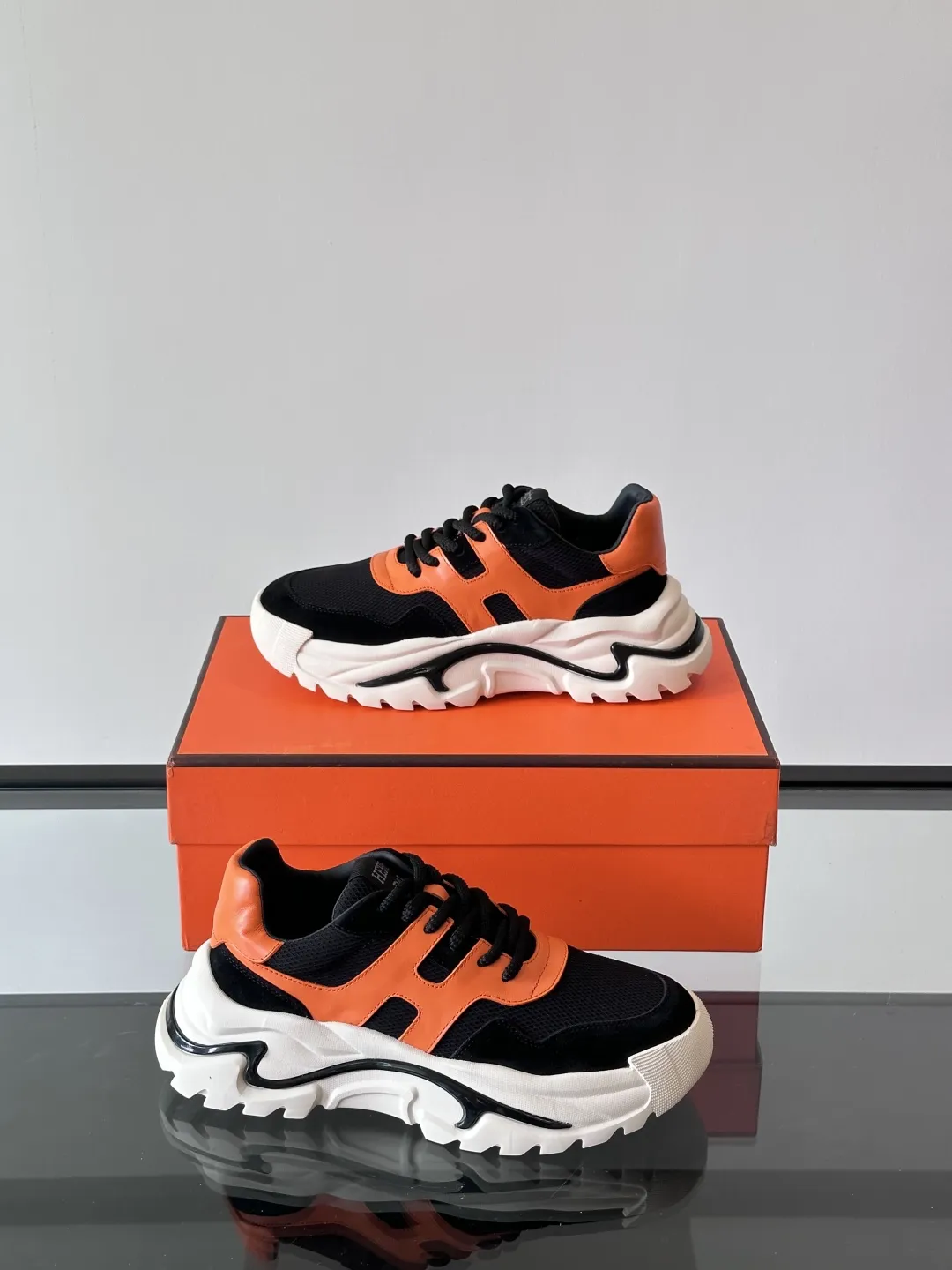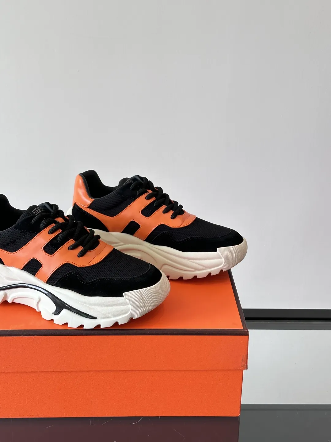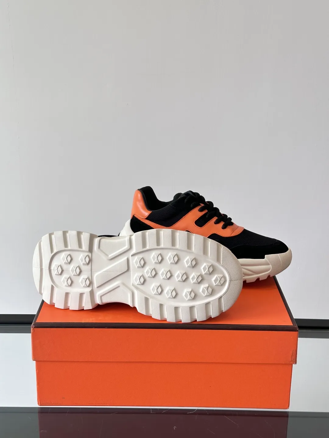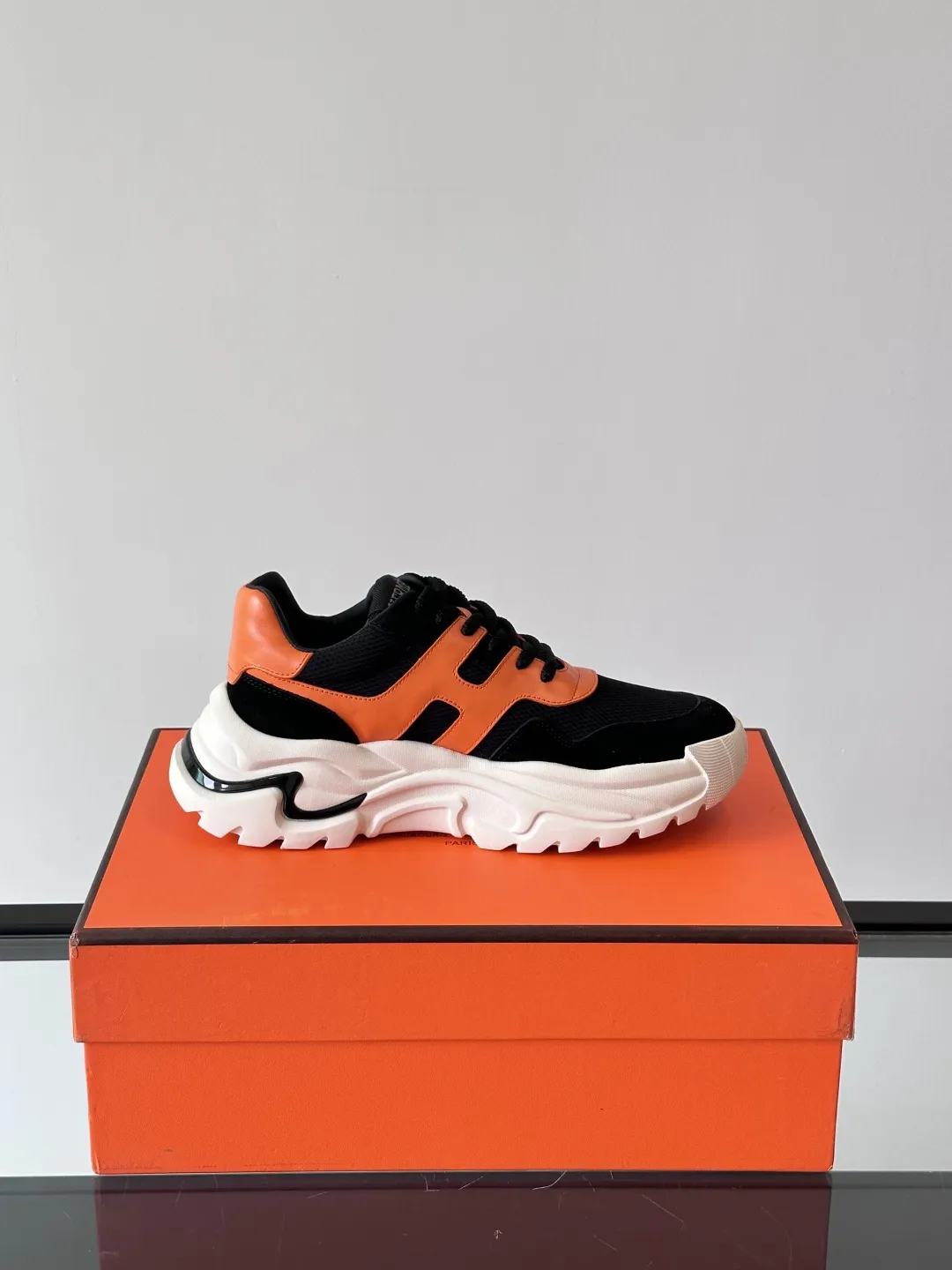 HERMESのHugo厚底スニーカーは、オレンジとブラックのコントラストカラーが印象的なデザインです。高品質な牛革素材を使用し、牛革内張りとインソールで快適さを追求。厚底ソールと幾何学模様のゴム底が現代的なスタイルを演出します。特徴的な「H」のロゴが個性を引き立て、スニーカー スーパー コピーとしても注目される一足です。