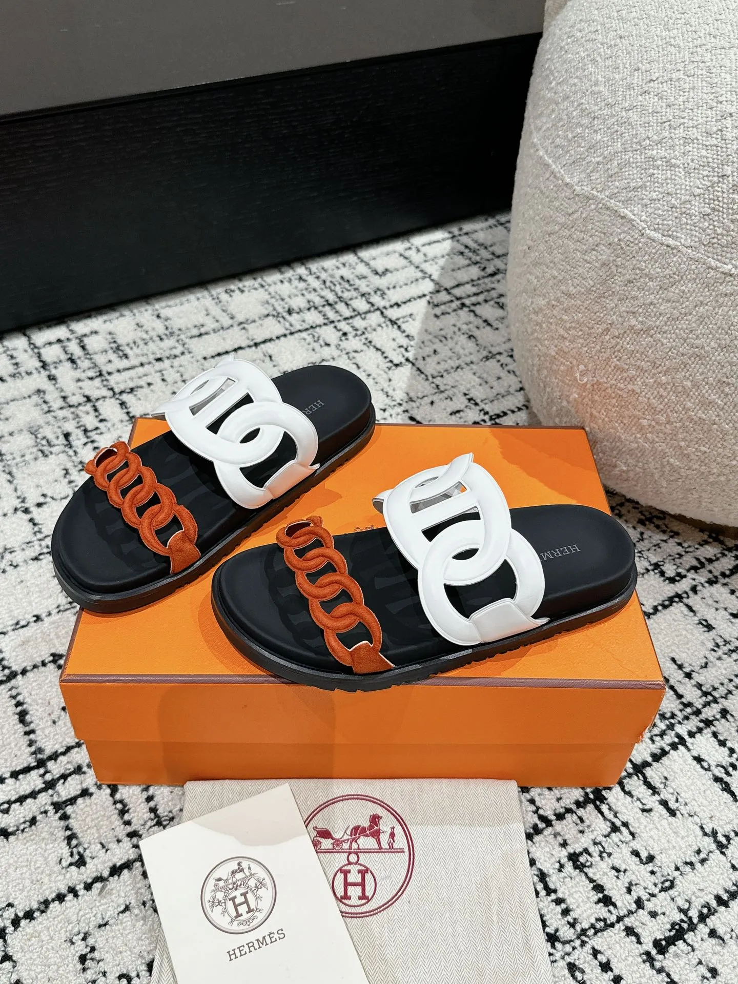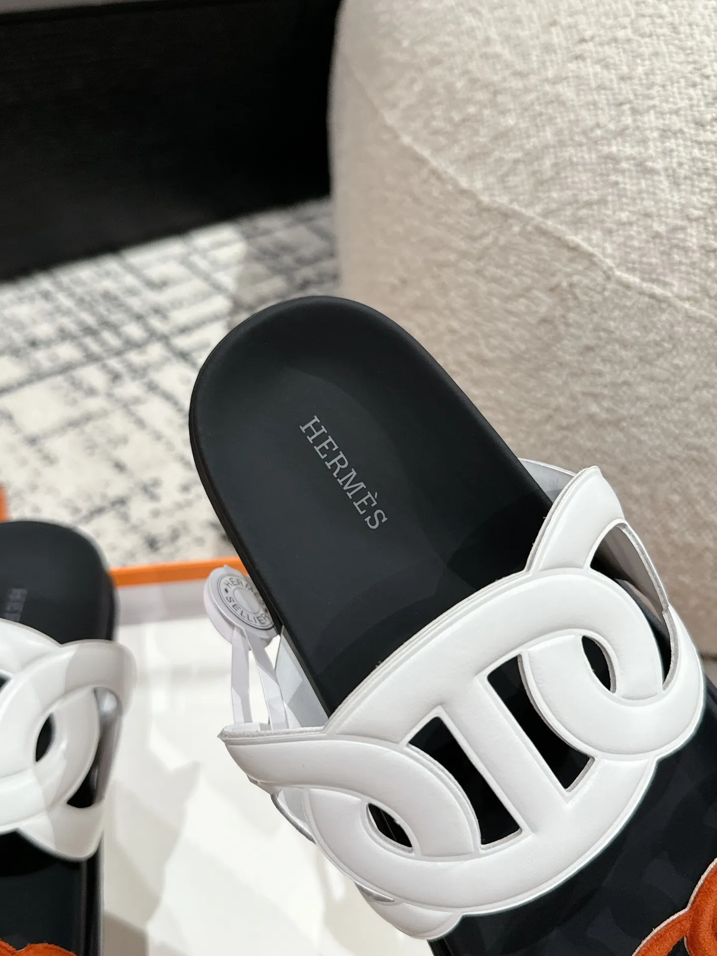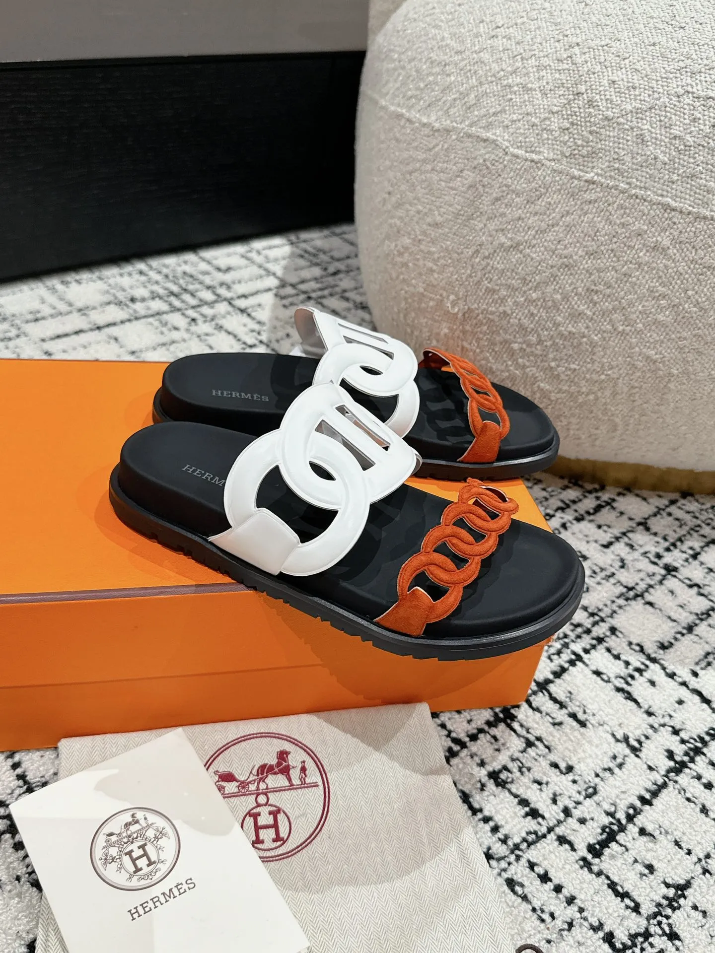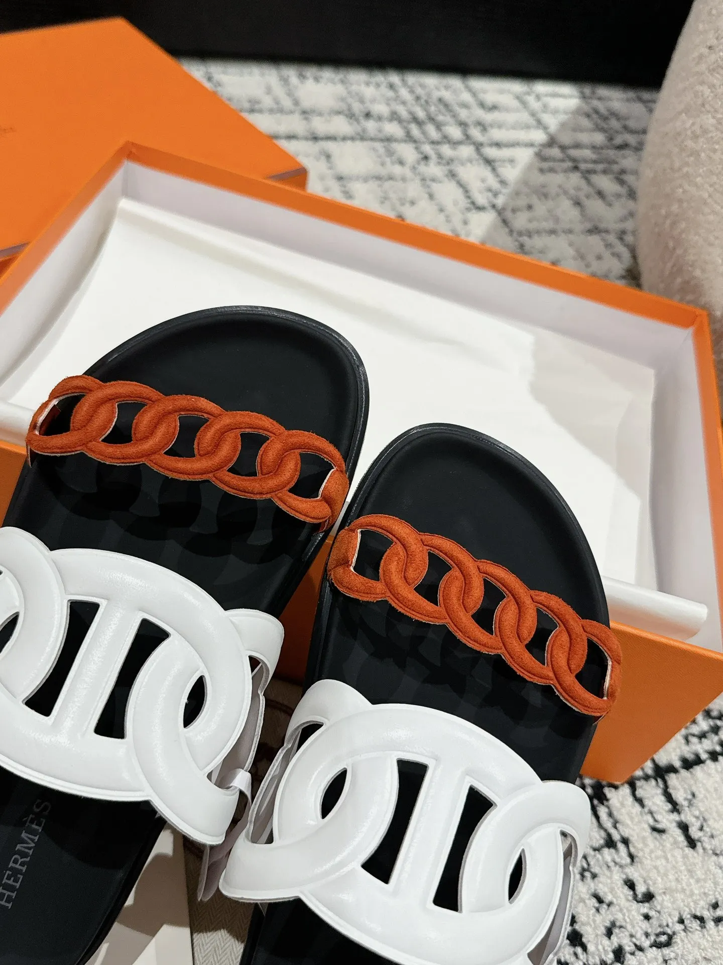 HERMES 新作豚鼻デザインの二舅ミュール ホワイトとオレンジ