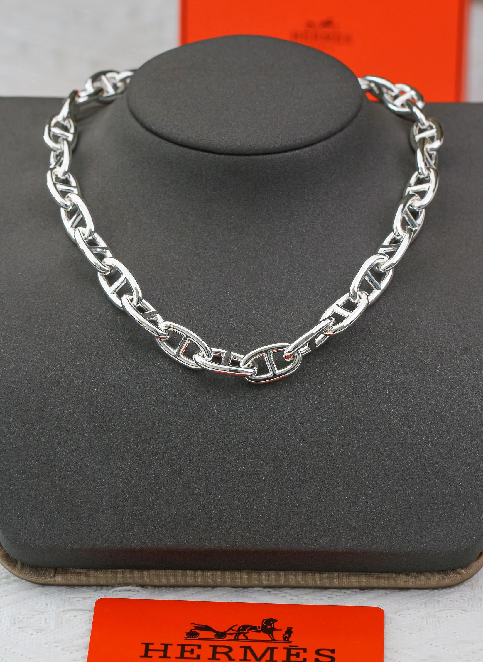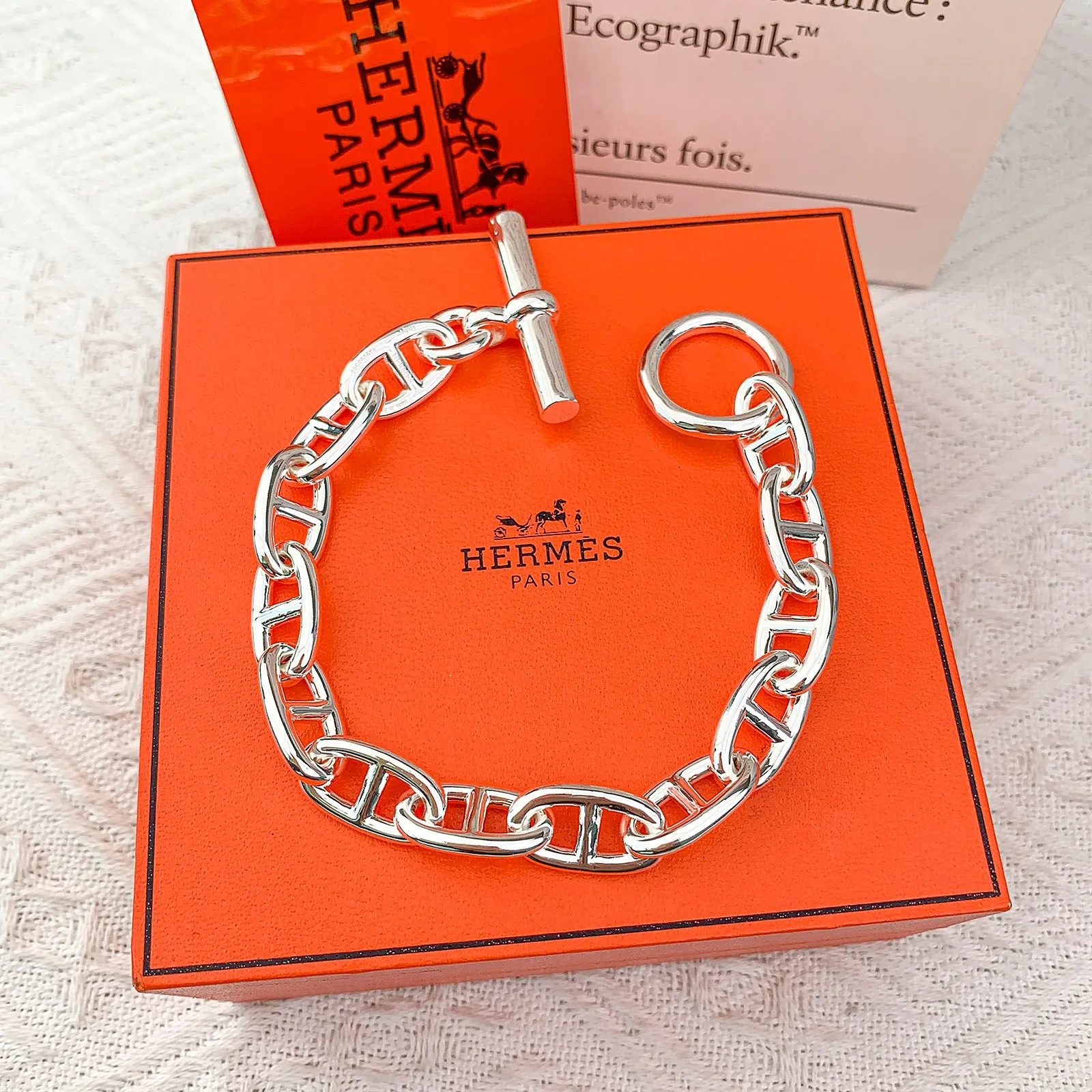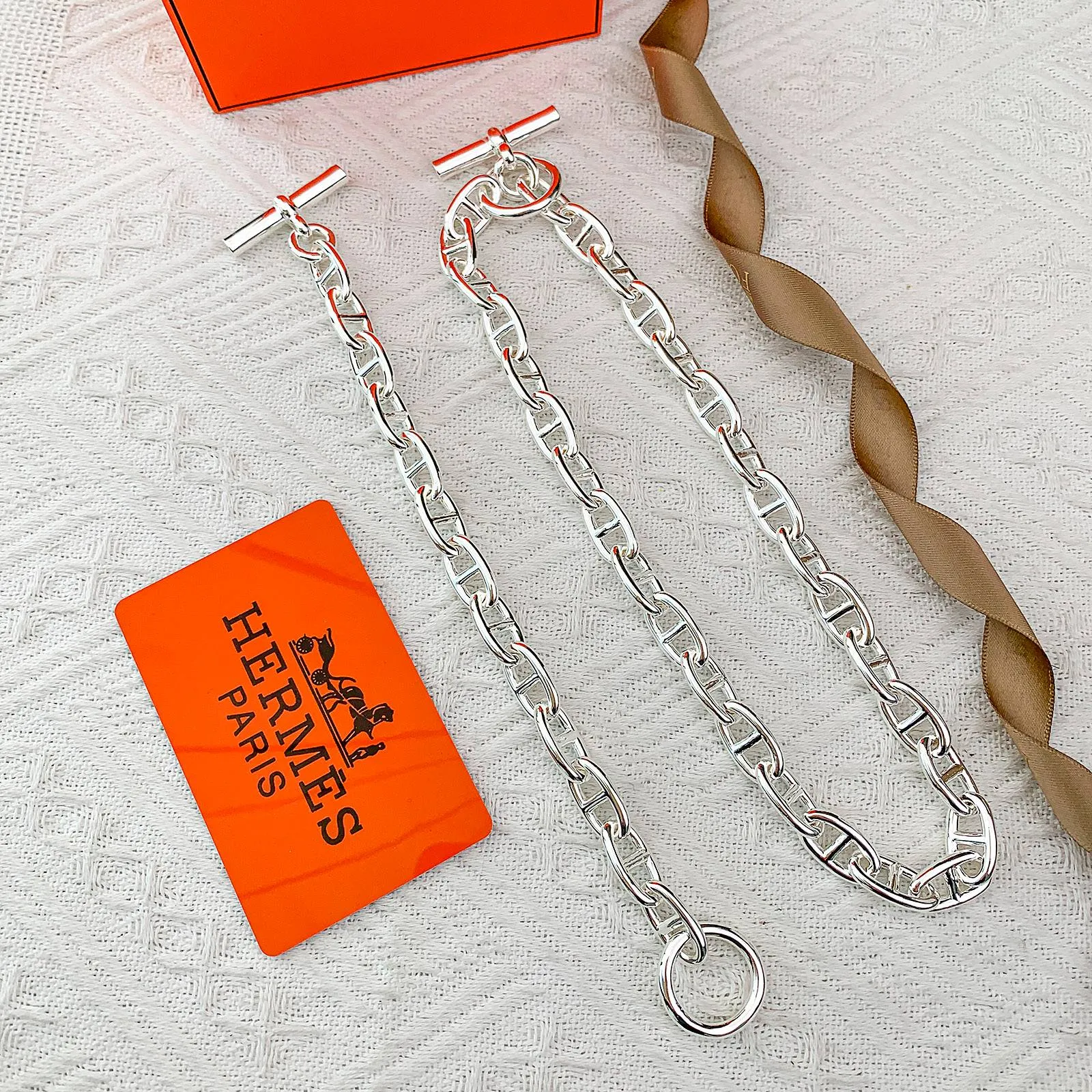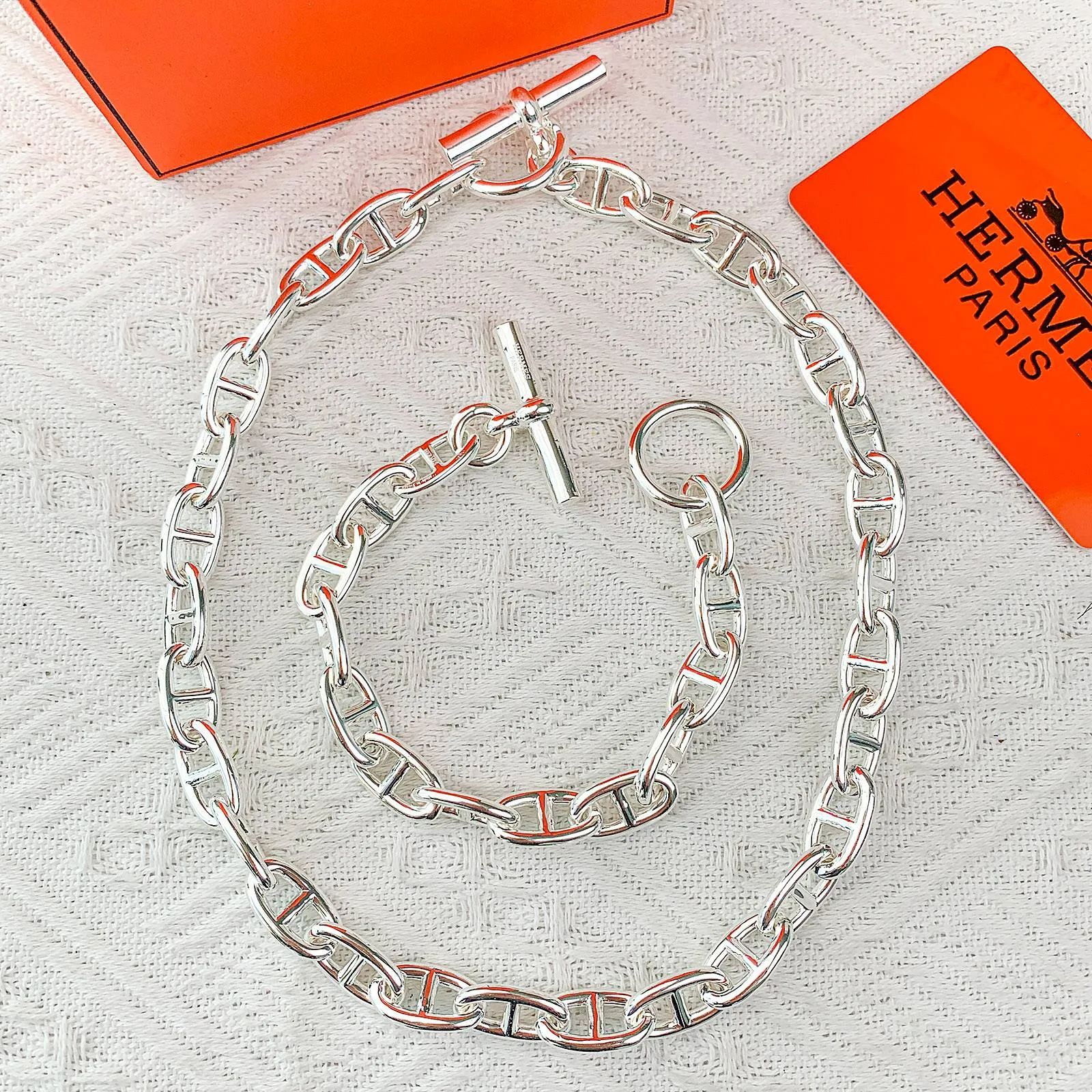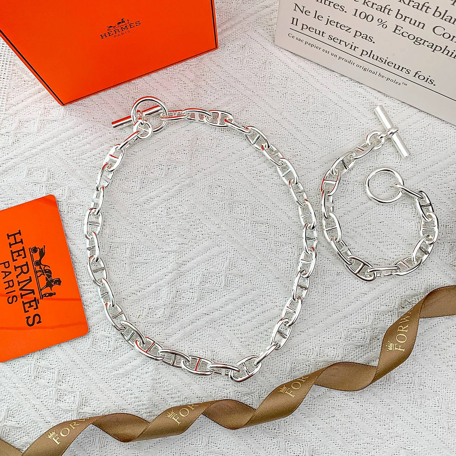 HERMÈSのシルバー粗ネックレスとブレスレットのセットです。猪鼻子デザインが特徴で、シンプルながらも高級感を演出します。素材は高品質なシルバーで、耐久性と美しさを兼ね備えています。ネックレスは約50cm、ブレスレットは約19cmの長さで、男女問わずお使いいただけます。高級感あふれるオレンジボックスに入っており、ギフトにも最適です。類似品や偽物に注意しながら、本物のHERMÈS製品をお楽しみください。