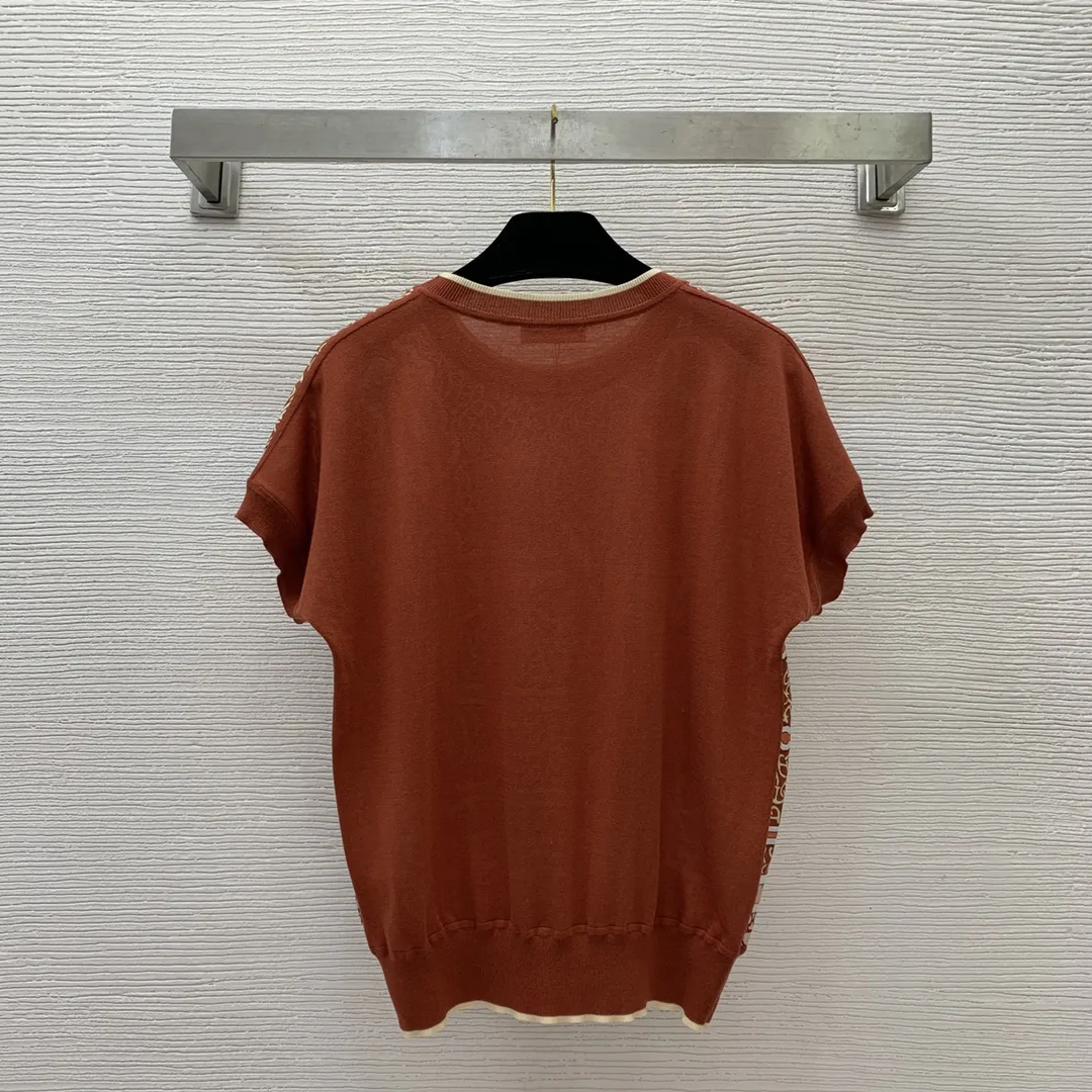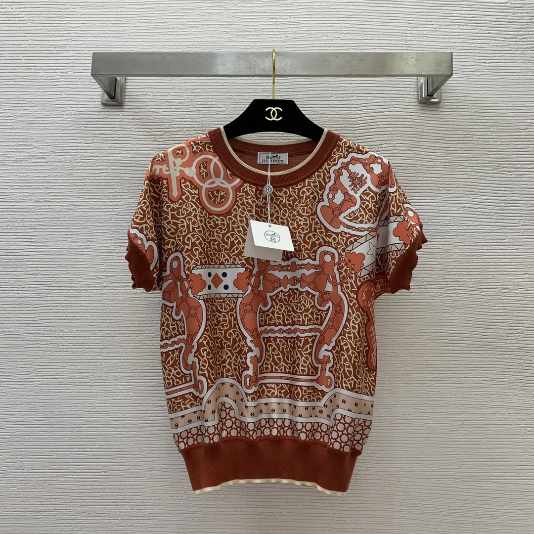 Hermèsの2024年春夏新作、ブルー半袖ニットトップスです。前身頃には19ミリの100%シルク斜纹絹を使用し、後身頃にはニット生地を組み合わせました。フルプリントの豚鼻チェーンプリントが特徴的なラウンドネックデザインで、ショートスリーブのシンプルなスタイルです。ブルーとレッドブラウンの2色展開で、SからXLまでのサイズをご用意しています。高級感あふれる一着をぜひお楽しみください。Hermèsの魅力を存分に味わえるアイテムとして、Tシャツ スーパーコピーをお探しの方にもおすすめです。