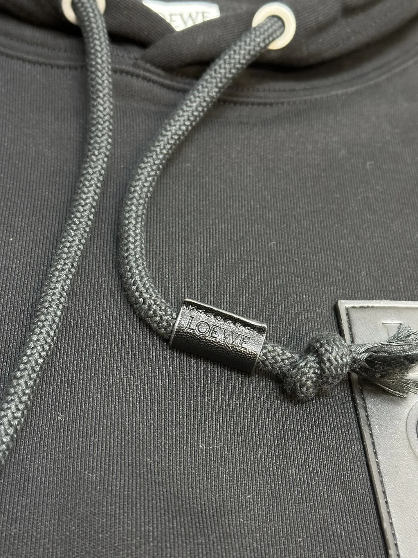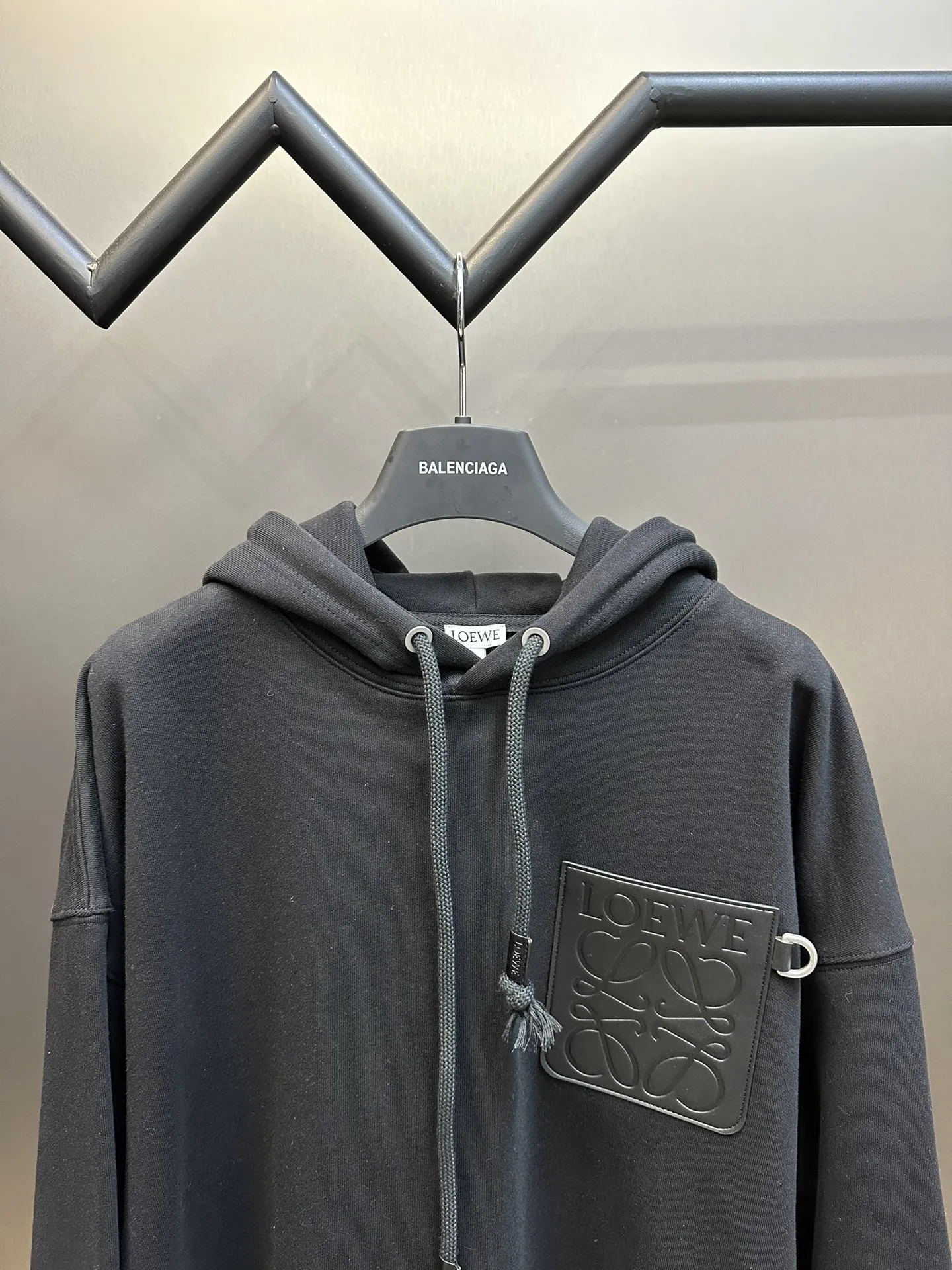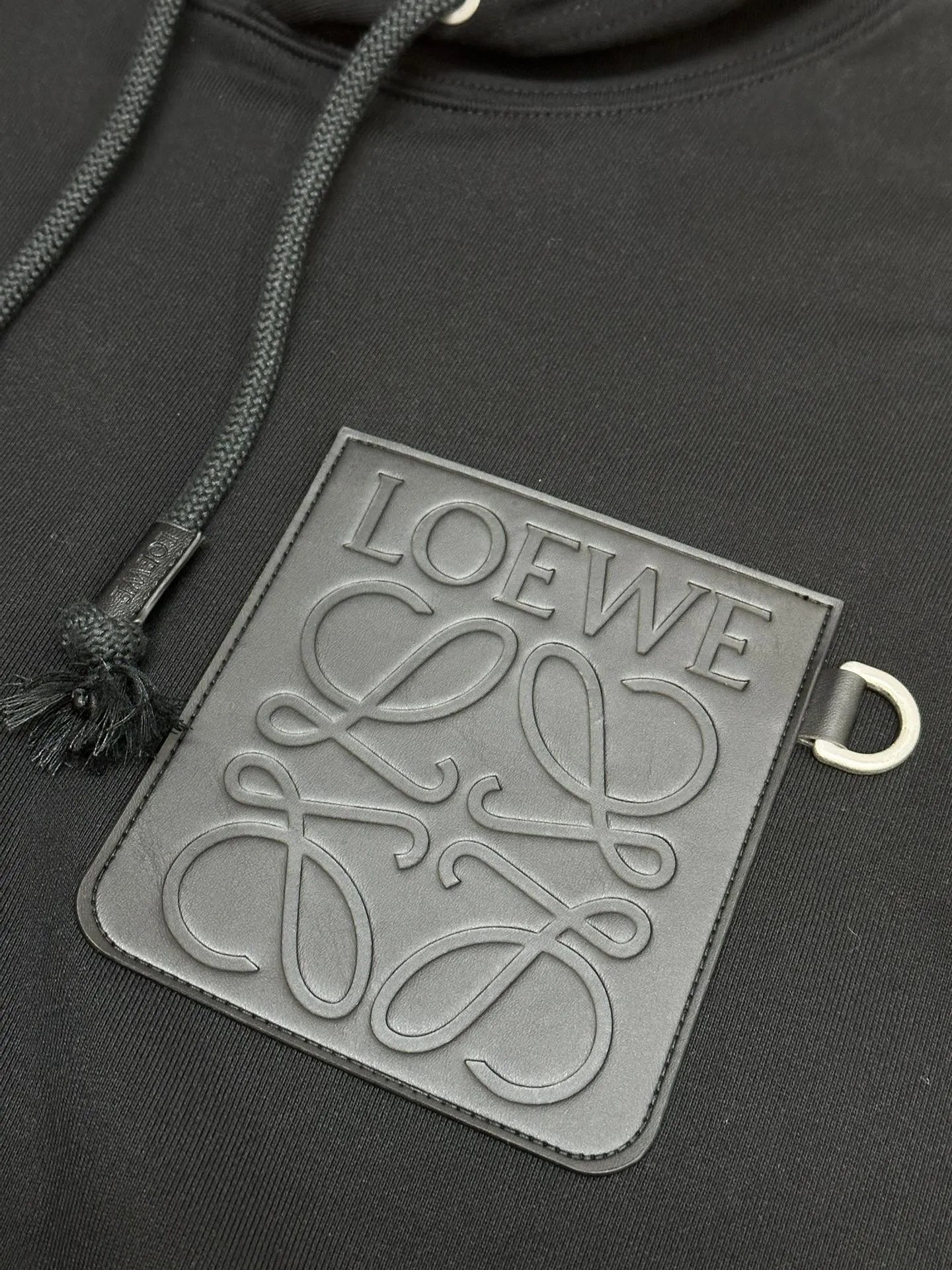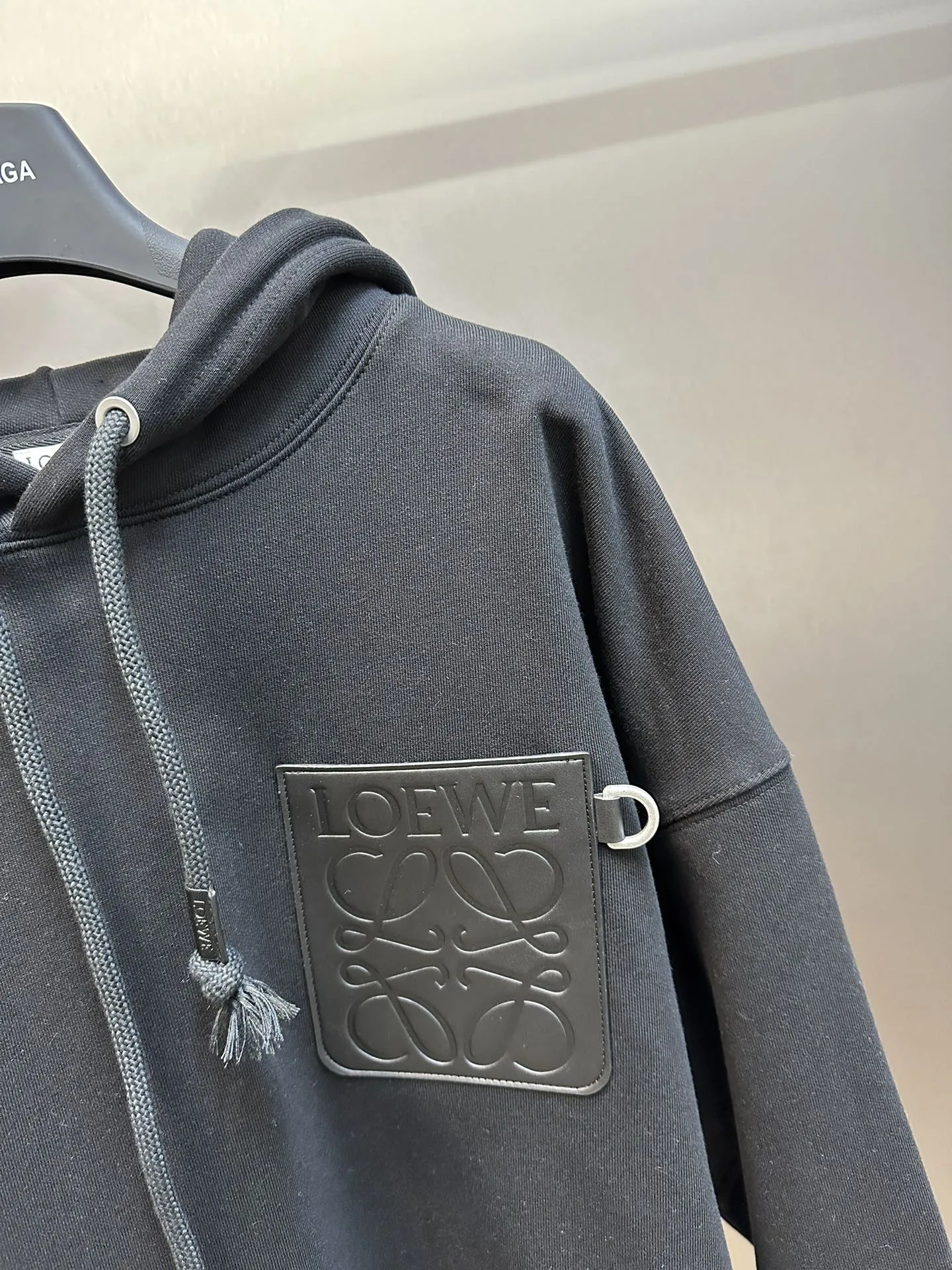 ロエベの2024年モデル、黒の皮革パッチフーディは、420グラムのダブルヤーン素材を使用し、柔らかく快適な着心地を提供します。胸元にはロエベのロゴが入ったレザーパッチが手作業で配置され、洗練された手触りを実現するために洗い加工が施されています。シンプルで洗練されたデザインが特徴で、スーパー コピーのような高品質なアイテムをお探しの方にもおすすめです。