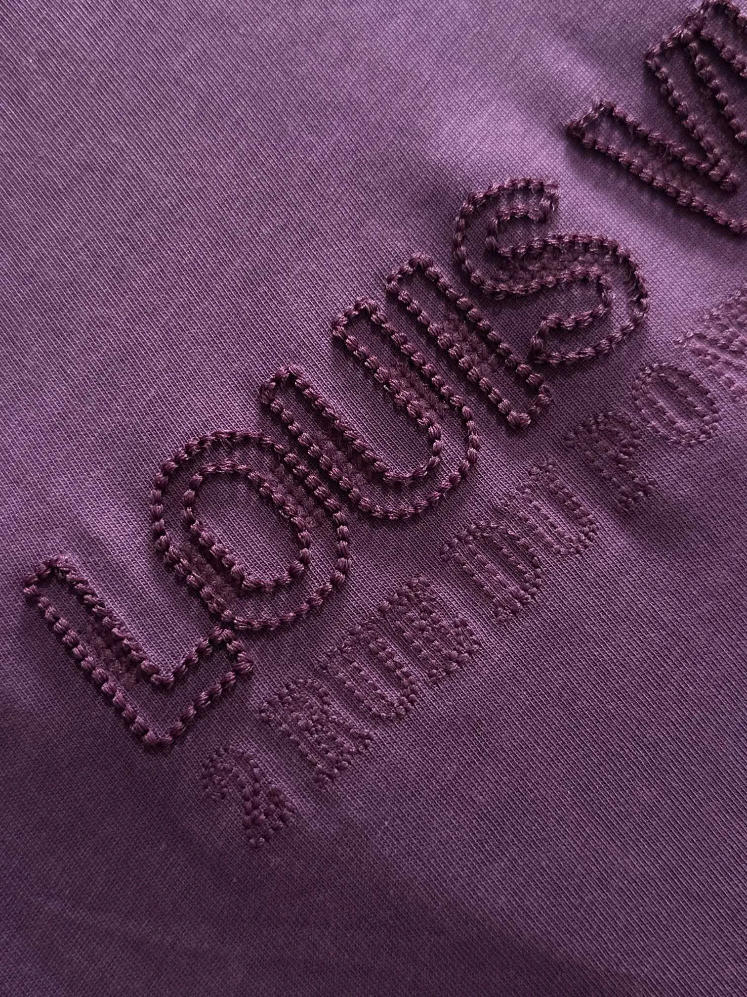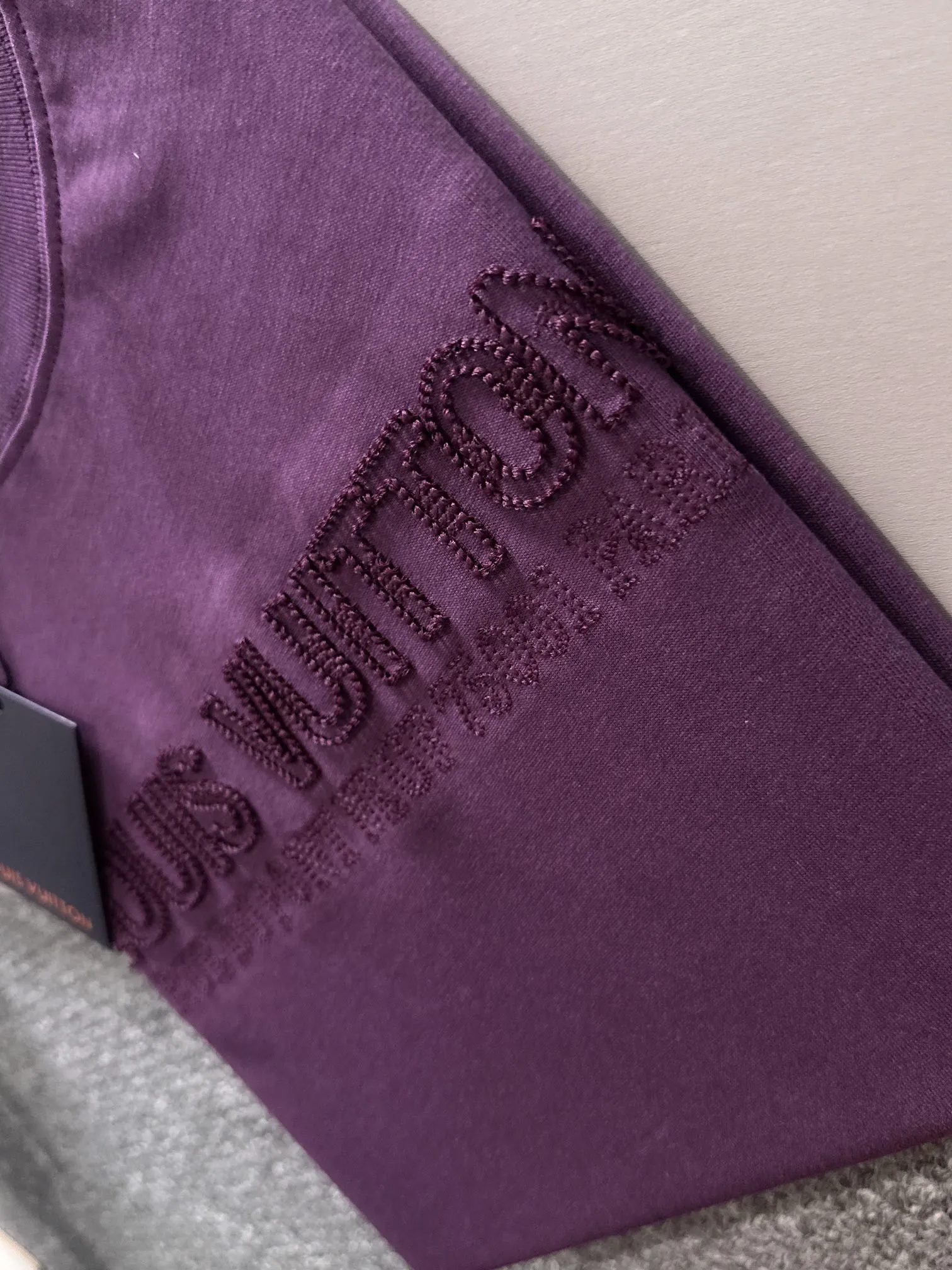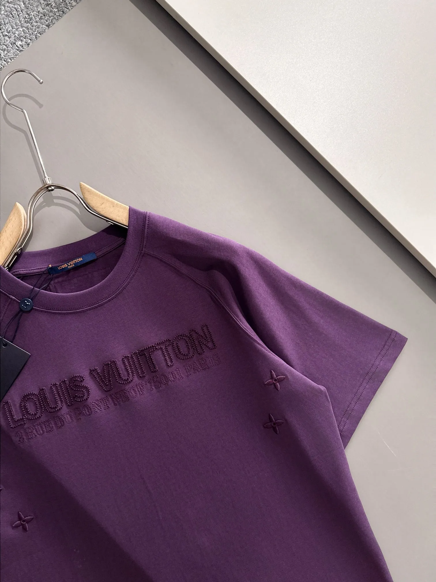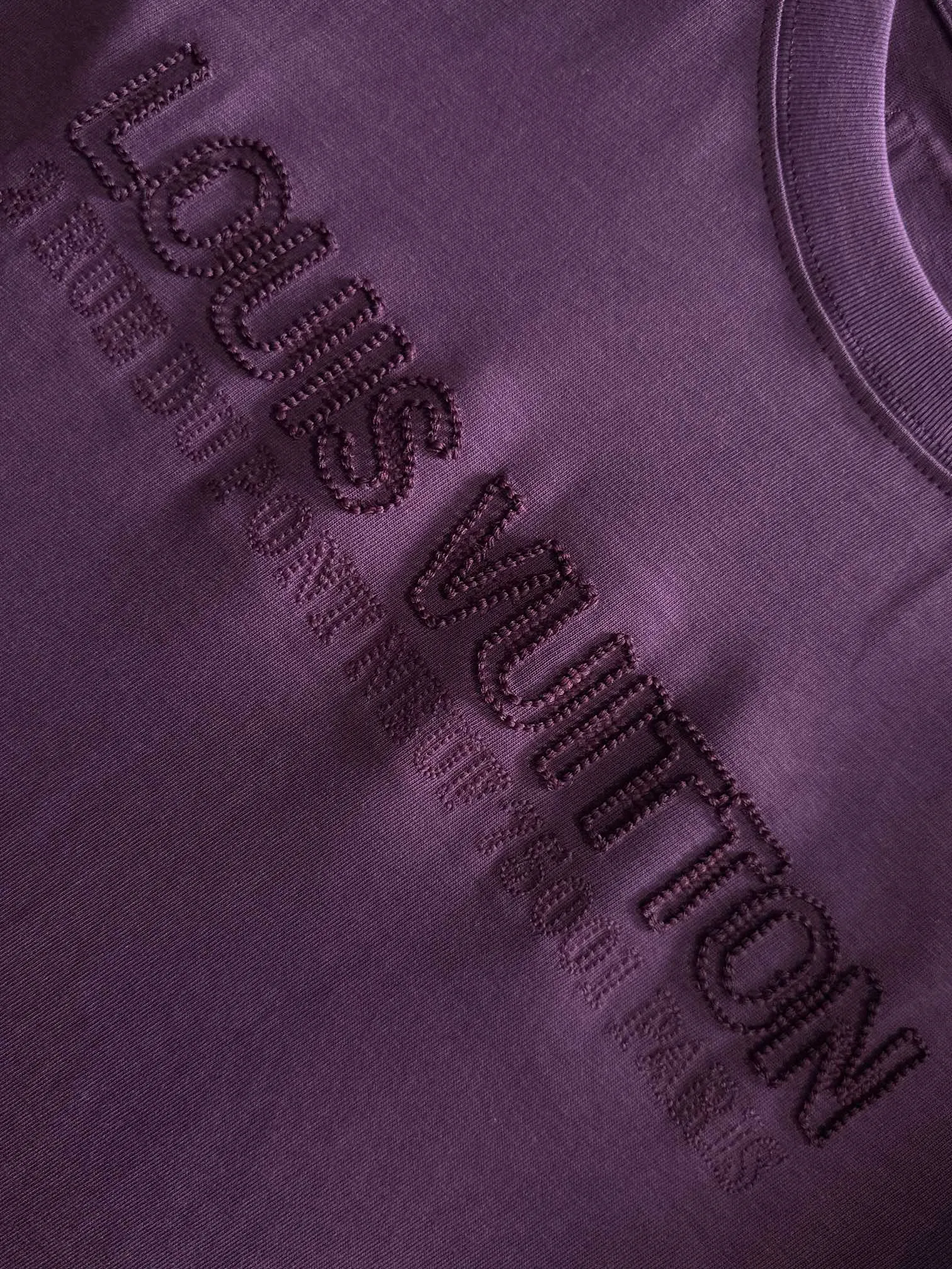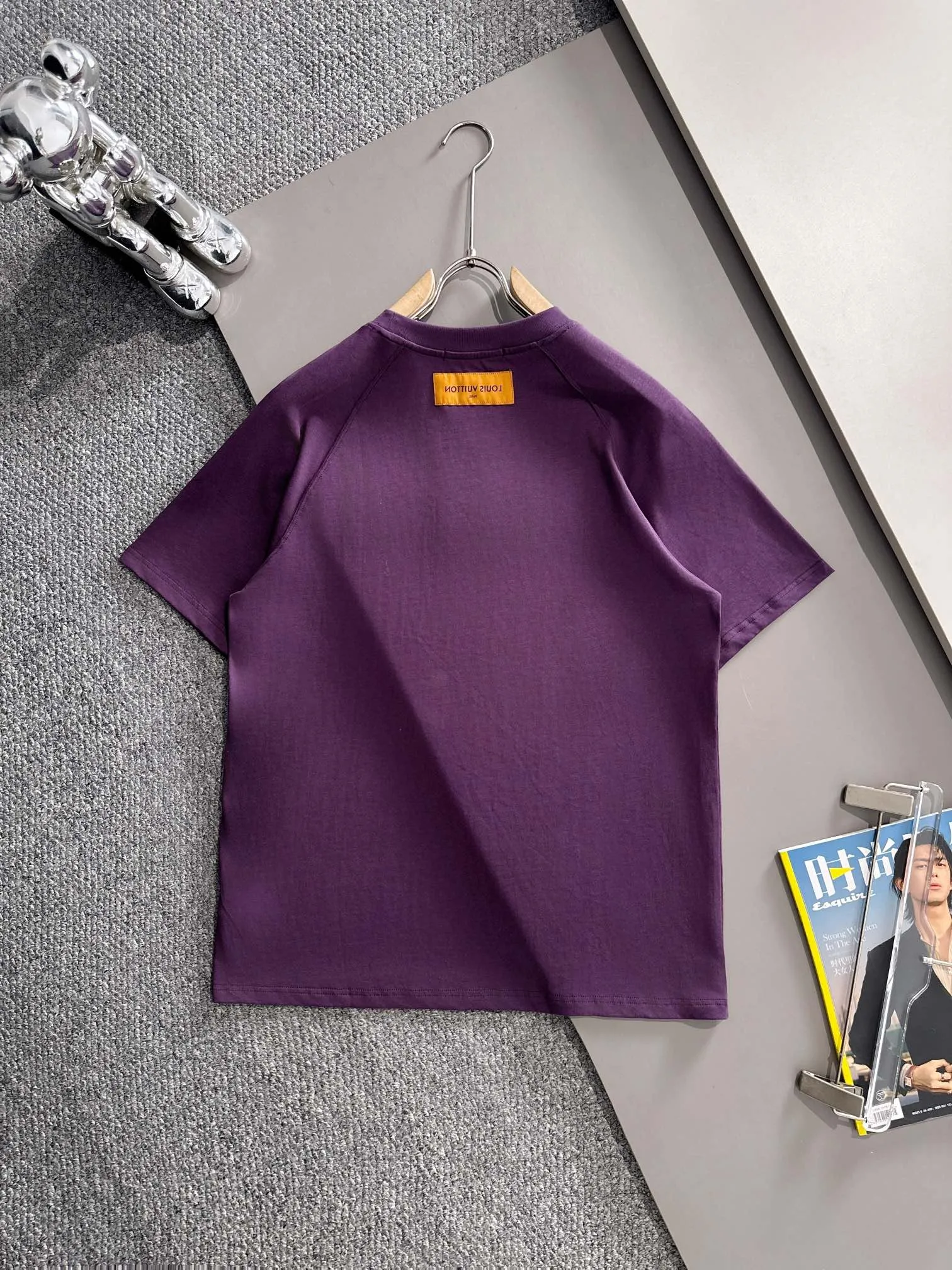 LOUIS VUITTONの2025新作、紫色の半袖Tシャツです。軽奢主義を体現したデザインで、镂空颗粒刺绣ロゴと定制皮章が特徴的。男女兼用で、100%ダブルヤーンコットン素材を使用し、32番手ダブルツイストリブ編みで仕上げられています。シンプルでありながら高級感あふれる一着で、Tシャツ スーパーコピーとしても注目されるスタイルです。