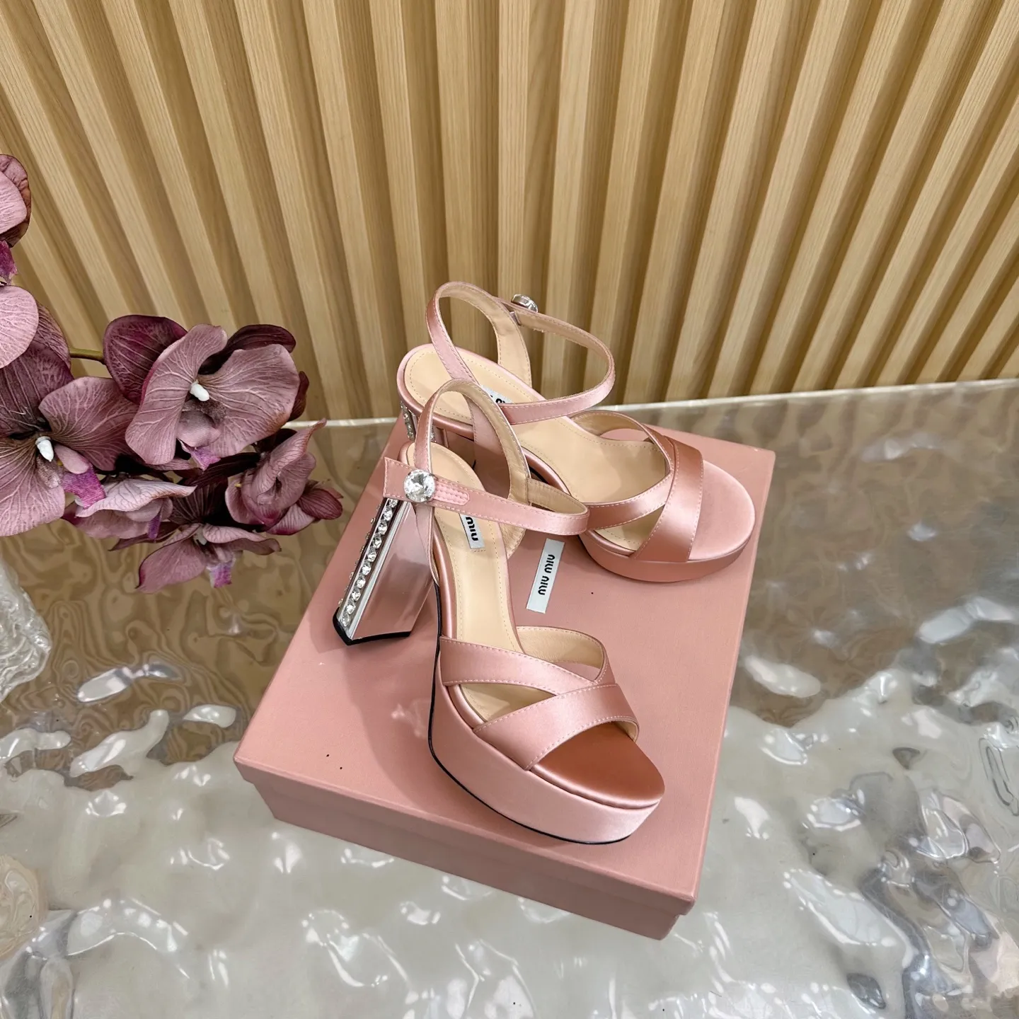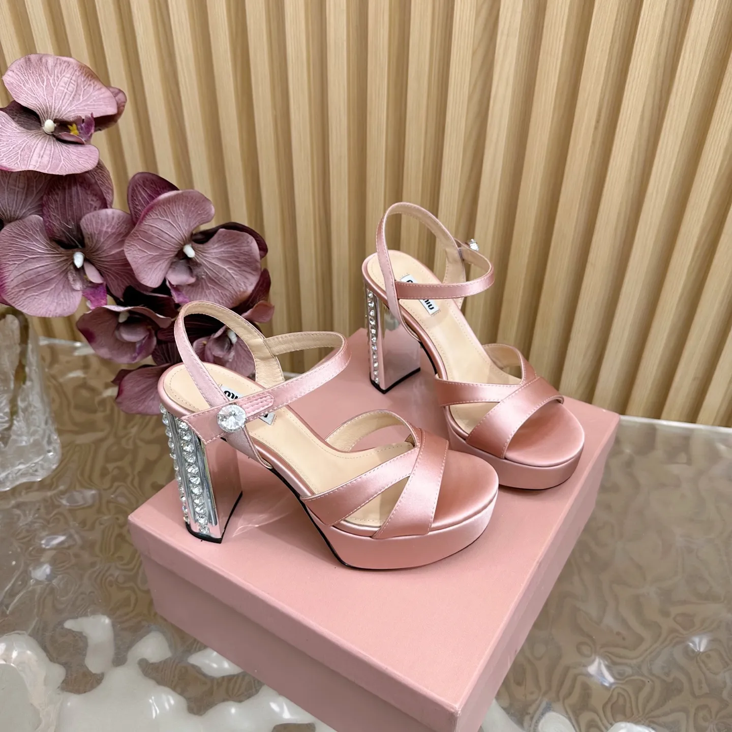 ミウミウの2025年新作ピンクハイヒールサンダル。水プラットフォームデザインが特徴で、足元に優雅さを添えます。オーストリアクリスタルが輝くサイドは夜空の星のように煌めき、防水台設計で長時間の歩行も快適。オリジナル素材と混種羊皮の内裏が高級感を演出し、特別な一足としてスーパーコピーのような魅力を持つデザインに仕上がっています。