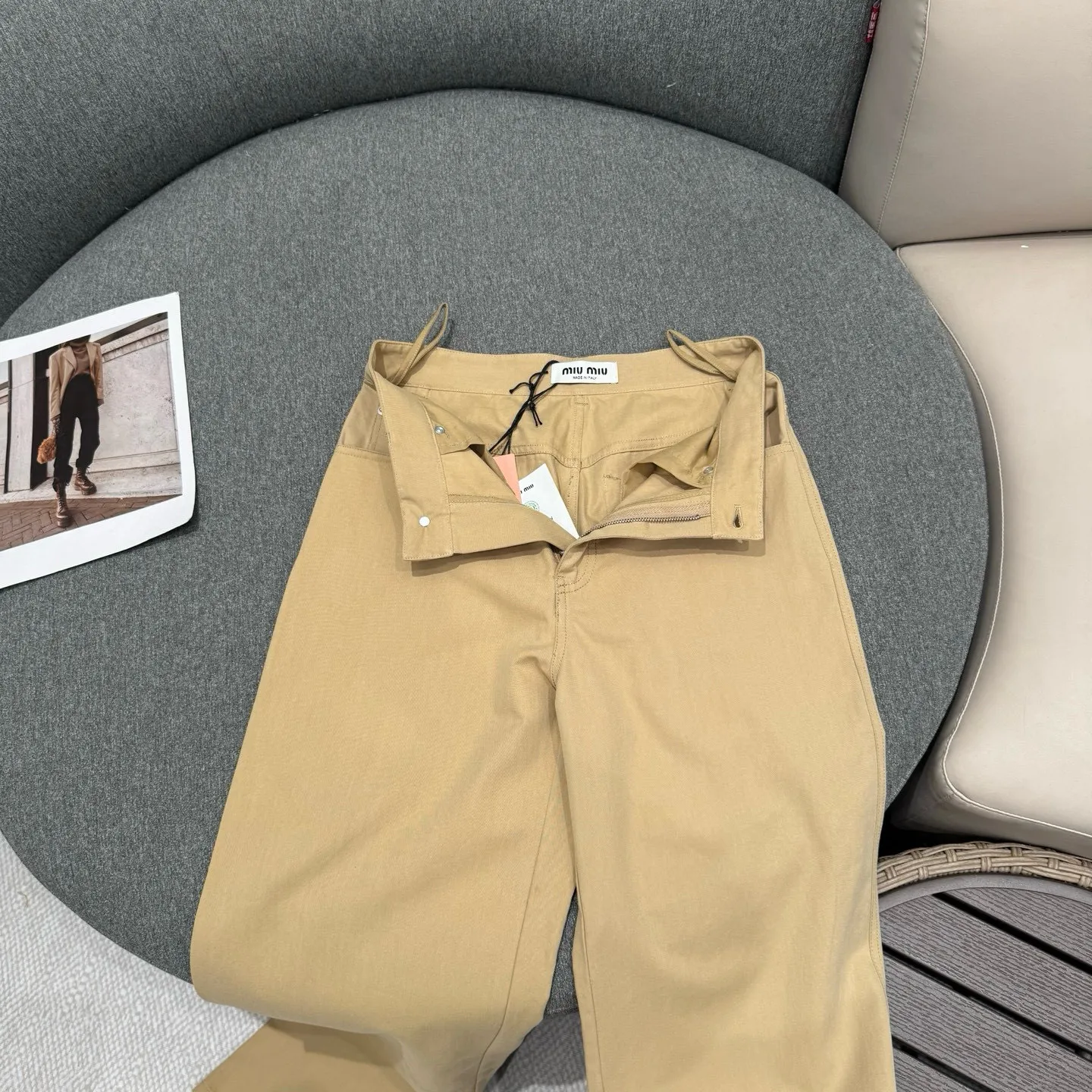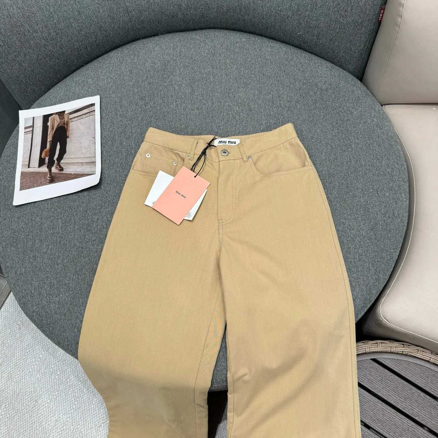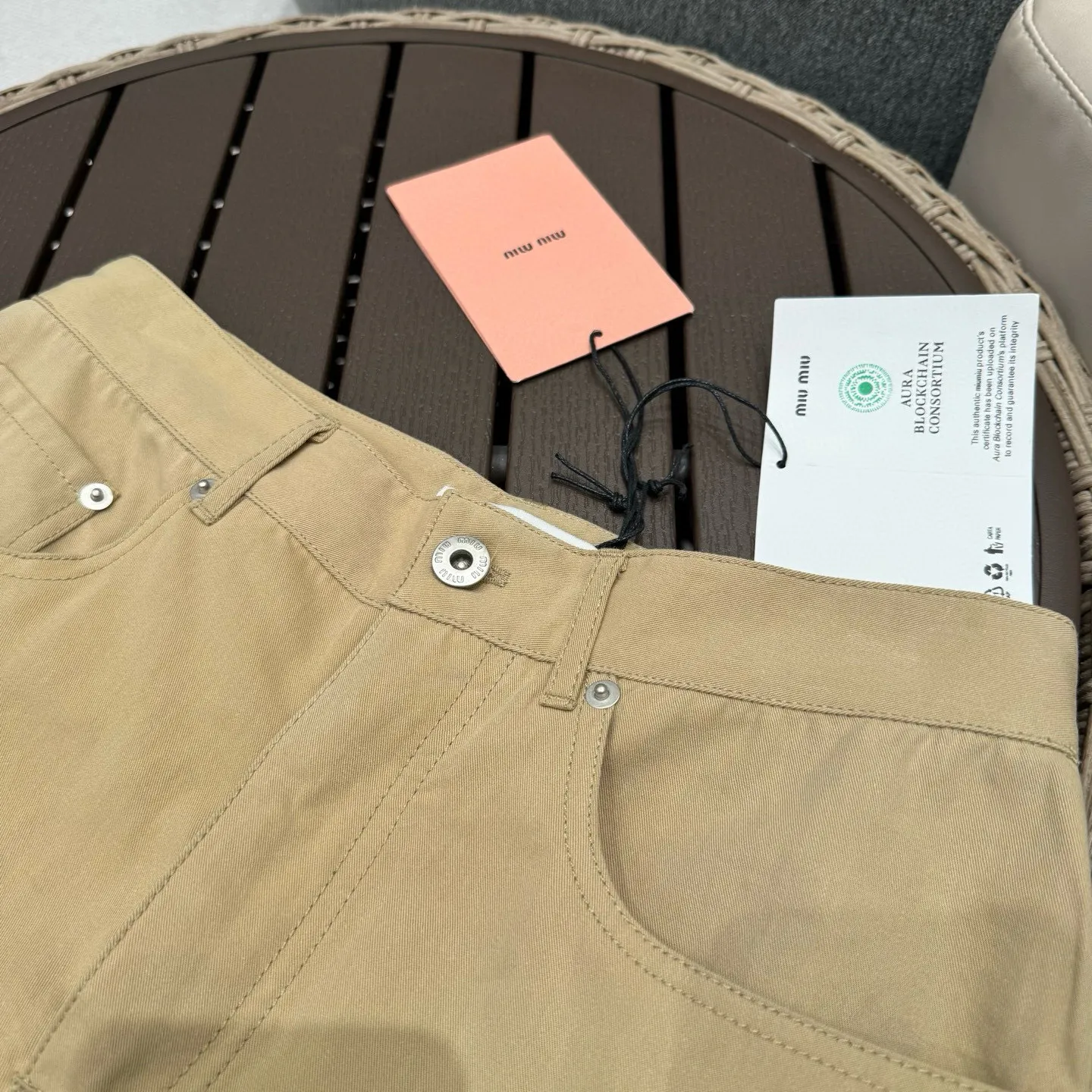 ミウミウの早秋新作、カーキ色の直筒長ズボンです。高品質なコットン素材を使用し、滑らかで型崩れしにくい質感が特徴です。中高ウエストのデザインで、直線シルエットが脚を長く細く見せます。後ろポケットにはレザーロゴパッチが付いており、スタイリッシュなアクセントに。普段使いから通勤まで、様々なシーンで活躍する一品です。類似品に注意しながら、本物を選ぶことが大切です。詳細は偽物に関する情報をご確認ください。