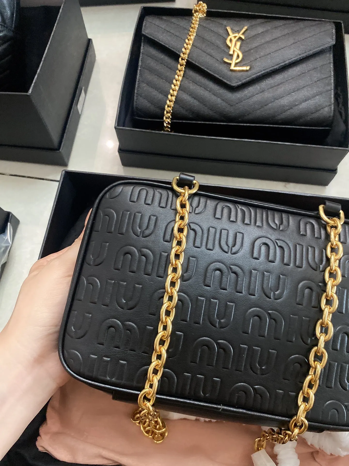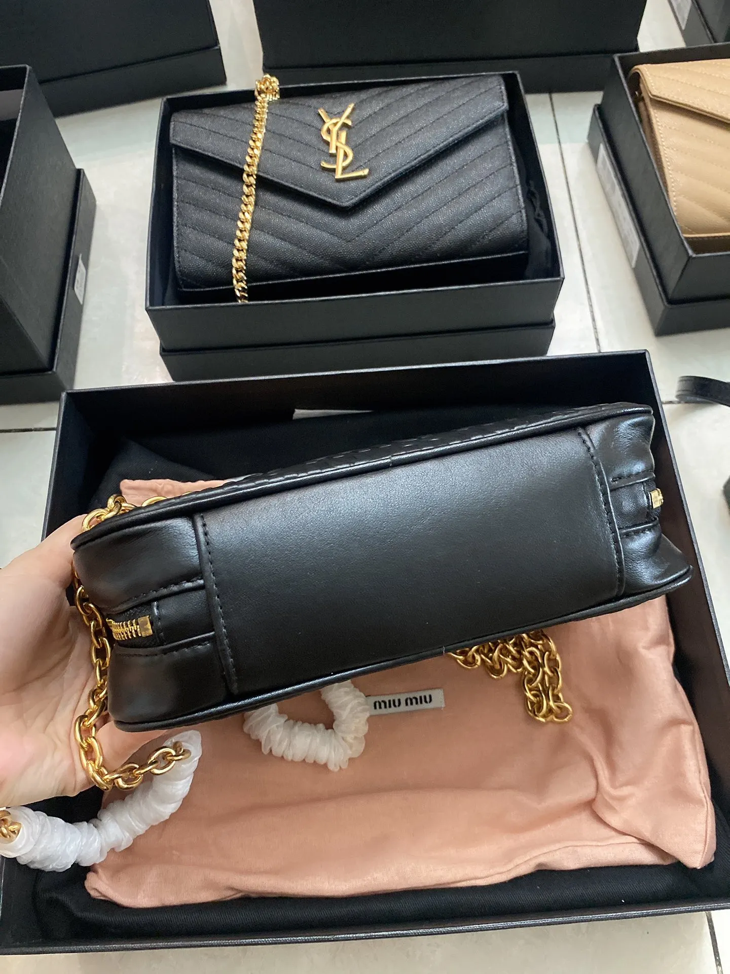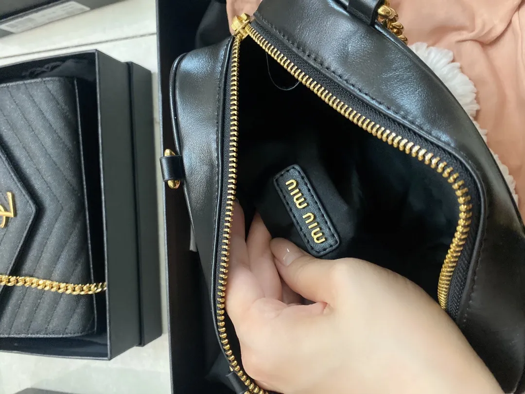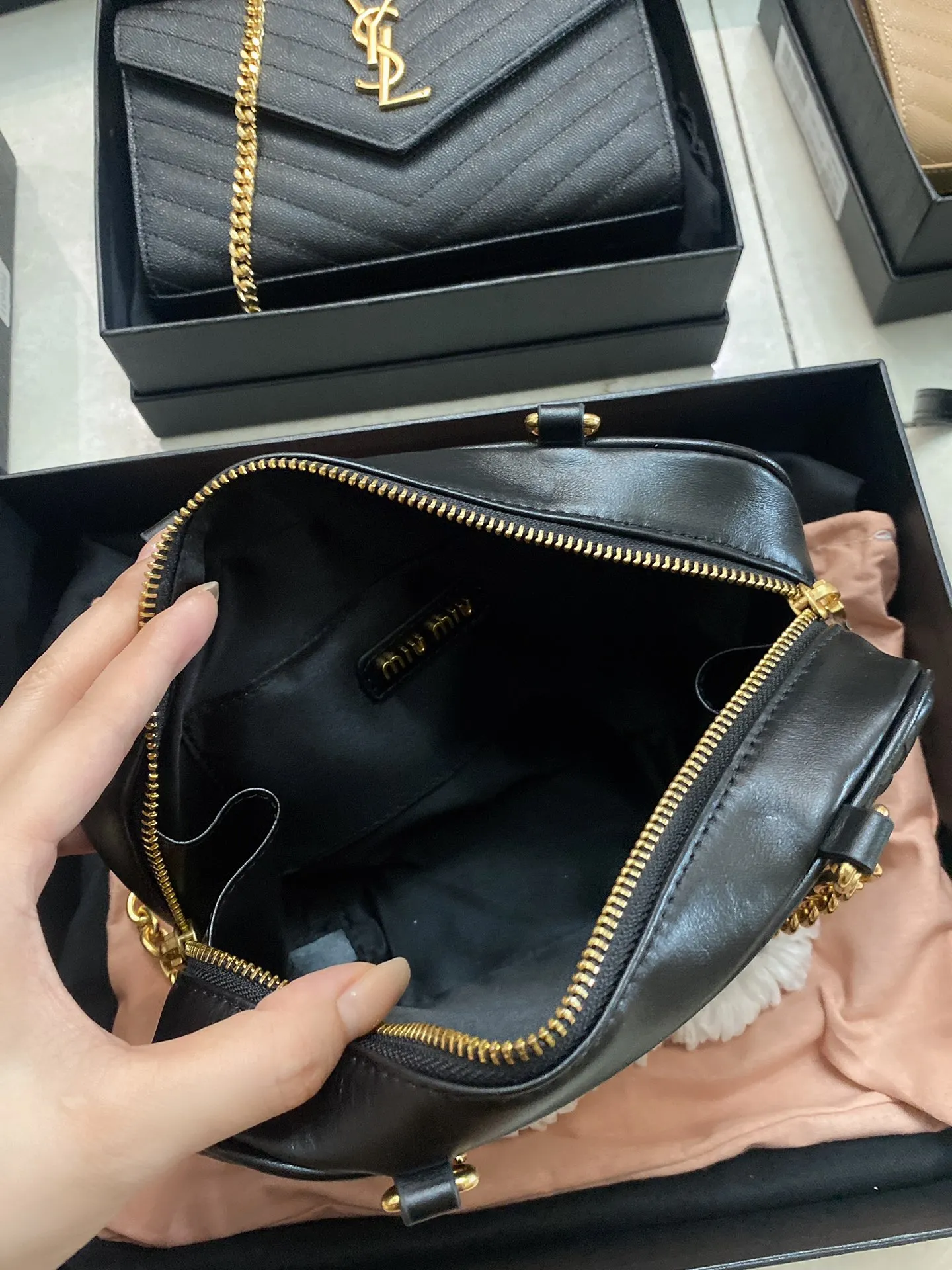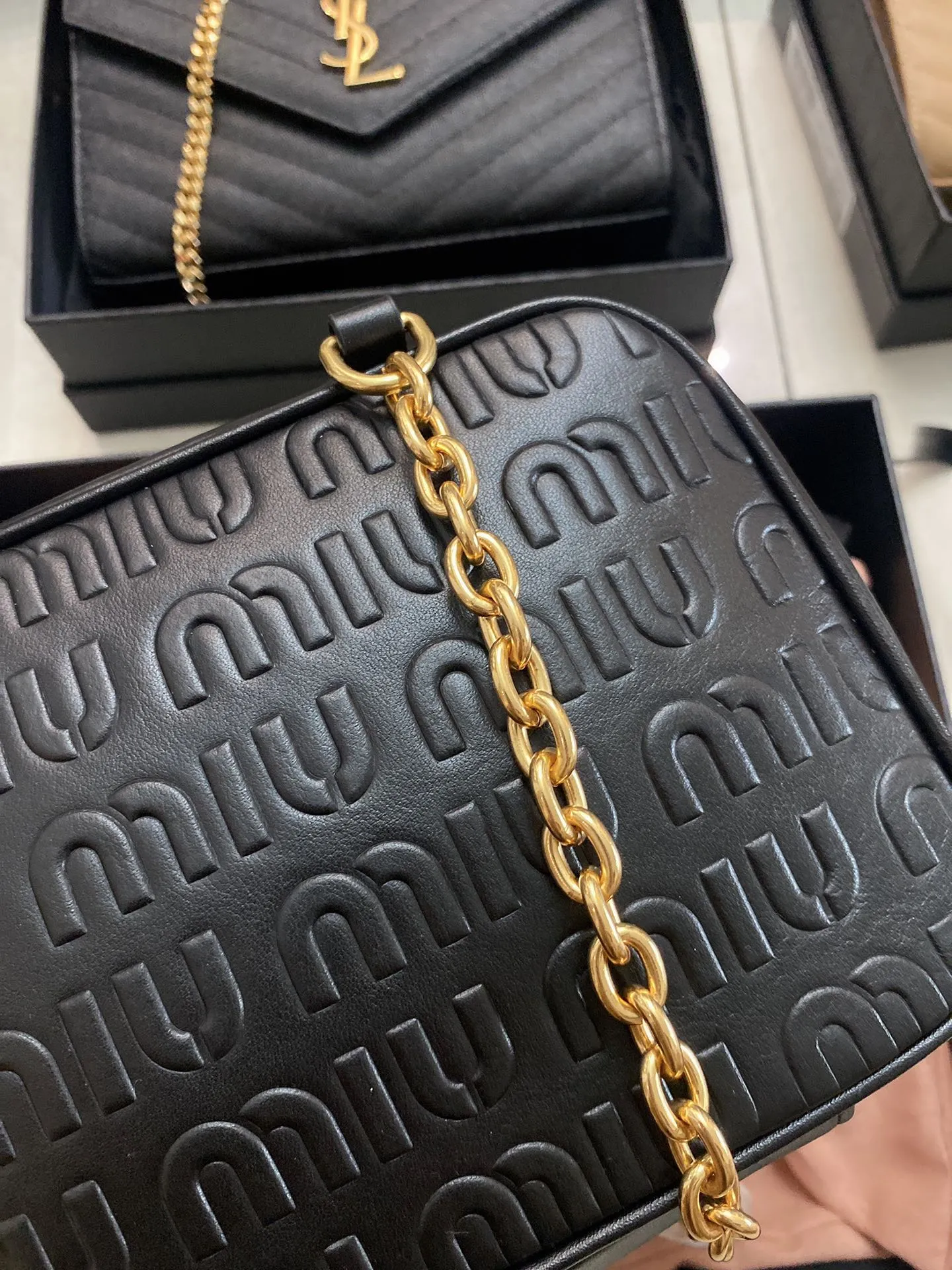 ミウミウの最新款小牛皮カメラバッグです。高品質な黒色の小牛皮を使用し、金色の金具がアクセントになっています。チェーン付きで、肩掛けやクロスボディスタイルで使用可能です。実物を実写した品質で、細部までこだわったデザインが魅力です。このようなN級品のクオリティを求める方にもおすすめです。サイズは約20cm x 12cm x 6cmで、コンパクトながらも機能的です。