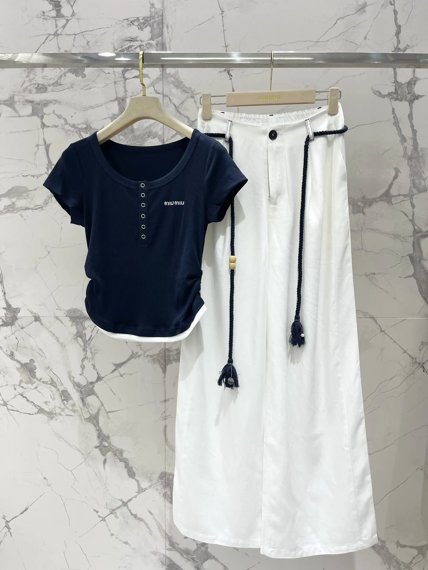 MIUMIUの新作セットは、刺繍が施されたコットン半袖Tシャツと天絲デニムワイドパンツの組み合わせです。Tシャツは肌触りが良く、夏でも快適に着用できます。ワイドパンツは涼しく、スタイルアップ効果があり、デートやショッピングに最適です。シンプルな靴と合わせて、東京の街をおしゃれに歩きましょう。このようなおしゃれな Tシャツ スーパーコピー スタイルをぜひチェックしてみてください。