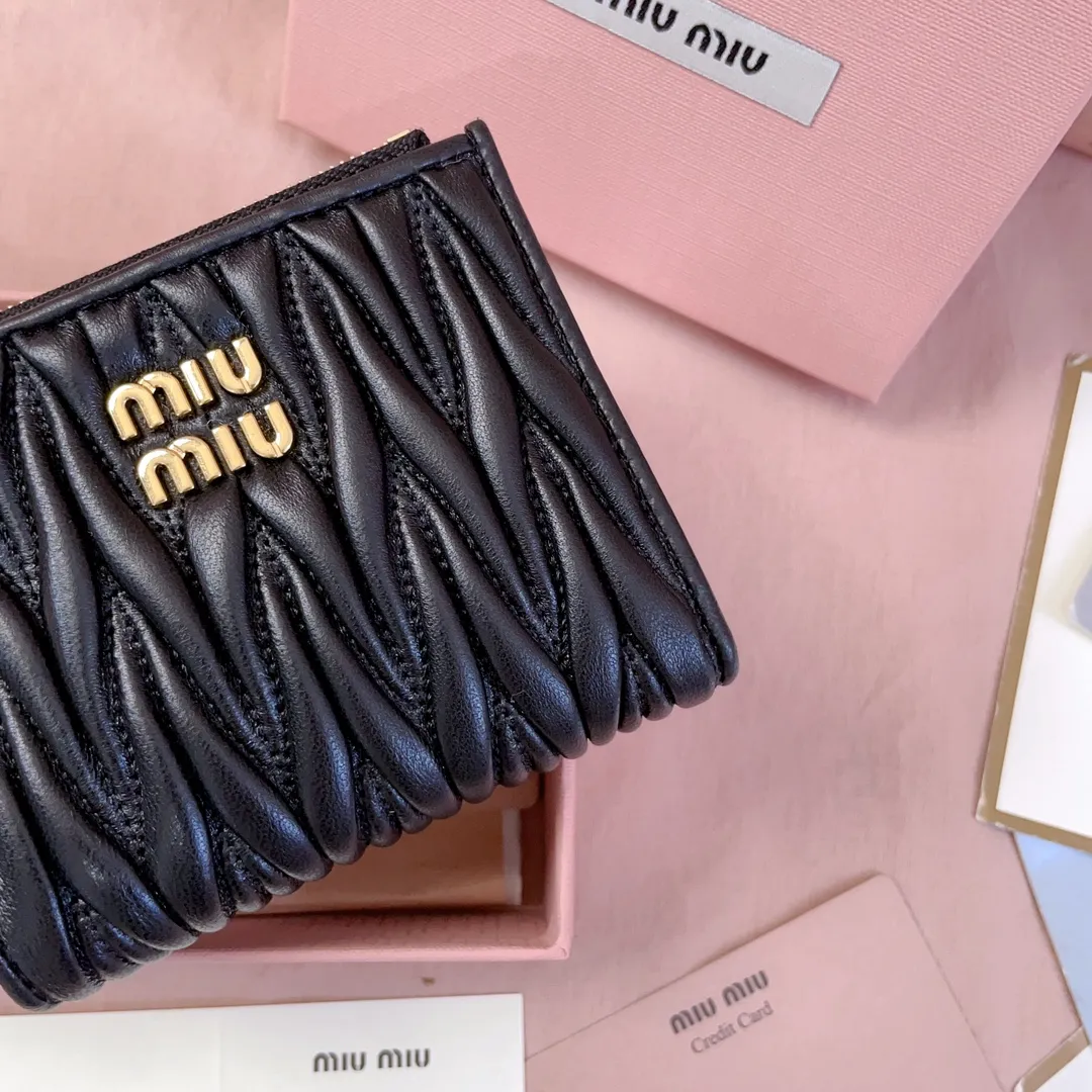 ミュウミュウ ポケットウォレット 5MV017 のご紹介です。高級輸入ラムスキンを使用した、高級感あふれるブラックレザーウォレットです。スタイリッシュな二つ折りデザインは、ダブルファスナーコンパートメントと複数のカードスロットを備え、必需品をたっぷり収納できます。11.5 x 8 cmのコンパクトさと機能性を兼ね備え、普段使いに最適です。このエレガントで実用的なウォレットで、あなたのアクセサリーセンスをワンランクアップさせましょう。特別なアイテムをお探しの方には、財布 スーパー コピーのクオリティもおすすめです。