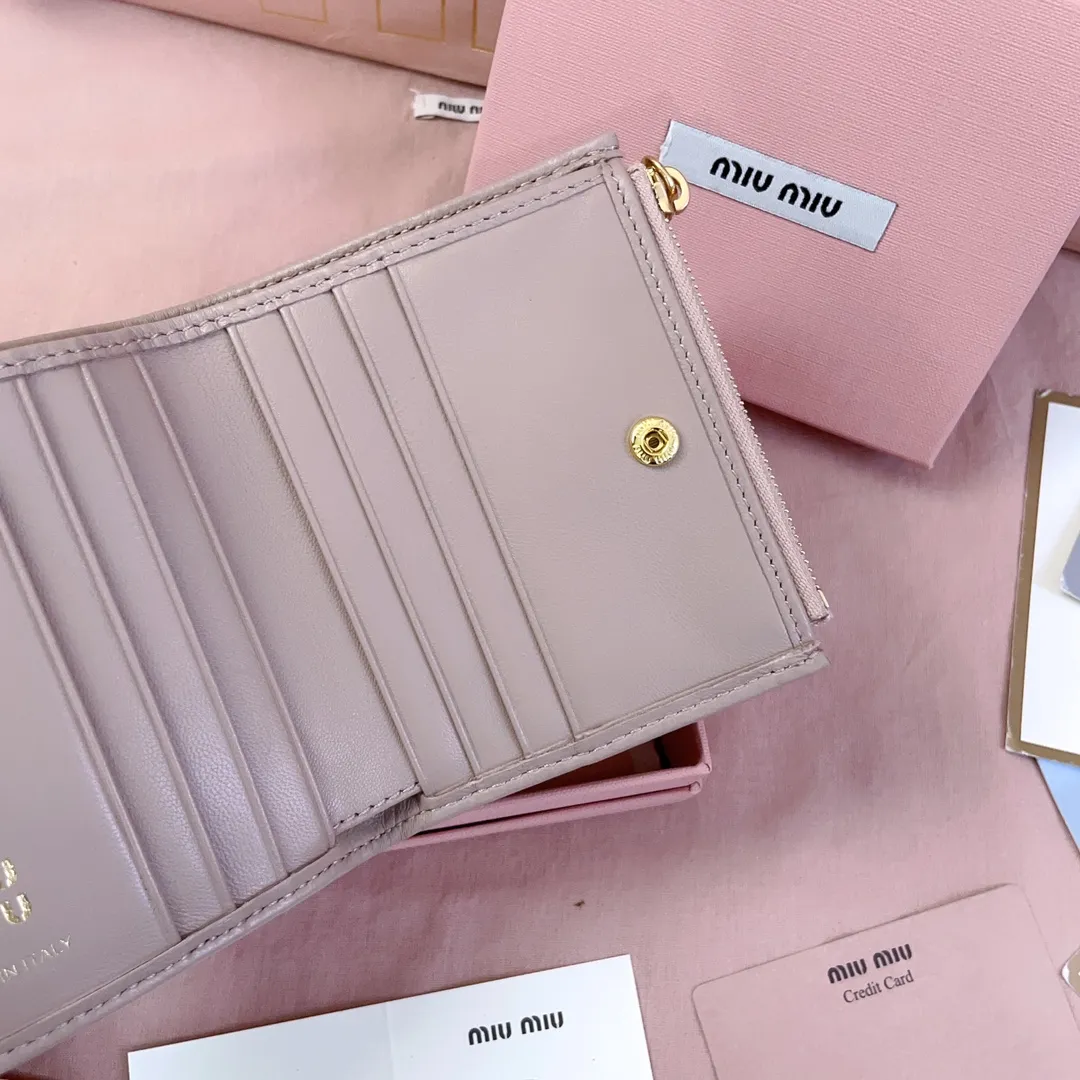 ライトピンク マトラッセのミュウミュウ ポケットウォレット 5MV017 をご紹介します。高級輸入ラムスキンレザーを使用した、ラグジュアリーな二つ折り財布です。このスタイリッシュなアクセサリーは、ダブルファスナーコンパートメントと複数のカードスロットを備え、必需品をたっぷり収納できます。サイズは11.5 x 8 cmで、コンパクトでありながら機能的で、普段使いに最適です。最高品質のアイテムをお探しの方には、財布 スーパー コピーとしておすすめの逸品です。
